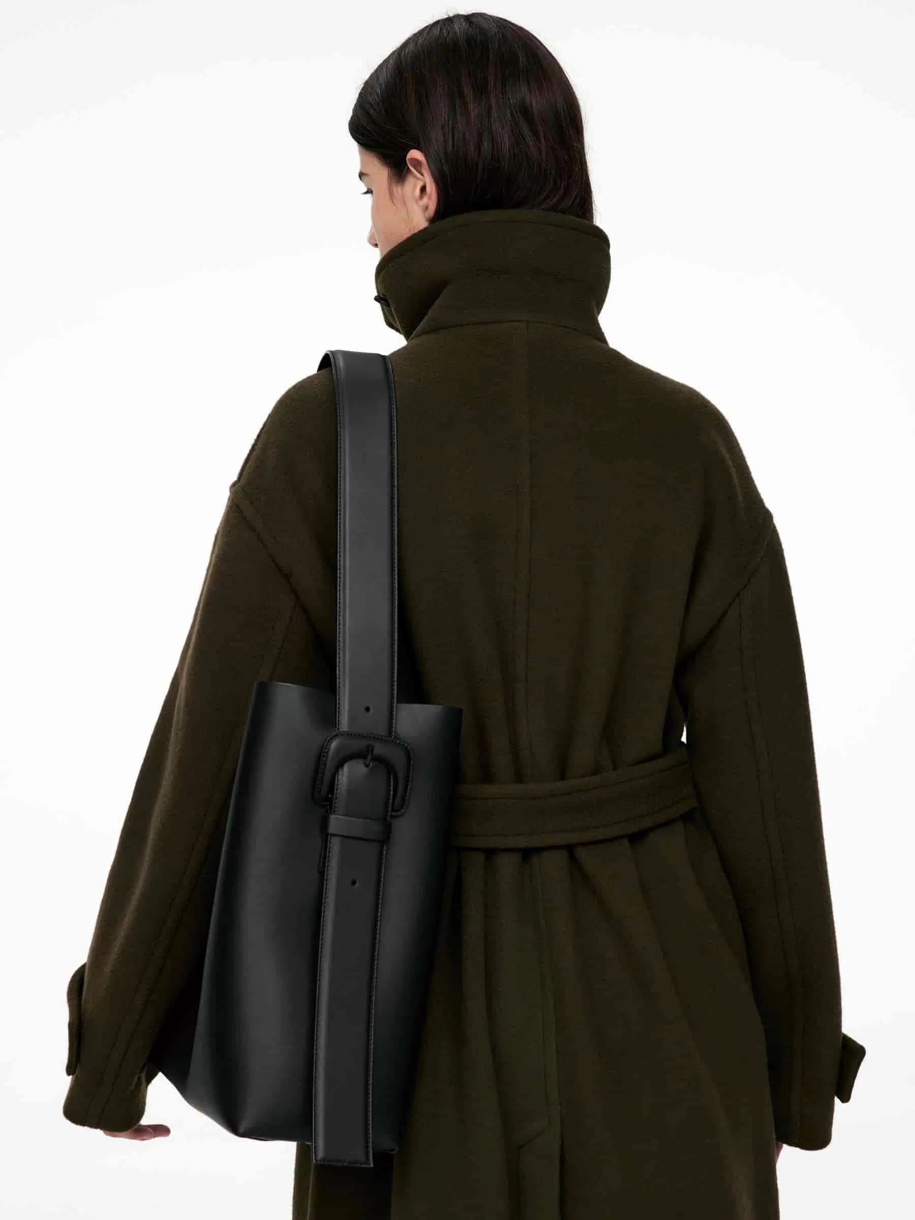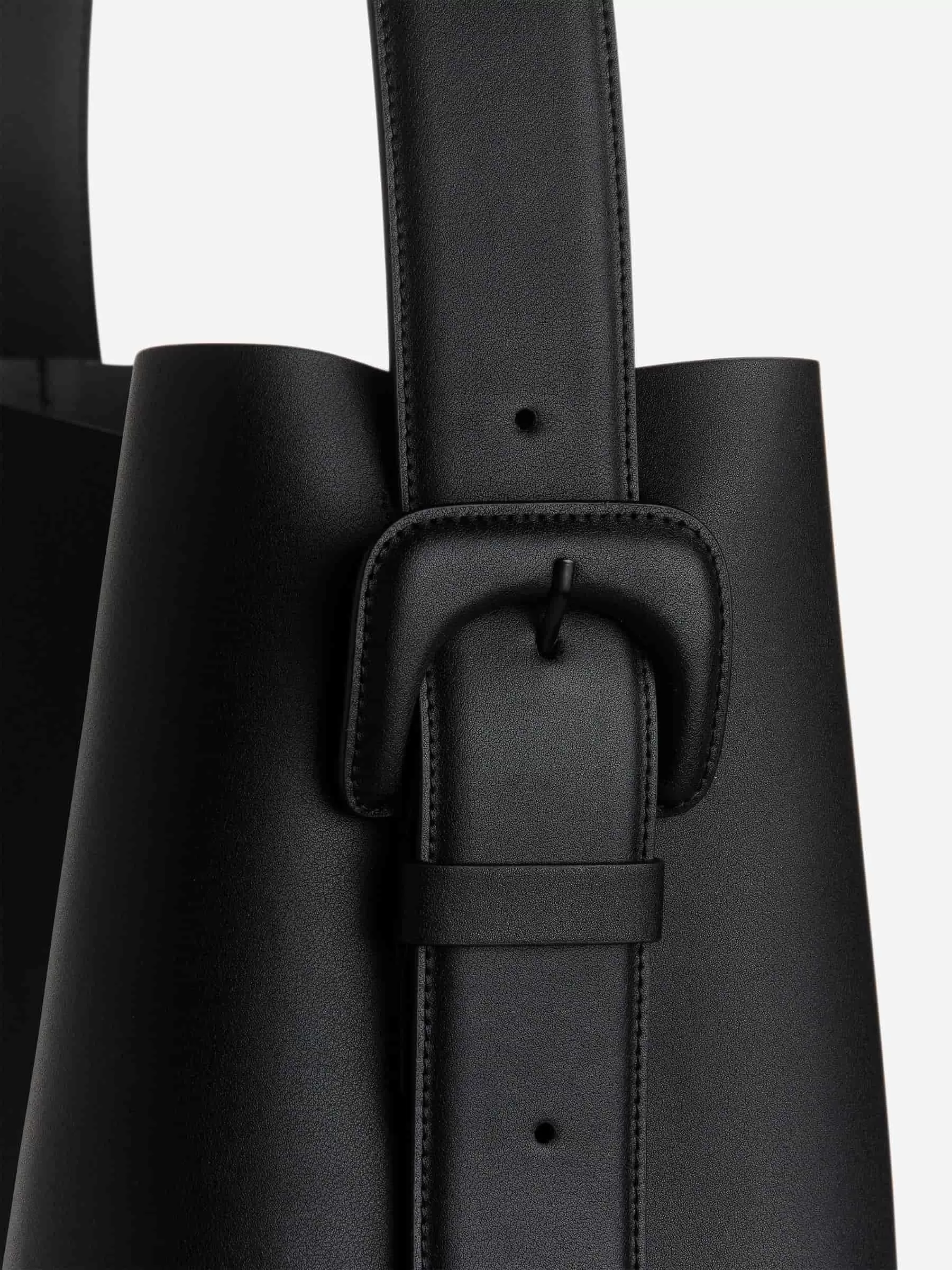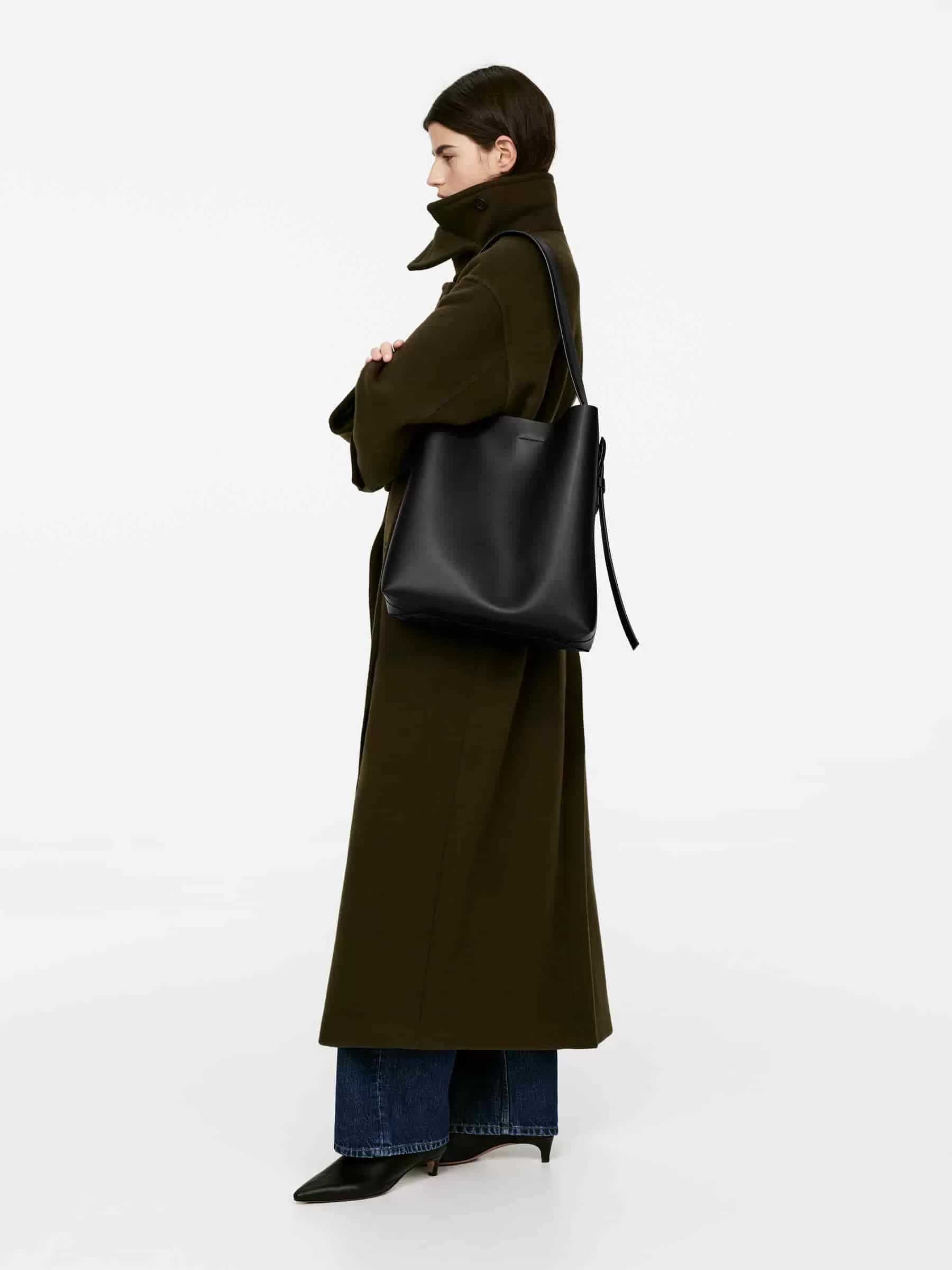 Bolso tote con tacto semirrígido y lo suficientemente espacioso como para albergar un portátil. Diseñado con una correa para el hombro ajustable de cinco centímetros de ancho y cierre magnético. Compartimento interior con cierre de cremallera. Dimensiones 35 cm x 32 cm x 13 cm.