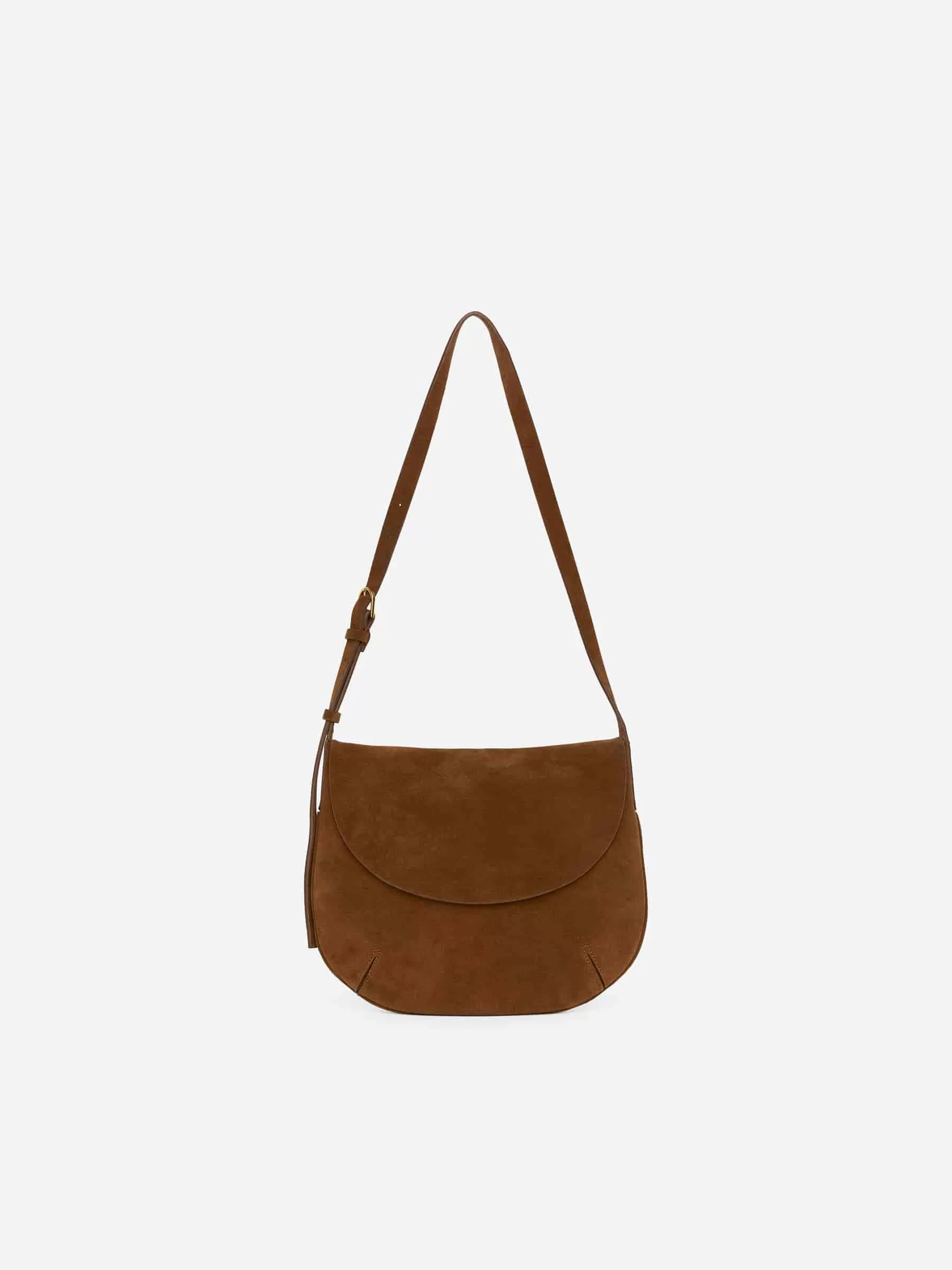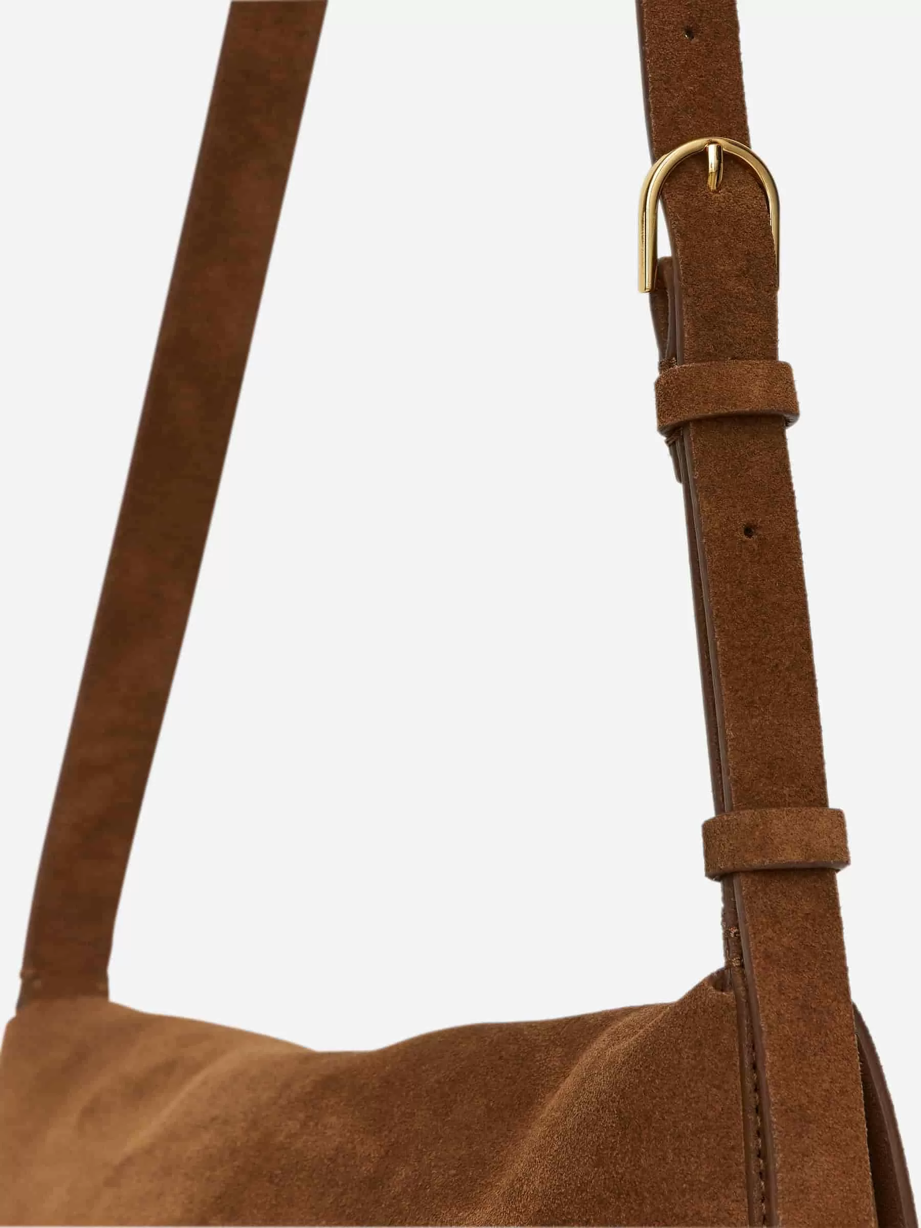Bandolera confeccionada en ante sin cromo. Presenta una pestaña con cierre magnético y un bolsillo interno. Correa ajustable con múltiples agujeros. Ancho 31 cm, alto 25,5 cm. Caída de la correa 40 cm (cuando se abrocha en el agujero central).
