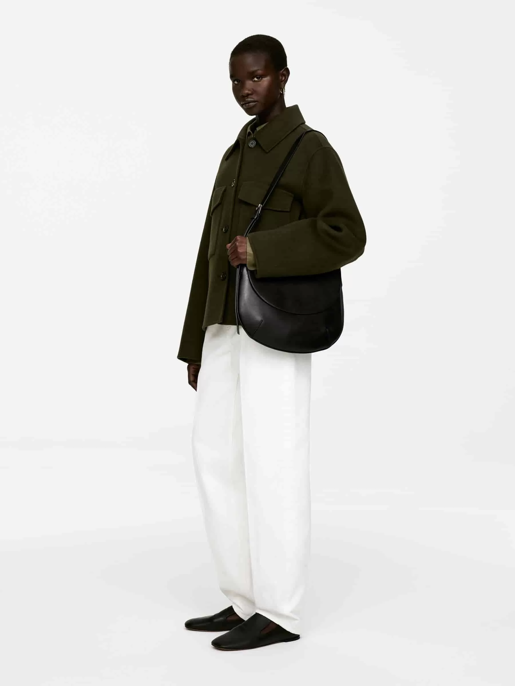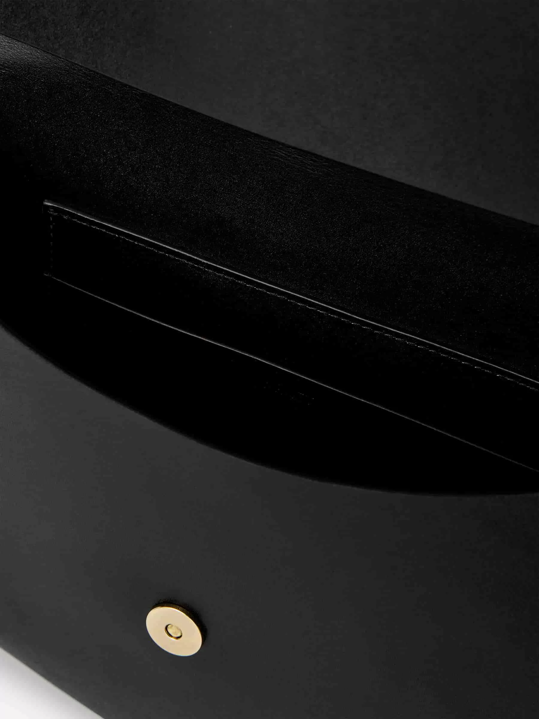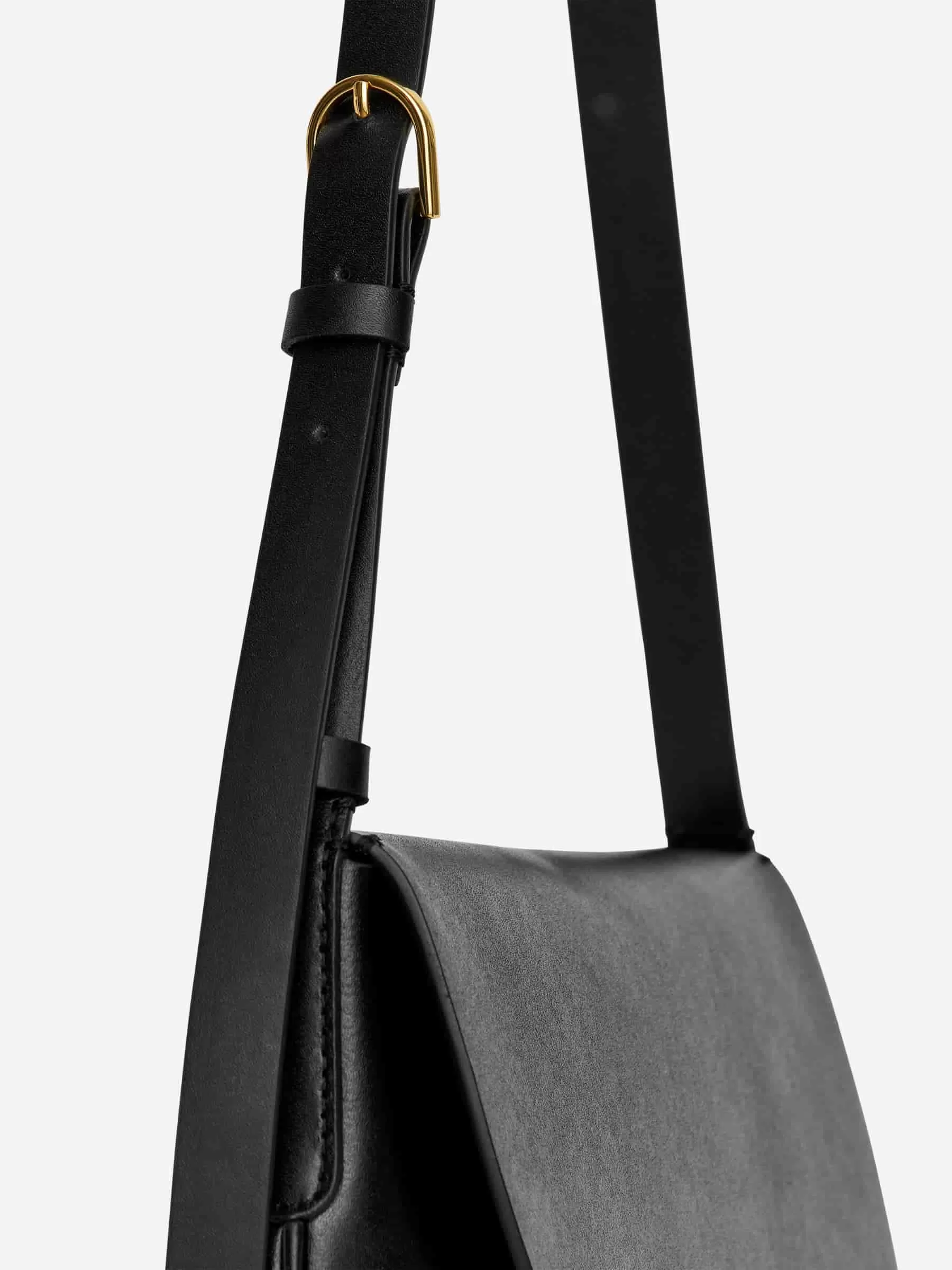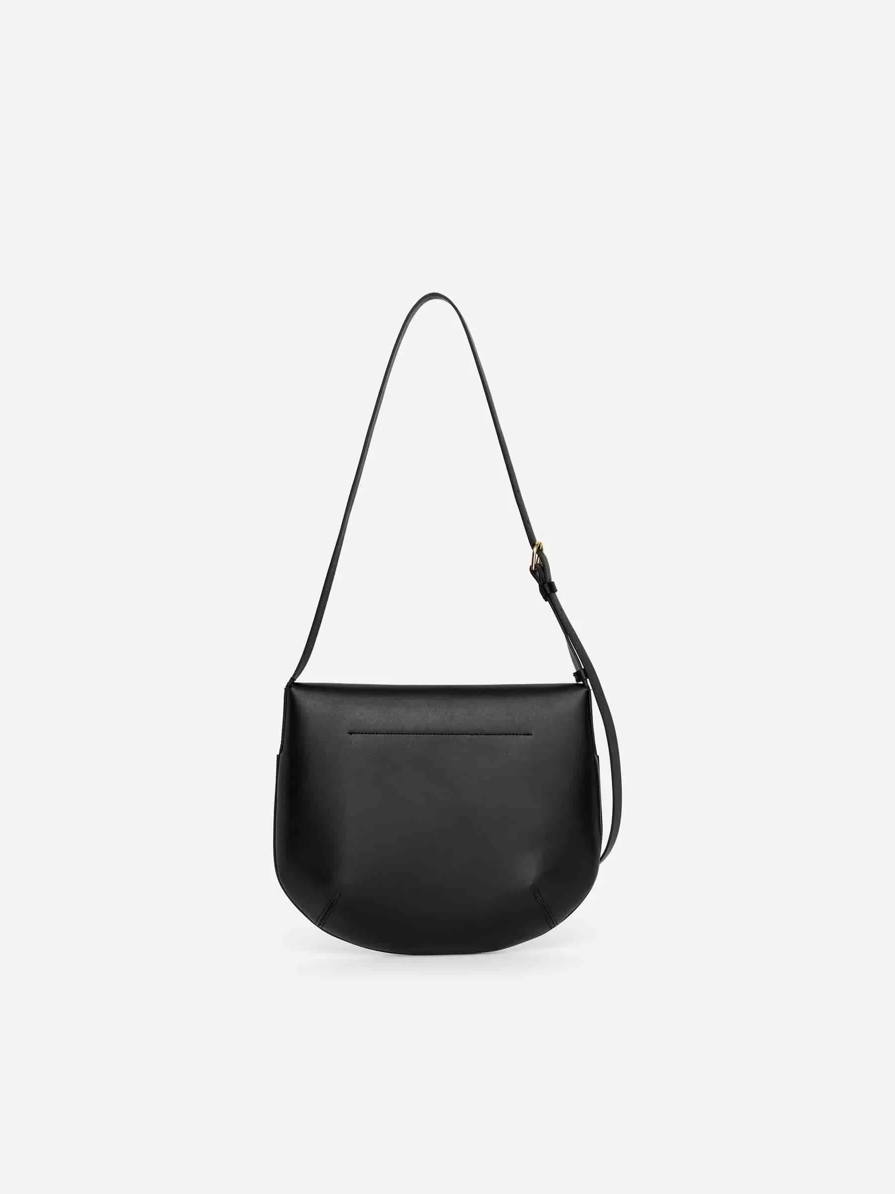 Bandolera de piel con solapa y cierre de imán. Ribetes bañados en oro y bolsillo interior. Ancho 30,8 cm, alto 25,3 cm. Caída de la correa 40 cm (cuando se abrocha en el agujero central).