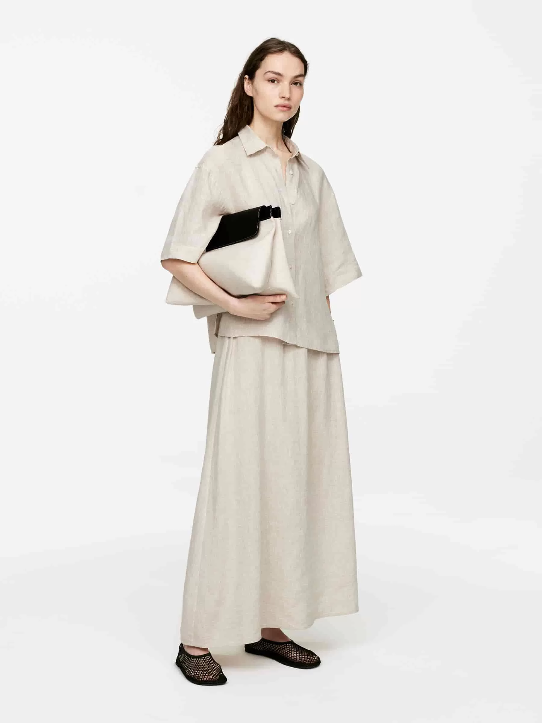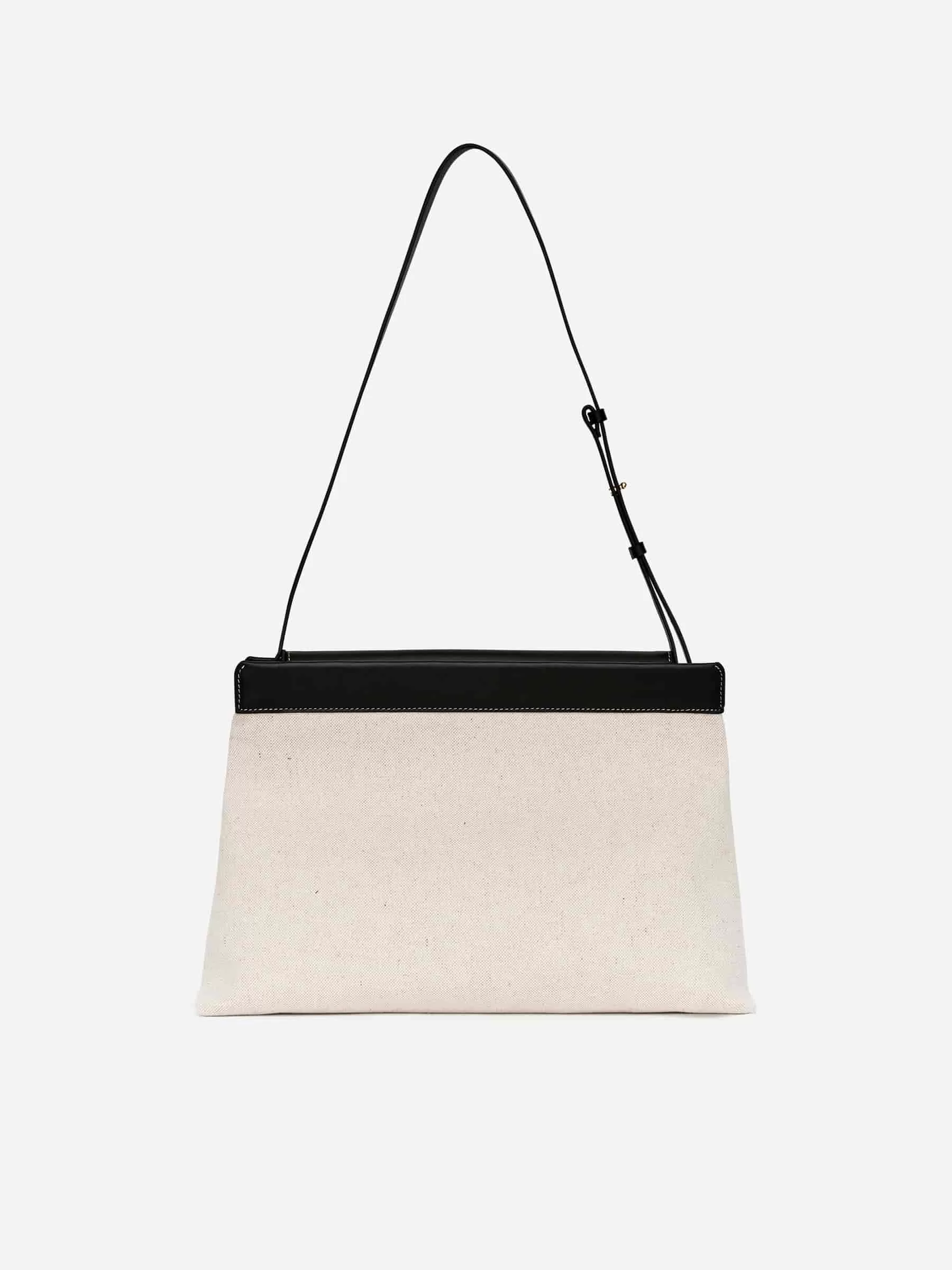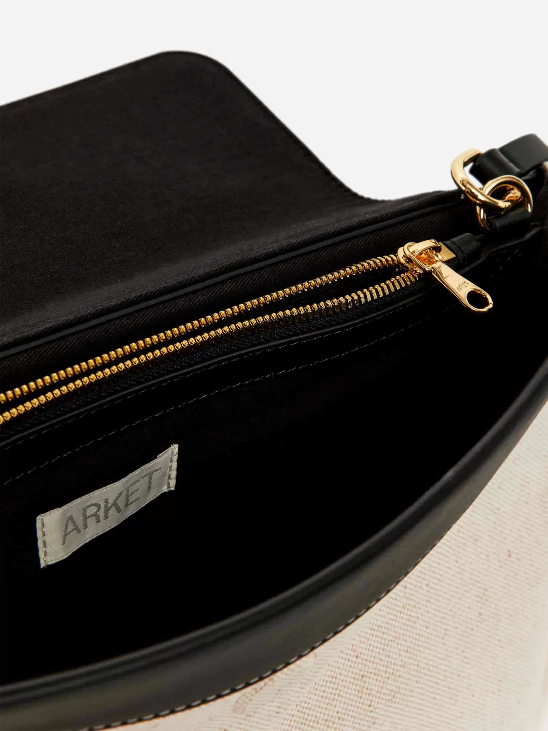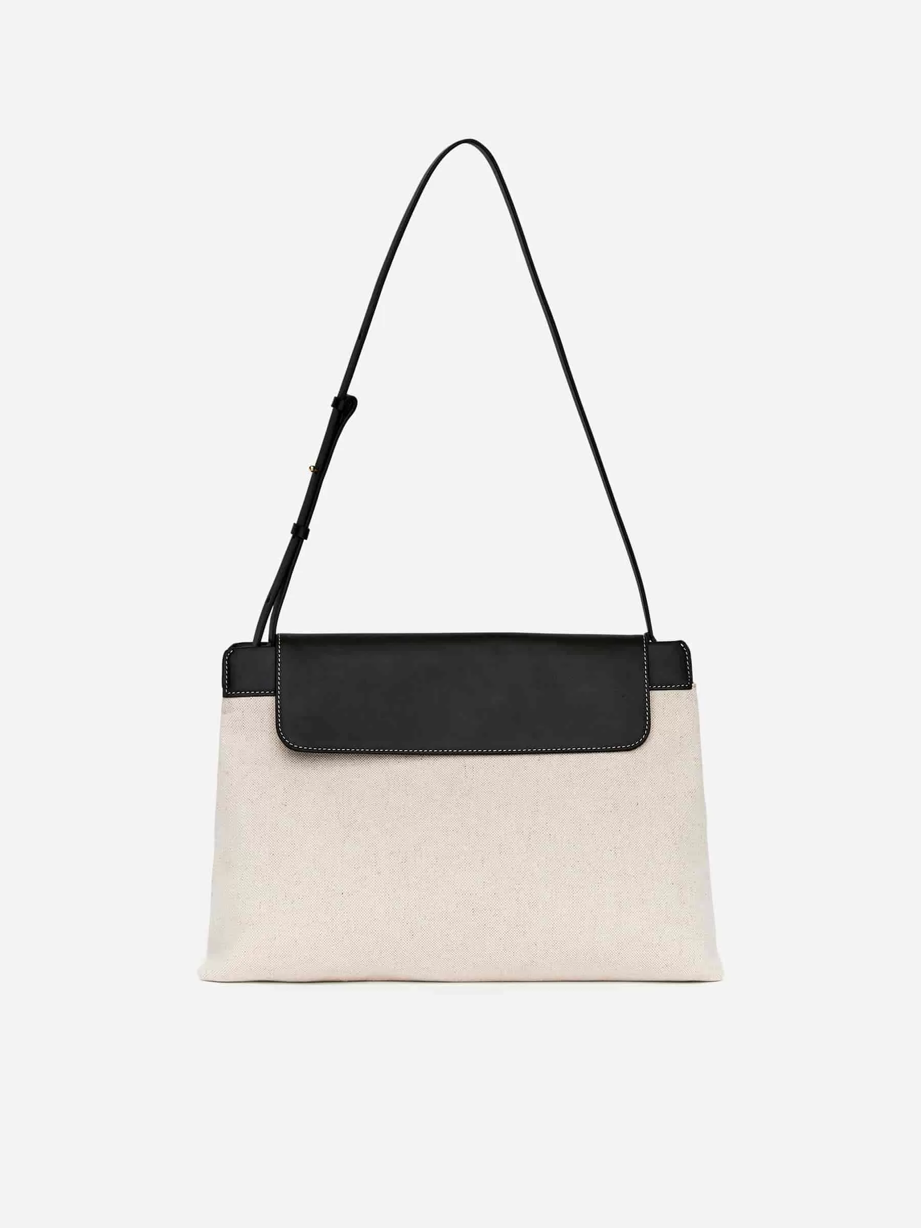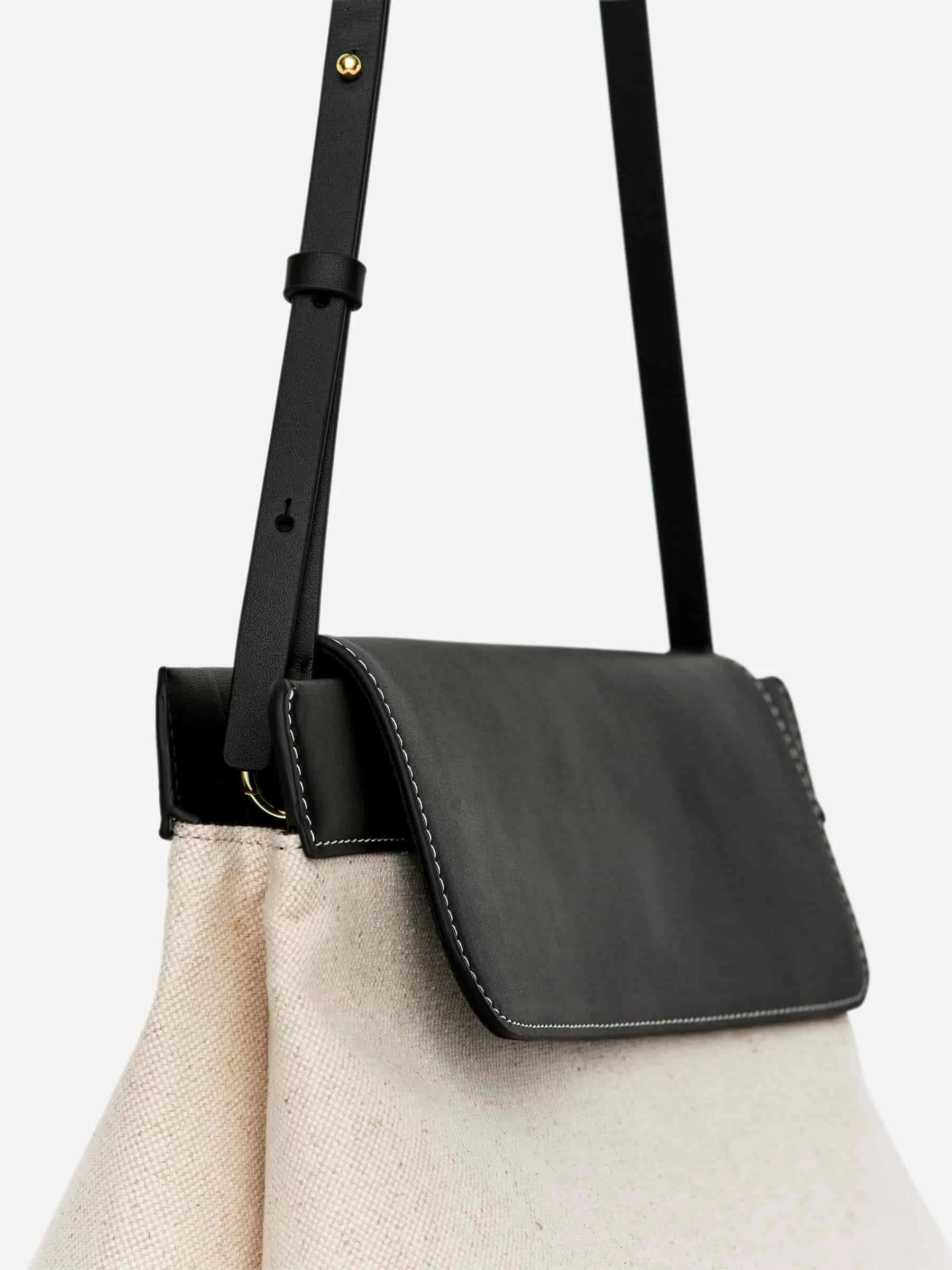 Bandolera confeccionada en lona de algodón-lino y piel. Detallado con compartimentos dobles, un bolsillo interior y una correa para el hombro ajustable. Ancho 39 cm, alto 25,5 cm, fondo 13 cm. Caída de la correa 37 cm.