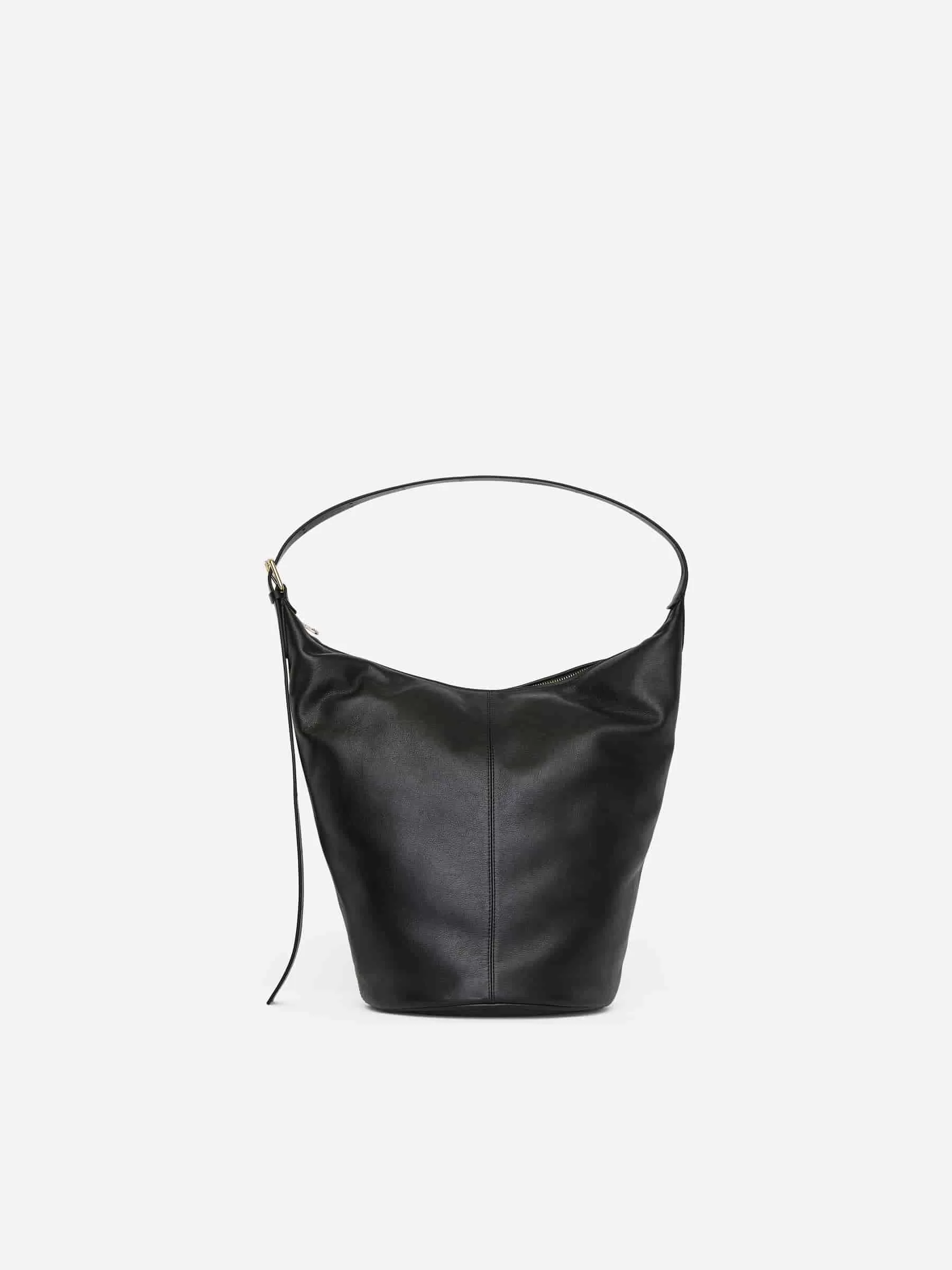 Bolso bombonera de piel con costuras verticales decorativas. Cierre de doble punta con orificios a lo largo de toda la correa para mayor ajuste. Cierre con cremallera y bolsillo con cremallera en el interior. Diámetro inferior 22 cm, altura 34 cm.
