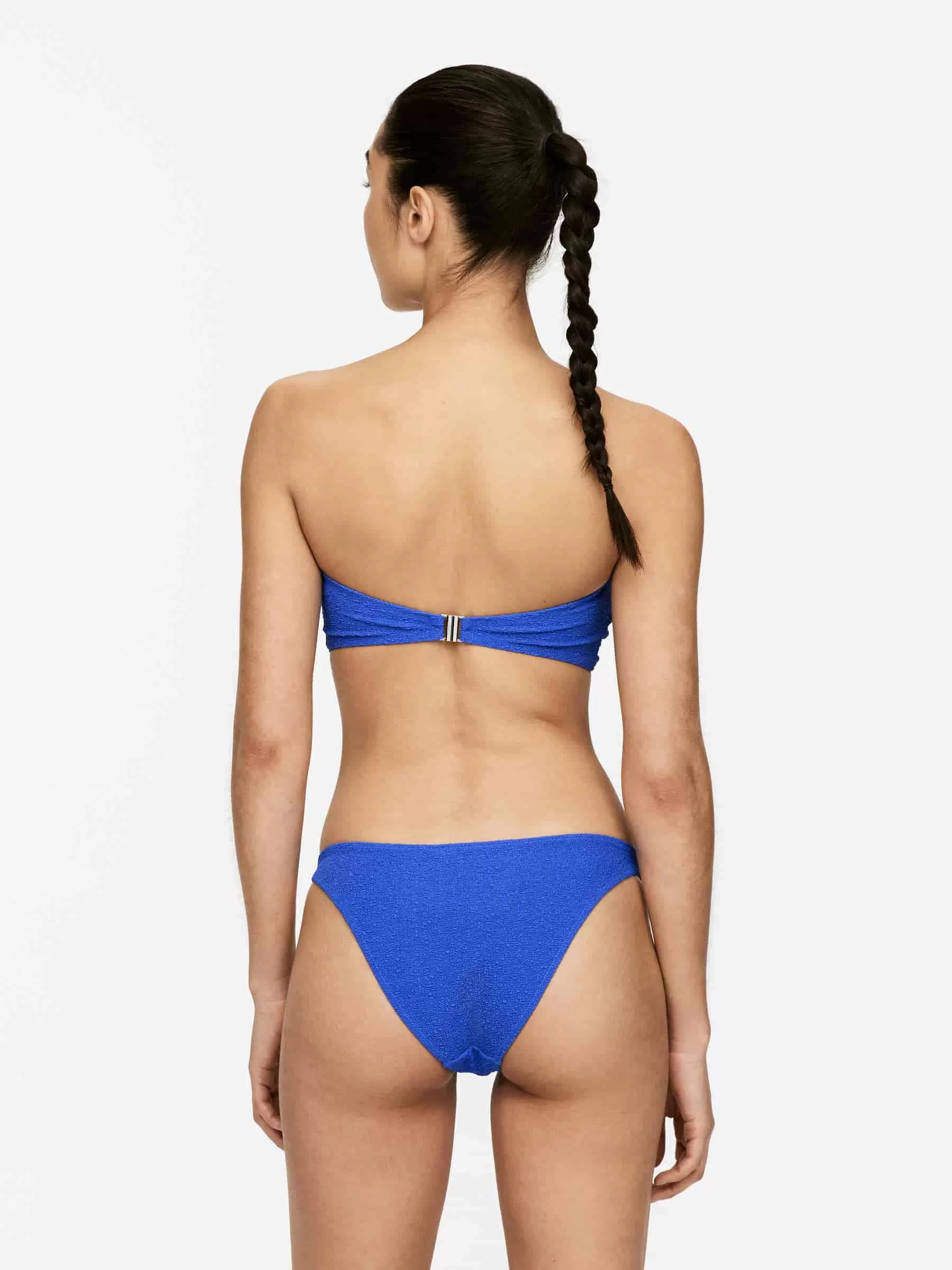 Braguita bikini de textura estructurada y elástica. Este es un estilo de cintura alta inspirado en los años 90 con abertura alta en las piernas. Forrado al frente.