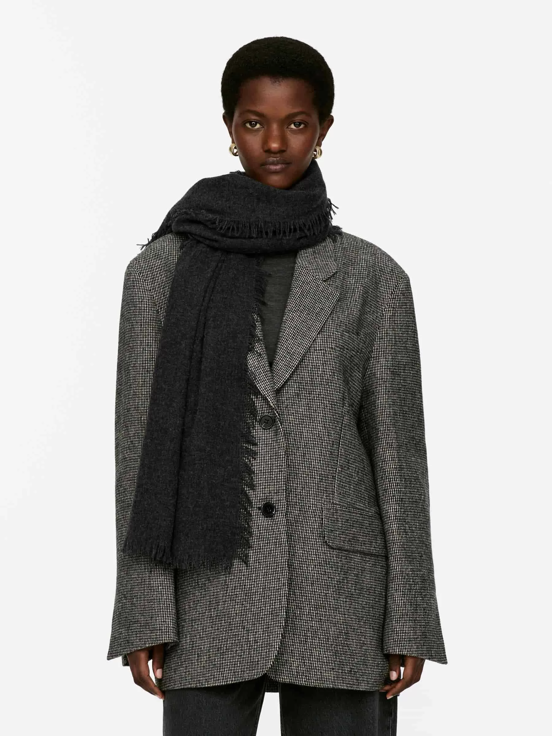 Bufanda en tejido suelto confeccionado con lana. Detallado con bordes deshilachados. Medidas 170cm x 70cm. Esta bufanda contiene 100% lana RWS, certificada por el sindicato de control 877004. Los productos certificados según el Estándar de lana responsable (RWS) contienen fibra de lana de granjas certificadas independientemente según los requisitos de bienestar animal y gestión de la tierra.