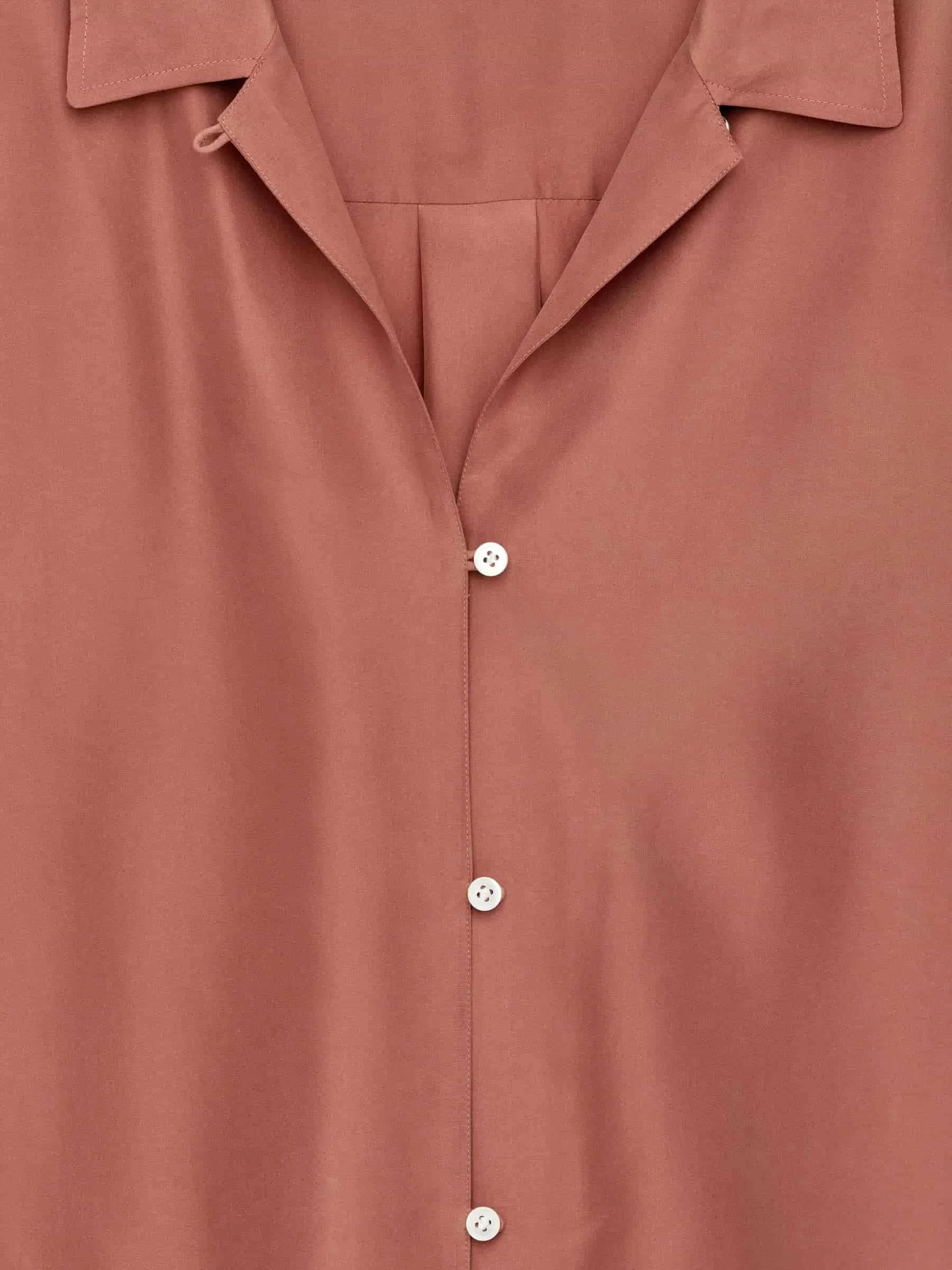 Camisa de pijama confeccionada en seda. Diseñado con cuello resort, mangas tres cuartos y cierre de botones.