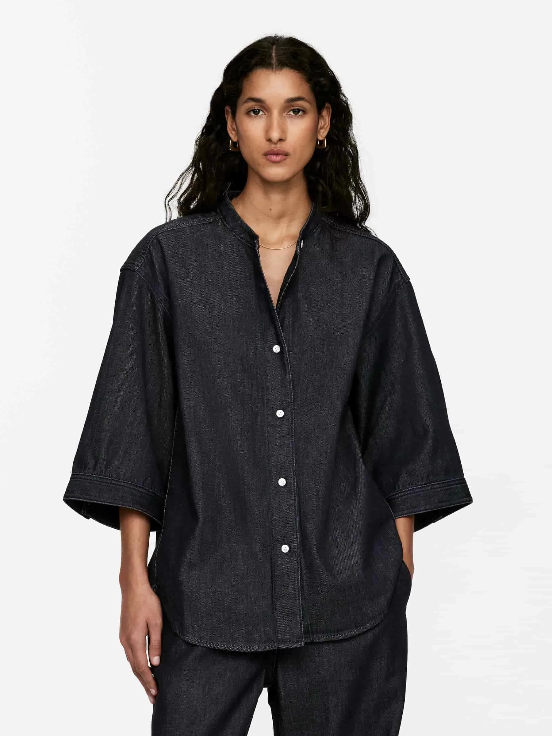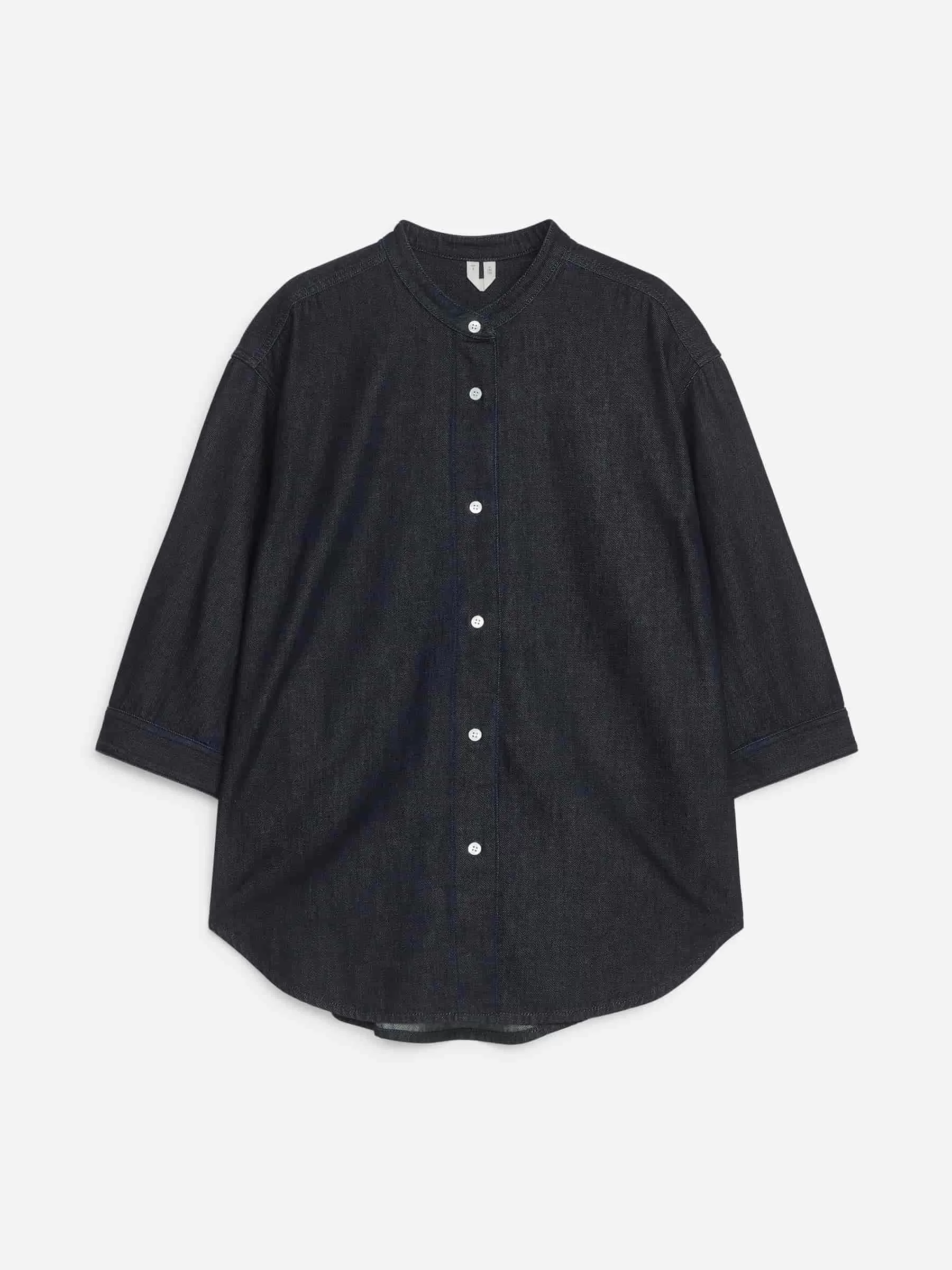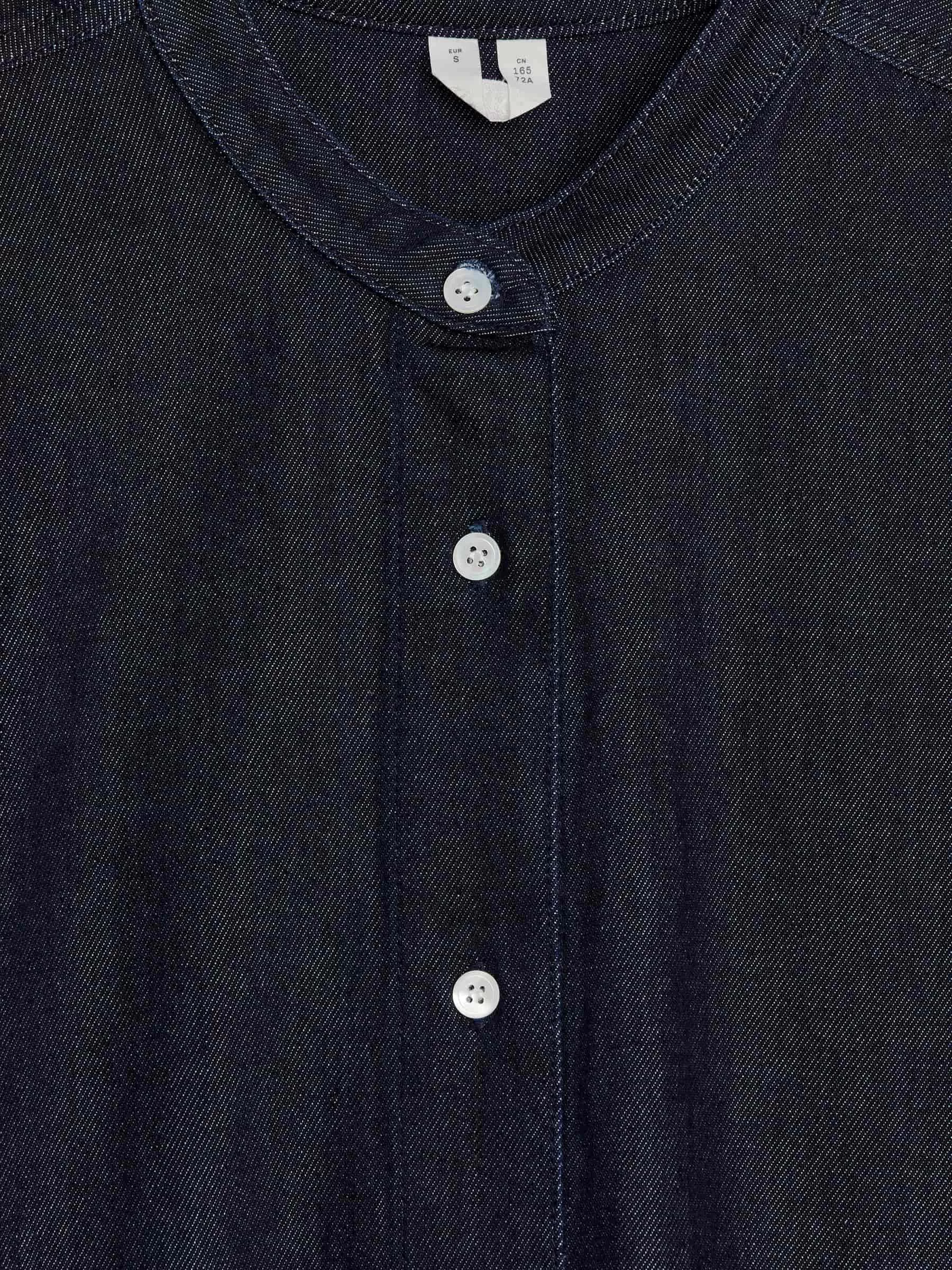 Camisa denim crudo confeccionada a partir de una mezcla de algodón y lyocell. Un modelo sin cuello, manga tres cuartos y puños abotonados. Ajuste regular.