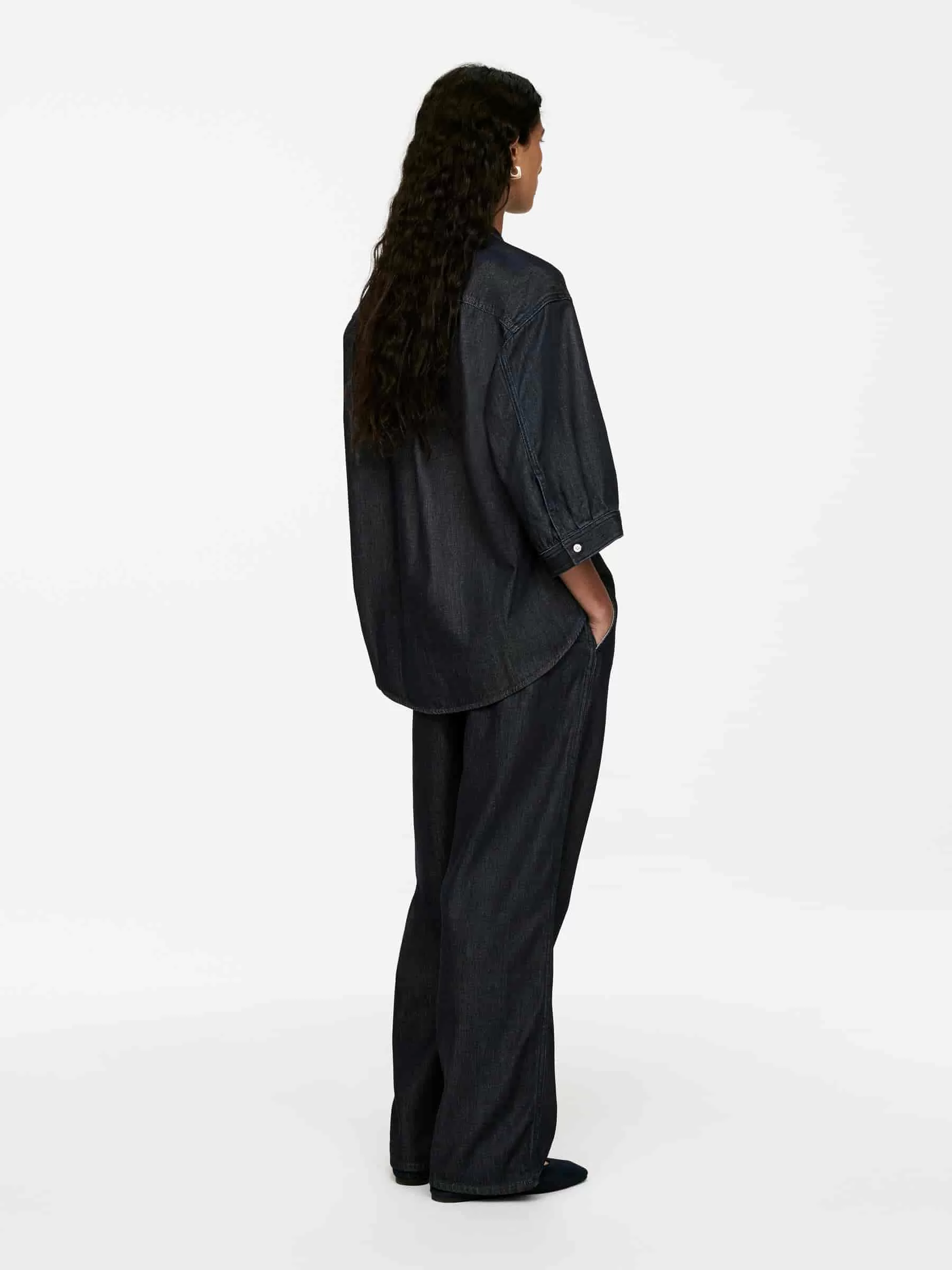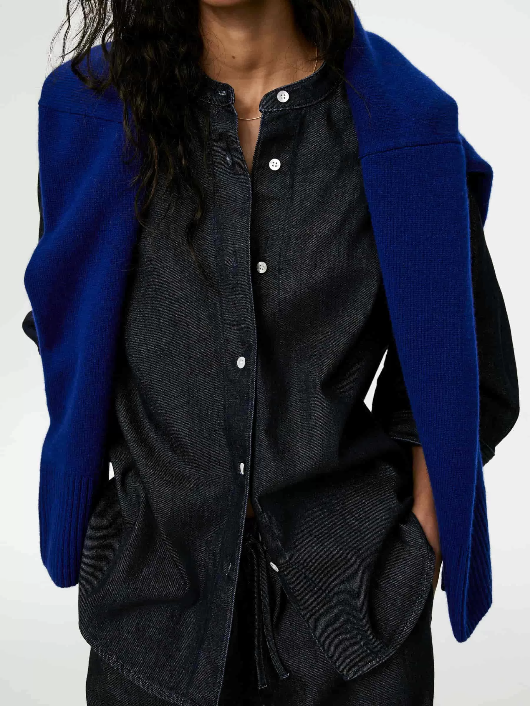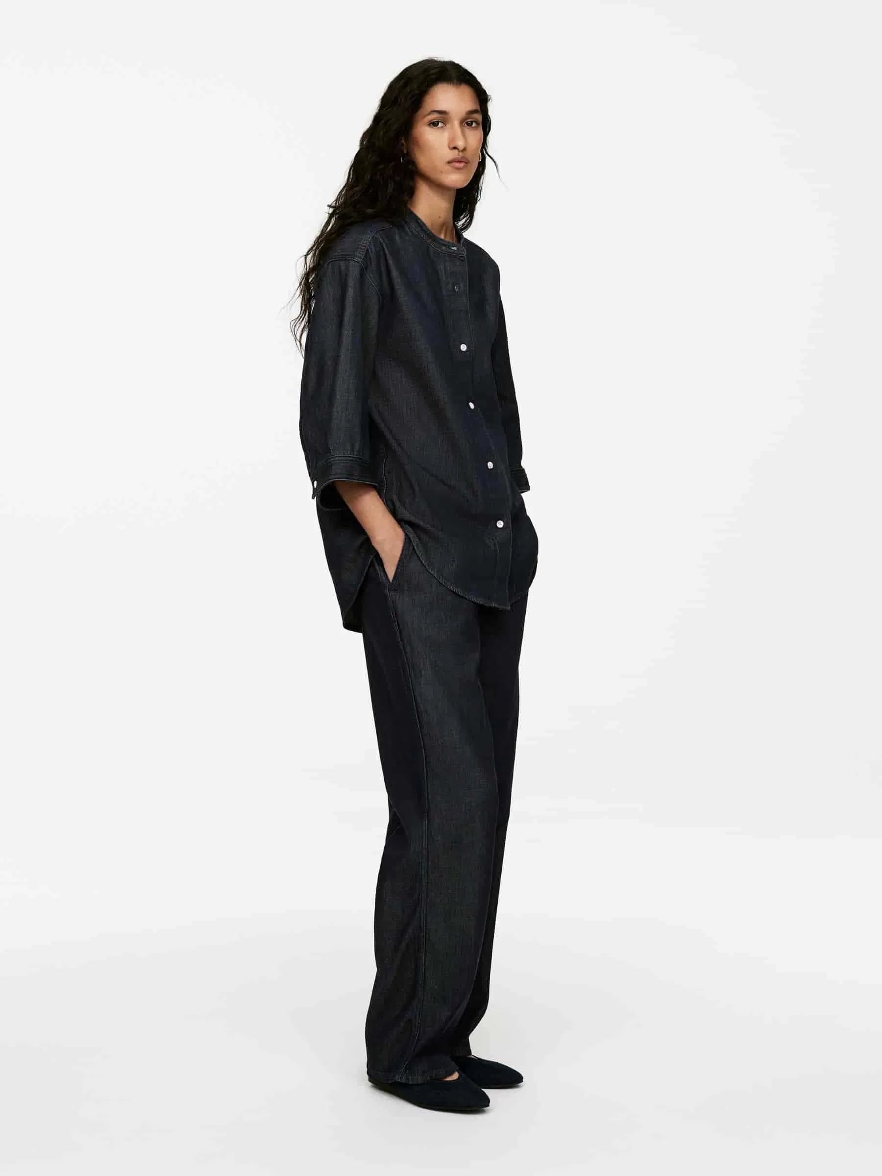 Camisa denim crudo confeccionada a partir de una mezcla de algodón y lyocell. Un modelo sin cuello, manga tres cuartos y puños abotonados. Ajuste regular.