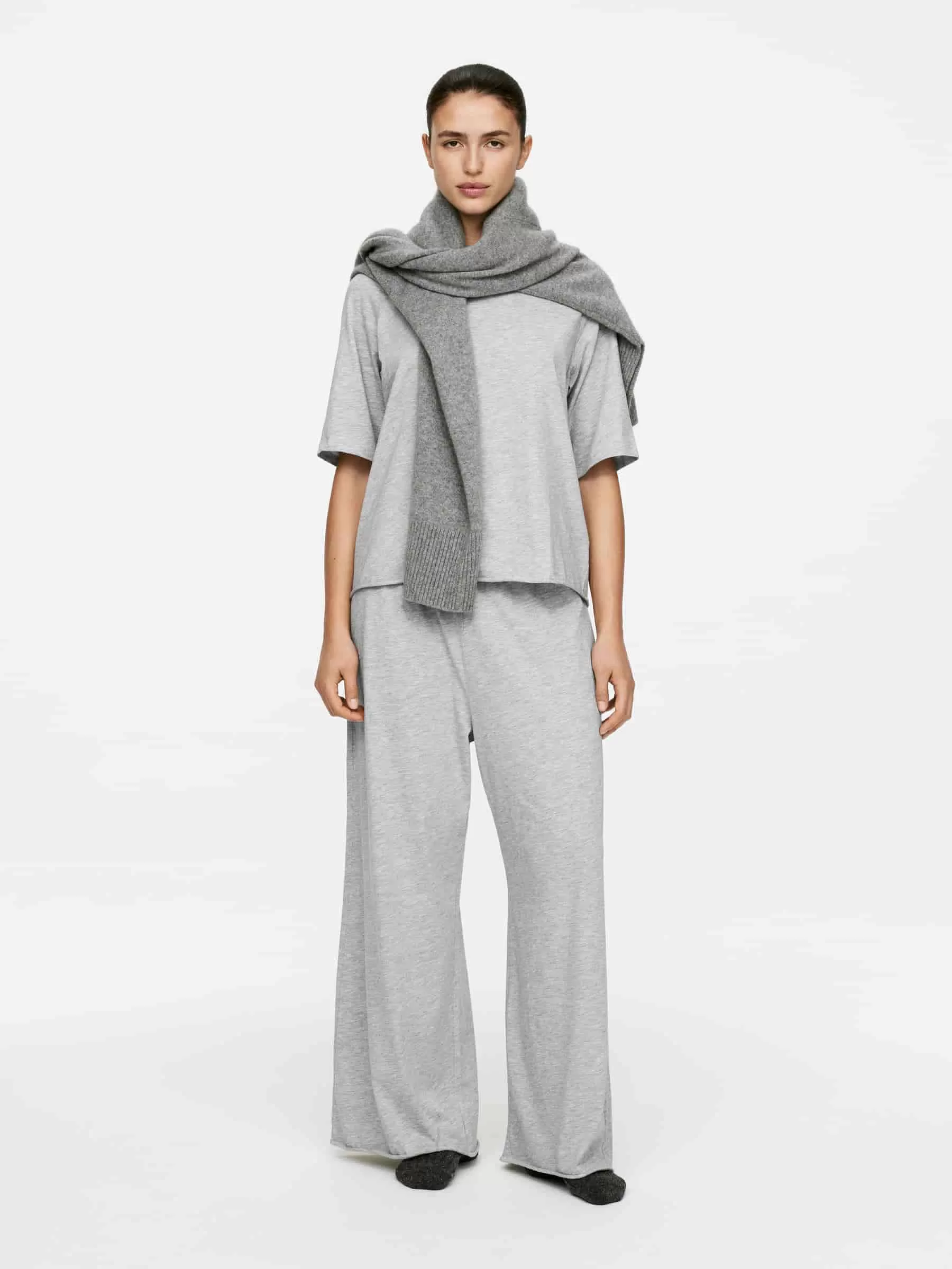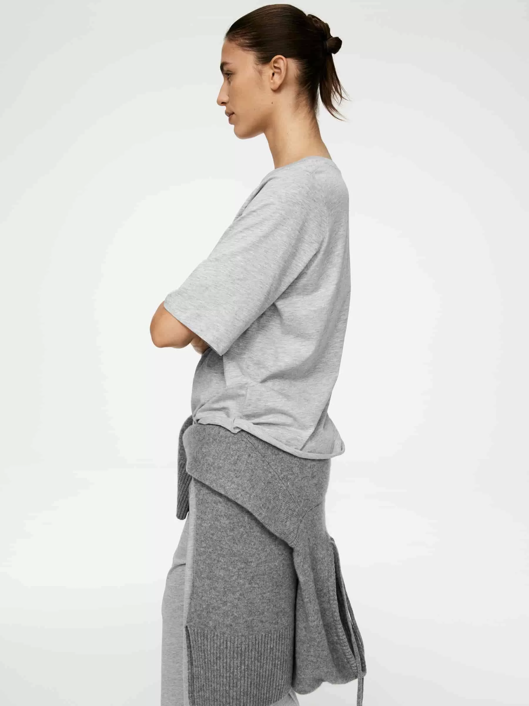 Camiseta ligera de corte relajado y mangas que llegan hasta los codos. Borde sin rematar en el dobladillo inferior.