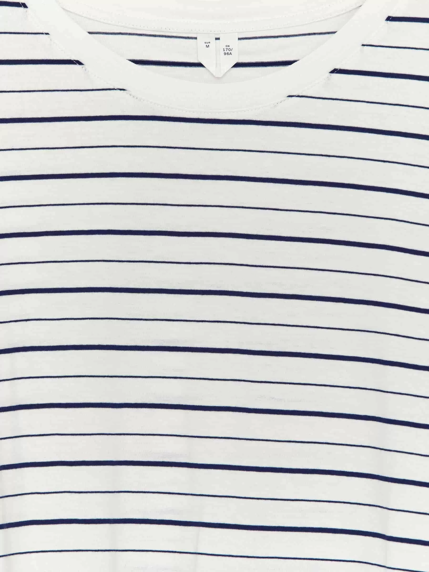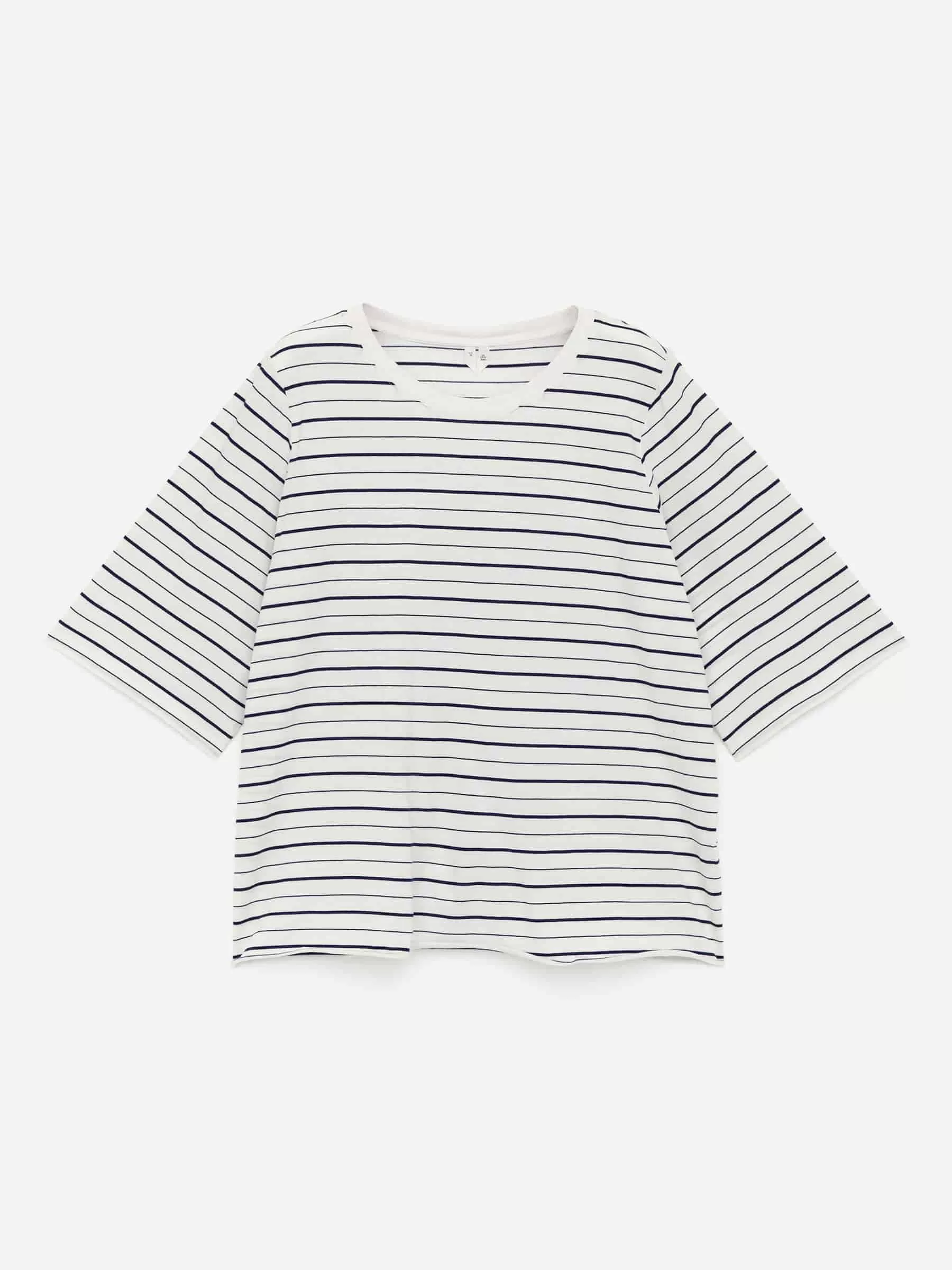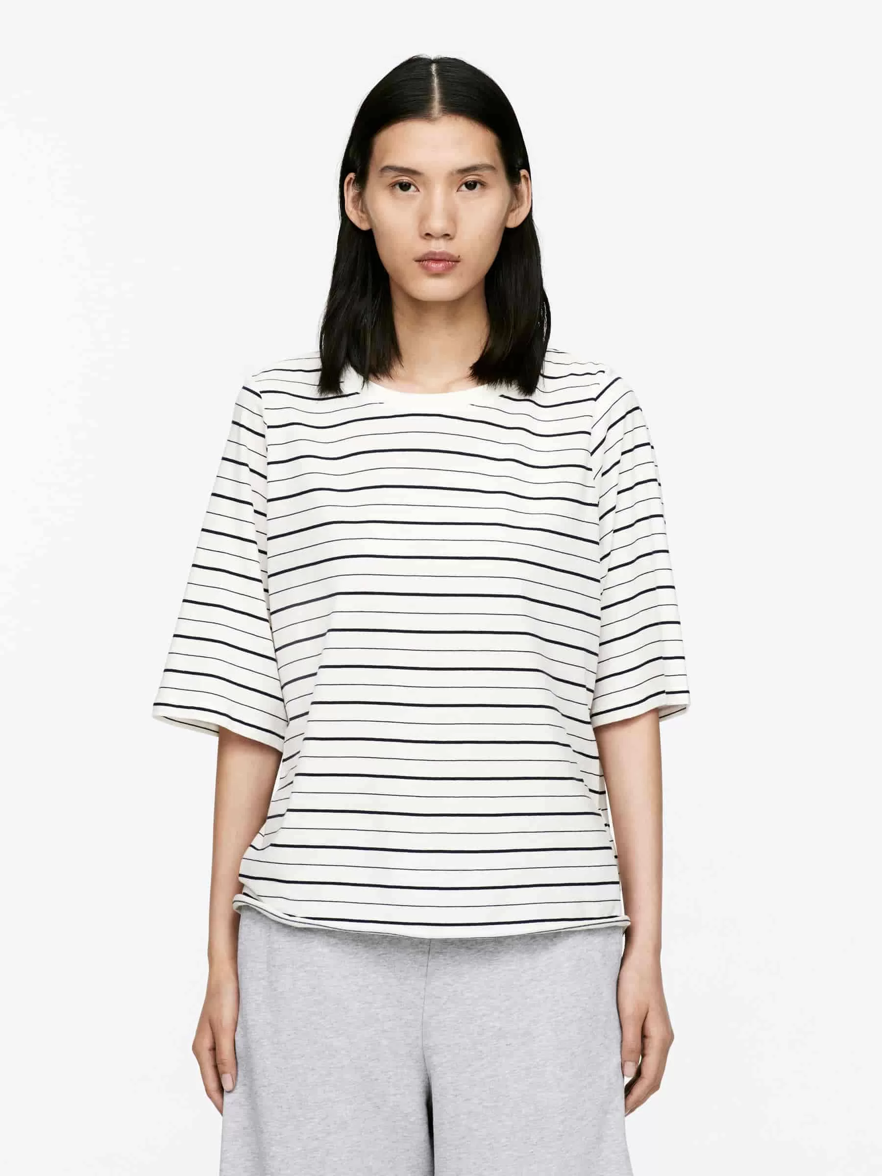 Camiseta ligera de corte relajado y mangas que llegan hasta los codos. Borde sin rematar en el dobladillo inferior.
