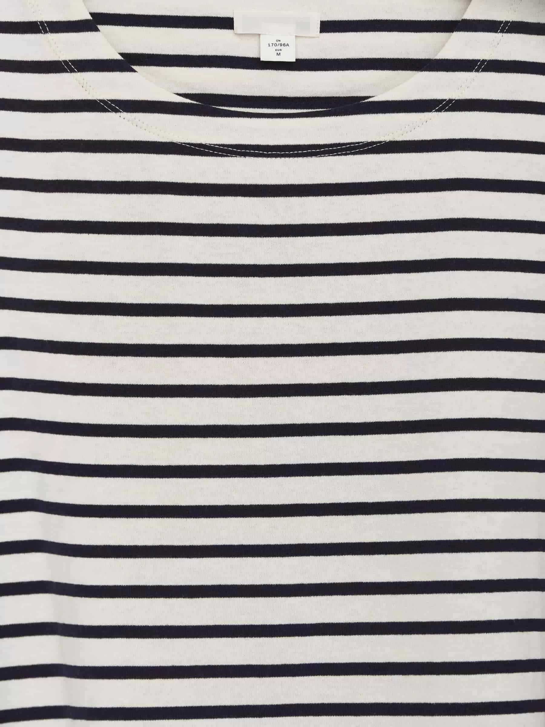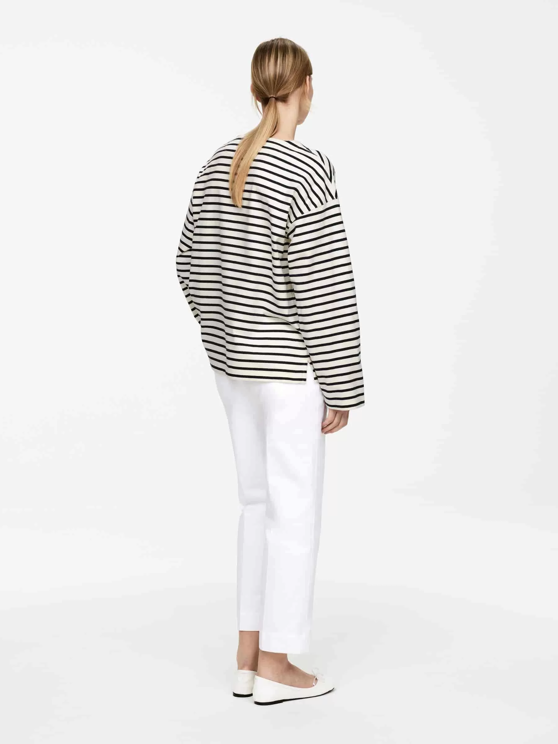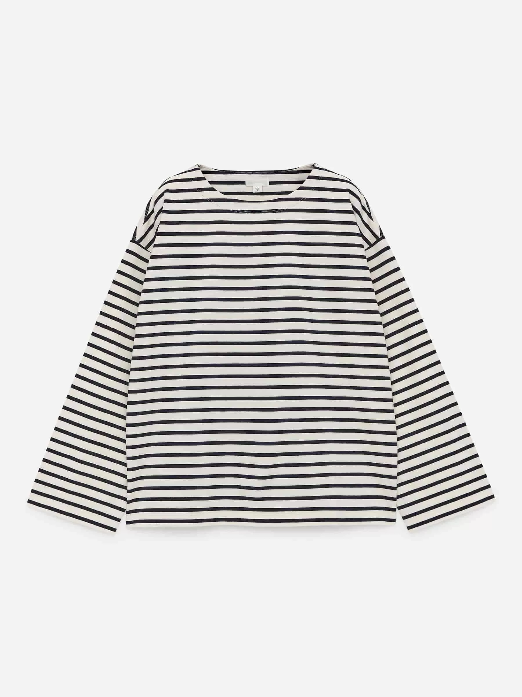 Camiseta de manga larga en punto suave de algodón teñido en hilo. Diseñado con hombros caídos y dobladillo inferior ventilado.