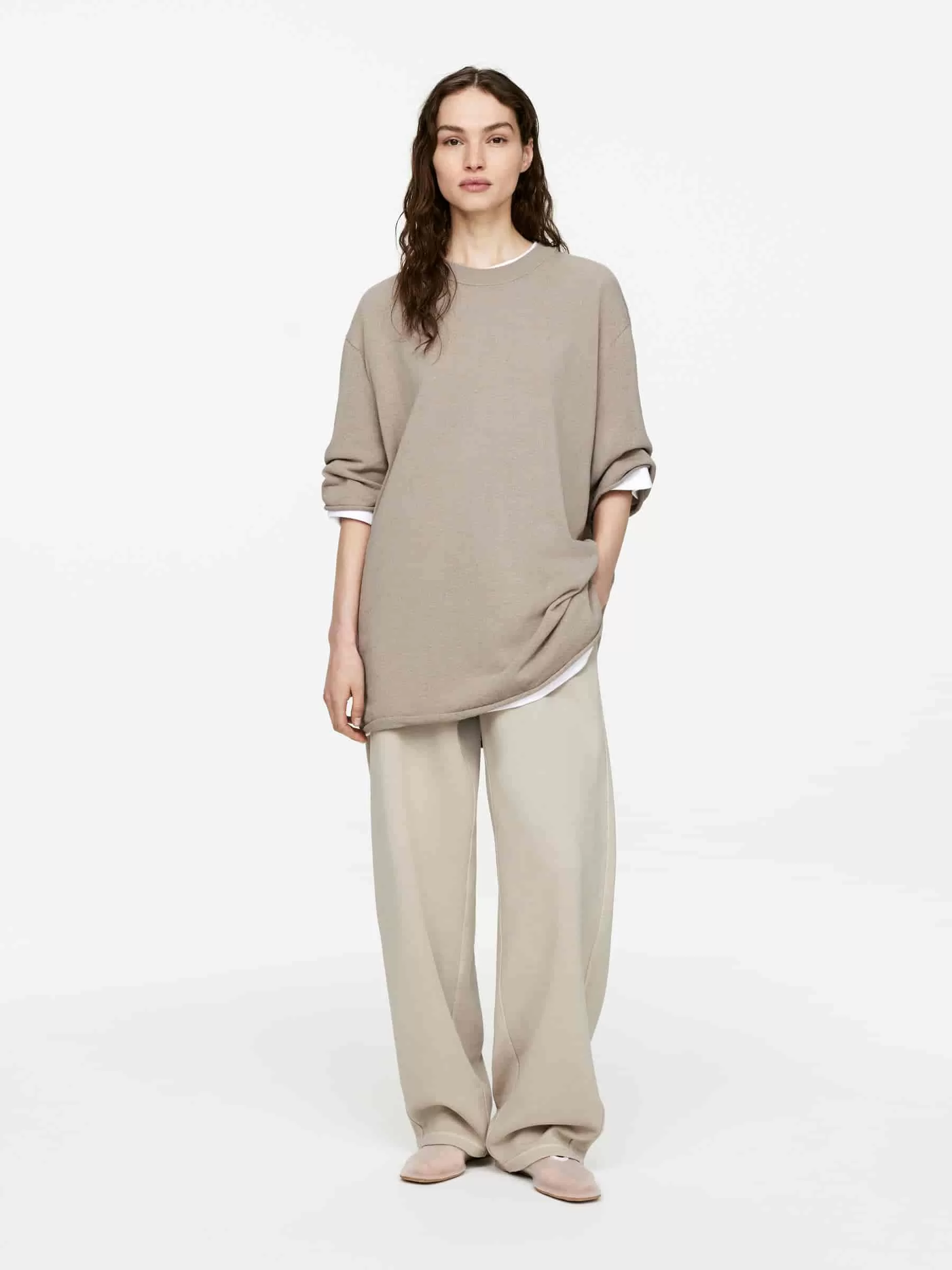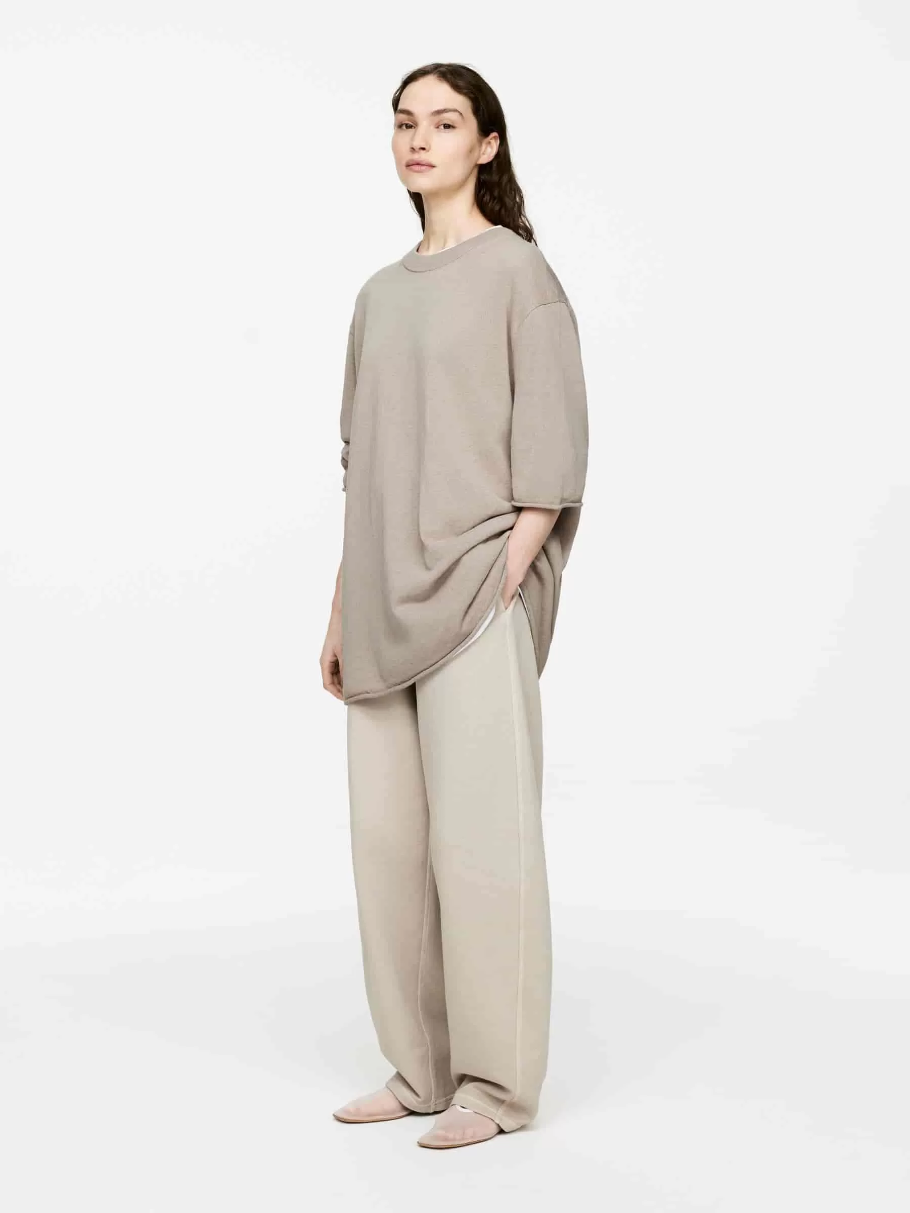 Camiseta en mezcla de lino, algodón y viscosa. Diseñado con cuello acanalado y bordes enrollados en el extremo de las mangas y el dobladillo inferior. Ajuste holgado.