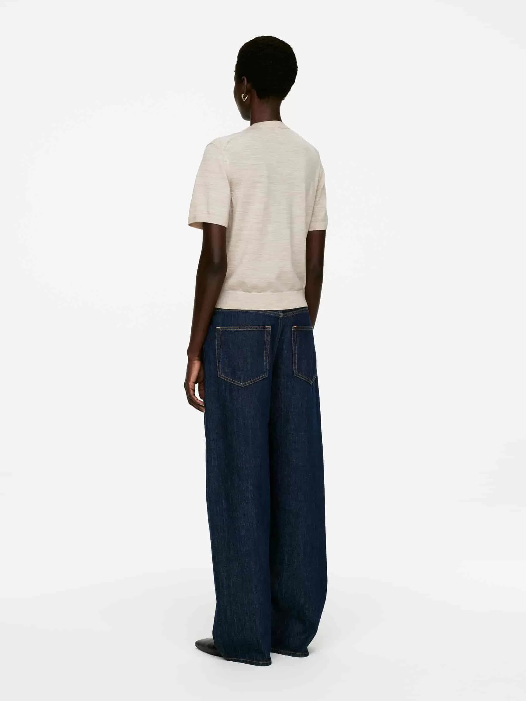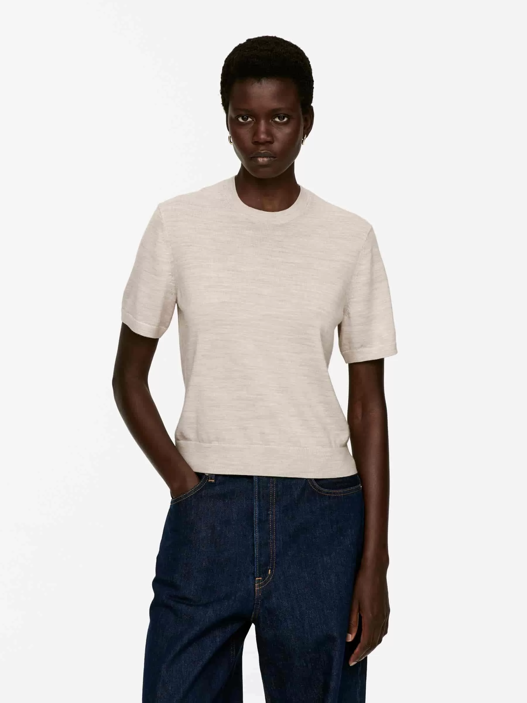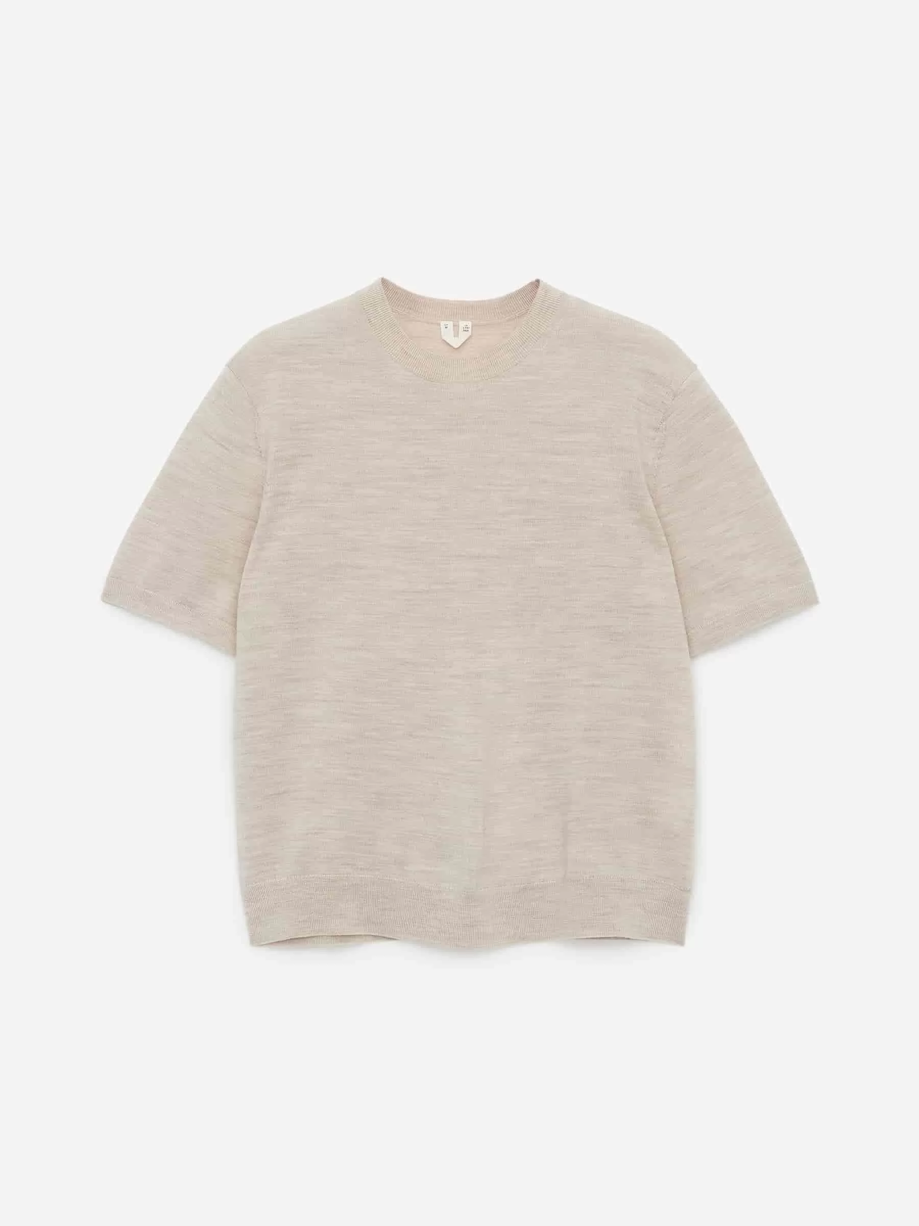 Jersey de punto liso y manga corta en lana merino. Diseñado con ribetes acanalados. El jersey contiene 100% lana RWS, certificada por el sindicato de control 893290. Los productos certificados según el Estándar de Lana Responsable (RWS) contienen fibra de lana de granjas certificadas independientemente según los requisitos de bienestar animal y gestión de la tierra.