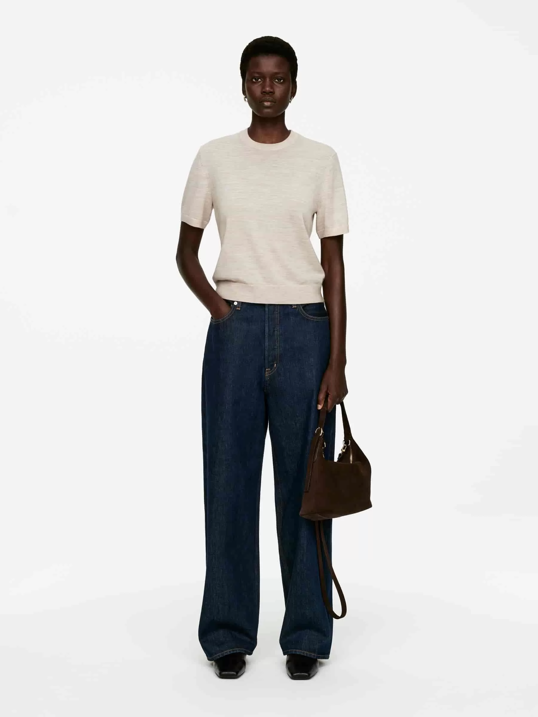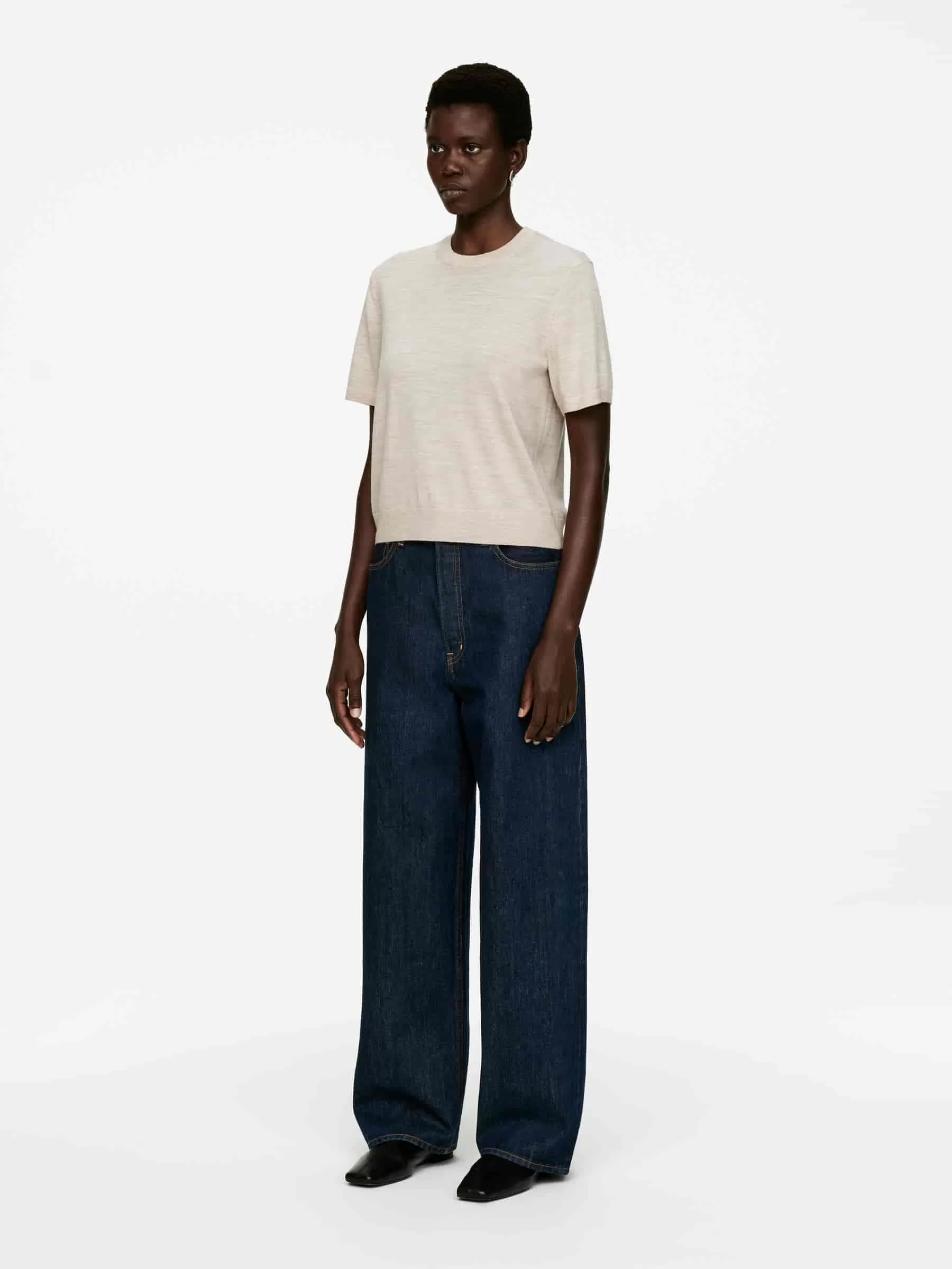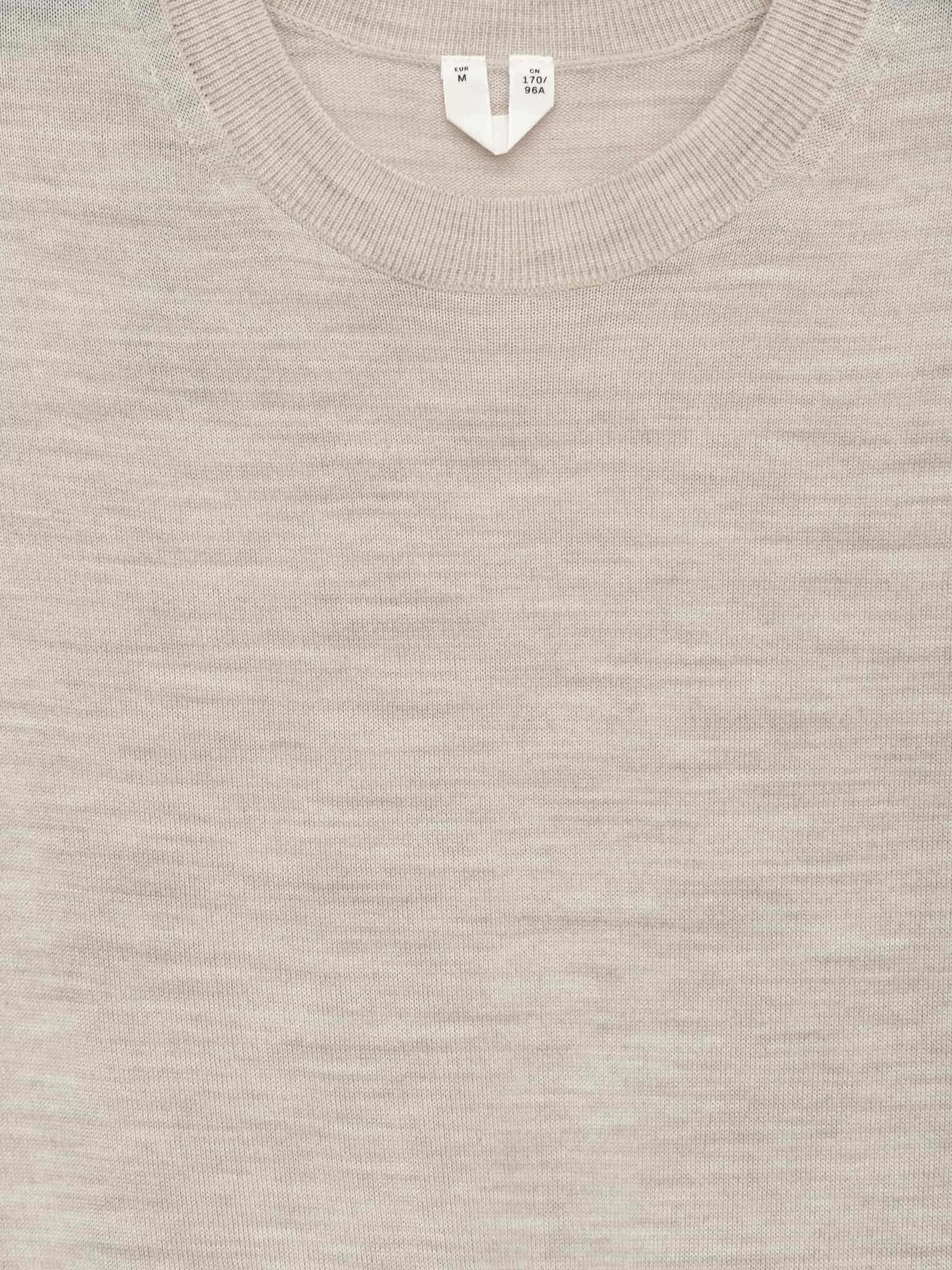 Jersey de punto liso y manga corta en lana merino. Diseñado con ribetes acanalados. El jersey contiene 100% lana RWS, certificada por el sindicato de control 893290. Los productos certificados según el Estándar de Lana Responsable (RWS) contienen fibra de lana de granjas certificadas independientemente según los requisitos de bienestar animal y gestión de la tierra.