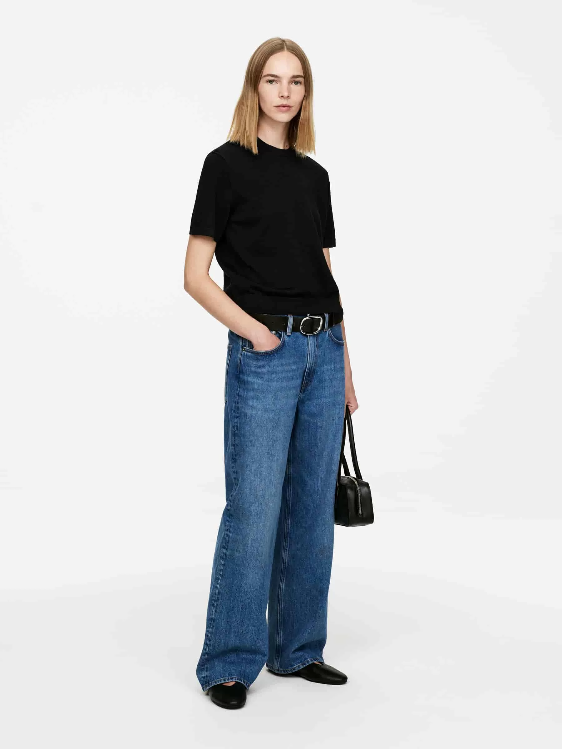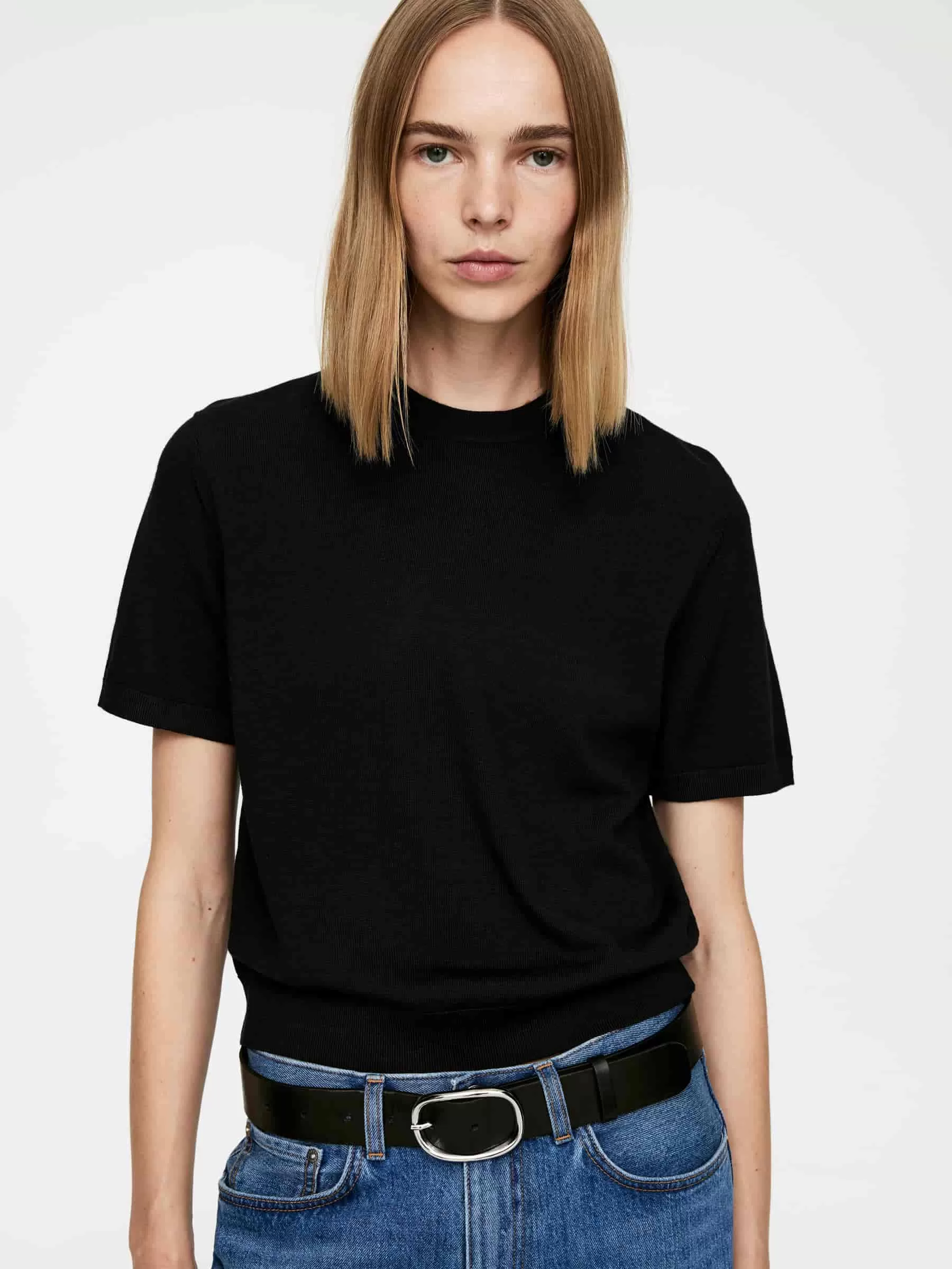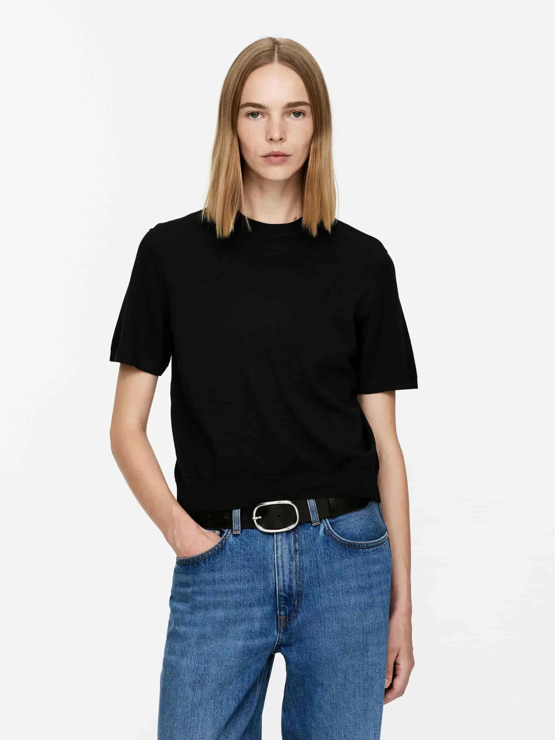 Jersey de punto liso y manga corta en lana merino. Diseñado con ribetes acanalados. El jersey contiene 100% lana RWS, certificada por el sindicato de control 893290. Los productos certificados según el Estándar de Lana Responsable (RWS) contienen fibra de lana de granjas certificadas independientemente según los requisitos de bienestar animal y gestión de la tierra.