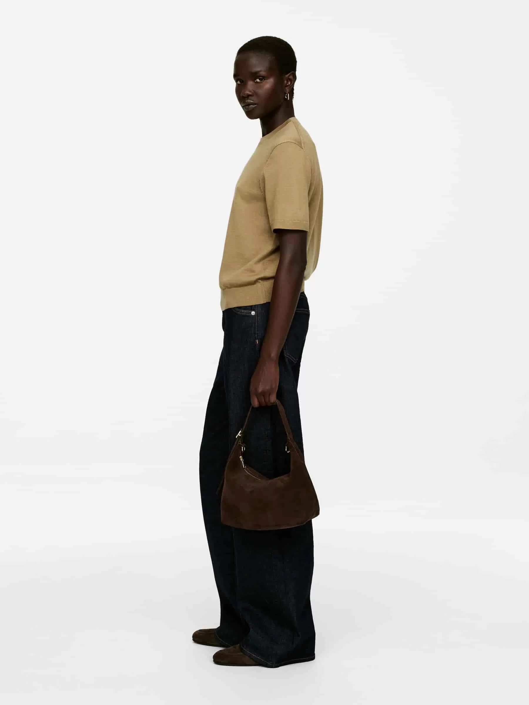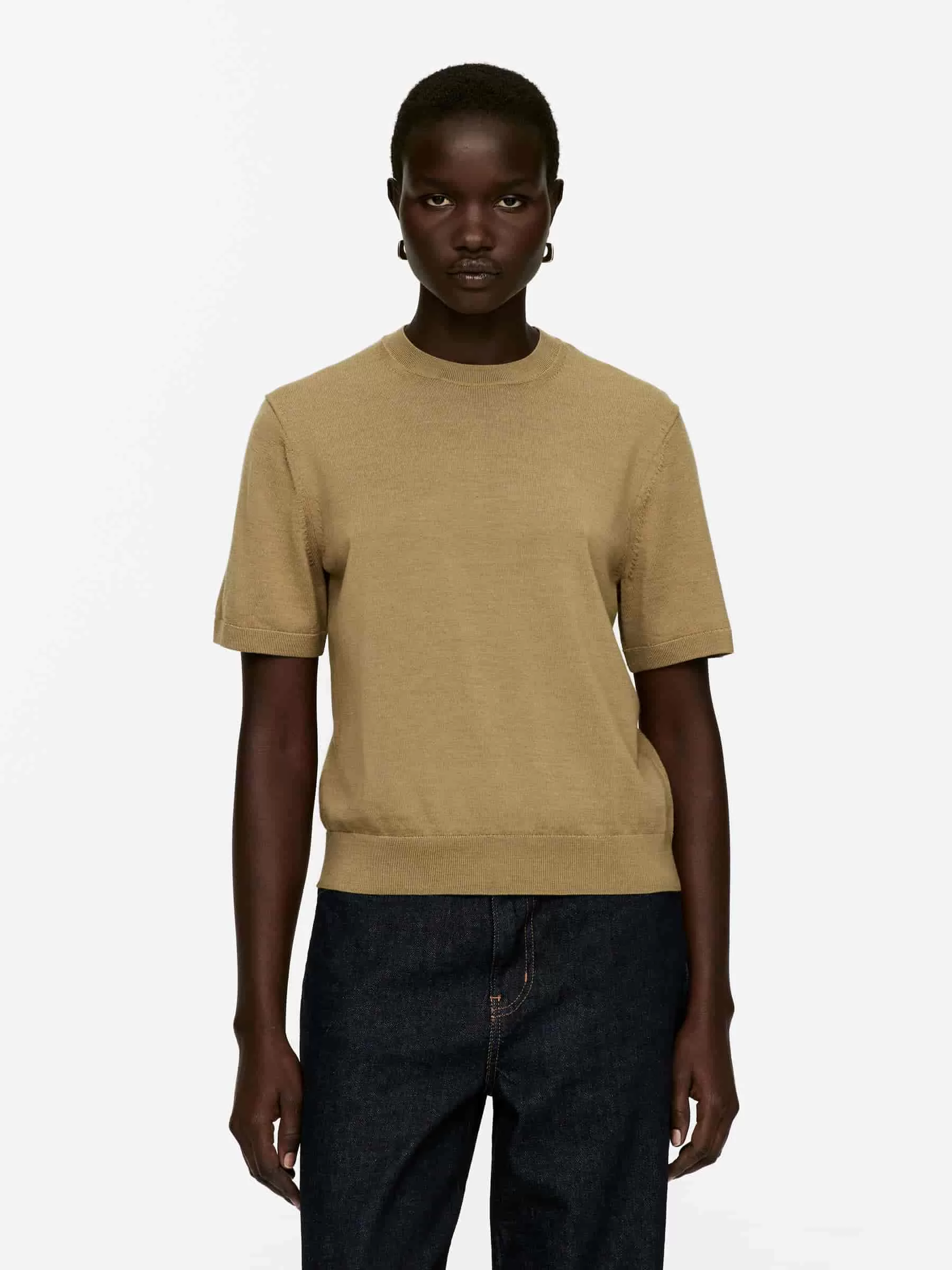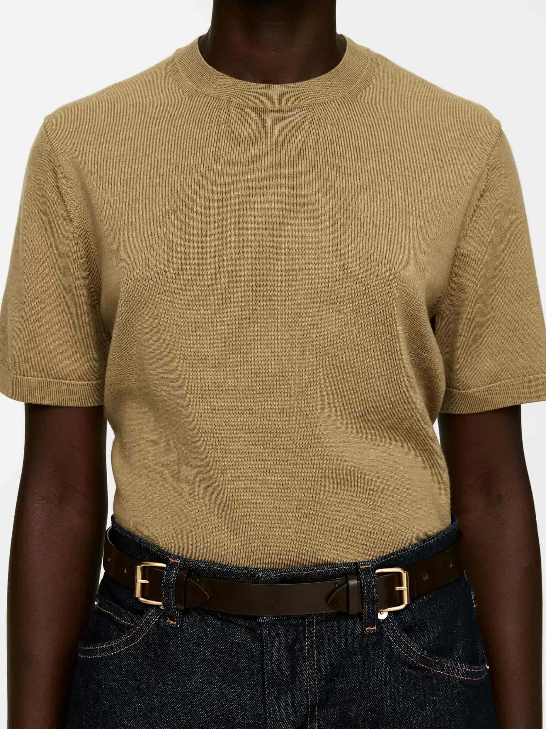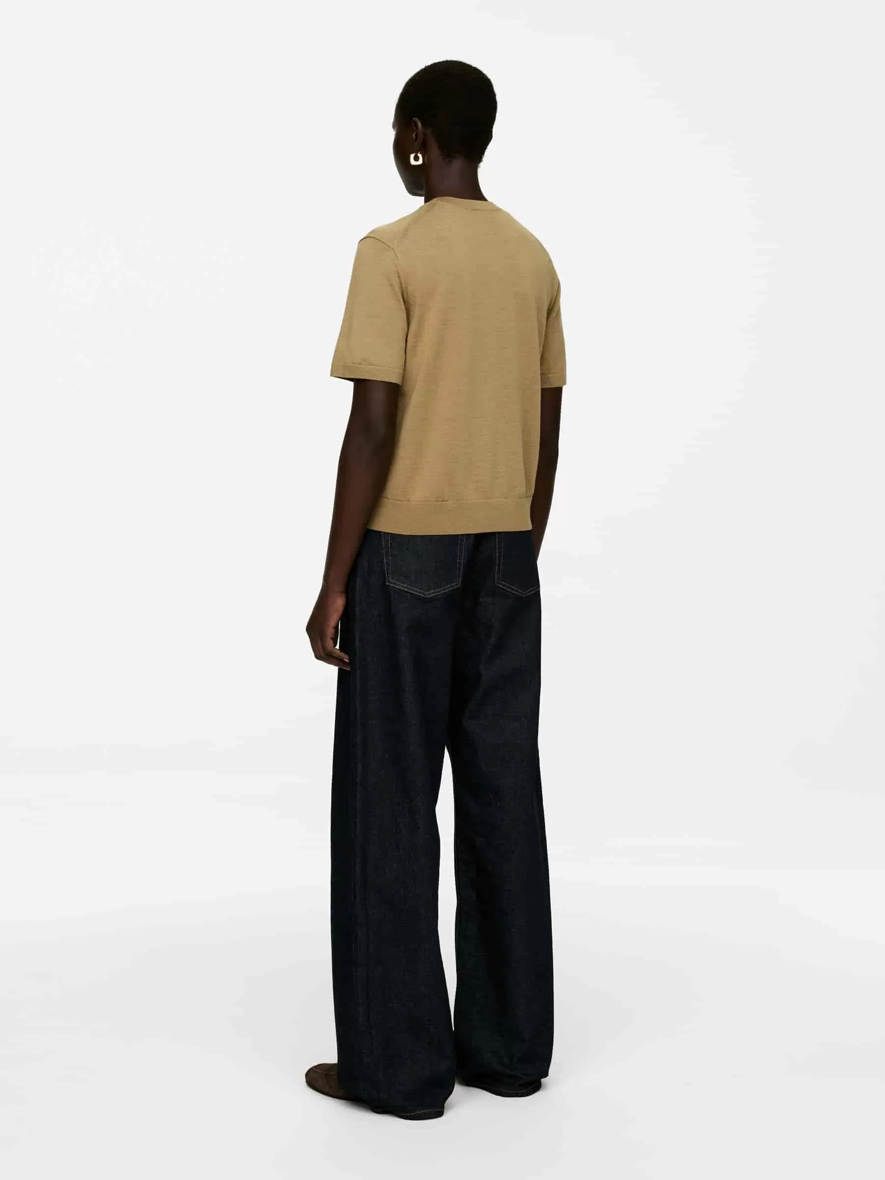 Jersey de punto liso y manga corta en lana merino. Diseñado con ribetes acanalados. El jersey contiene 100% lana RWS, certificada por el sindicato de control 893290. Los productos certificados según el Estándar de Lana Responsable (RWS) contienen fibra de lana de granjas certificadas independientemente según los requisitos de bienestar animal y gestión de la tierra.