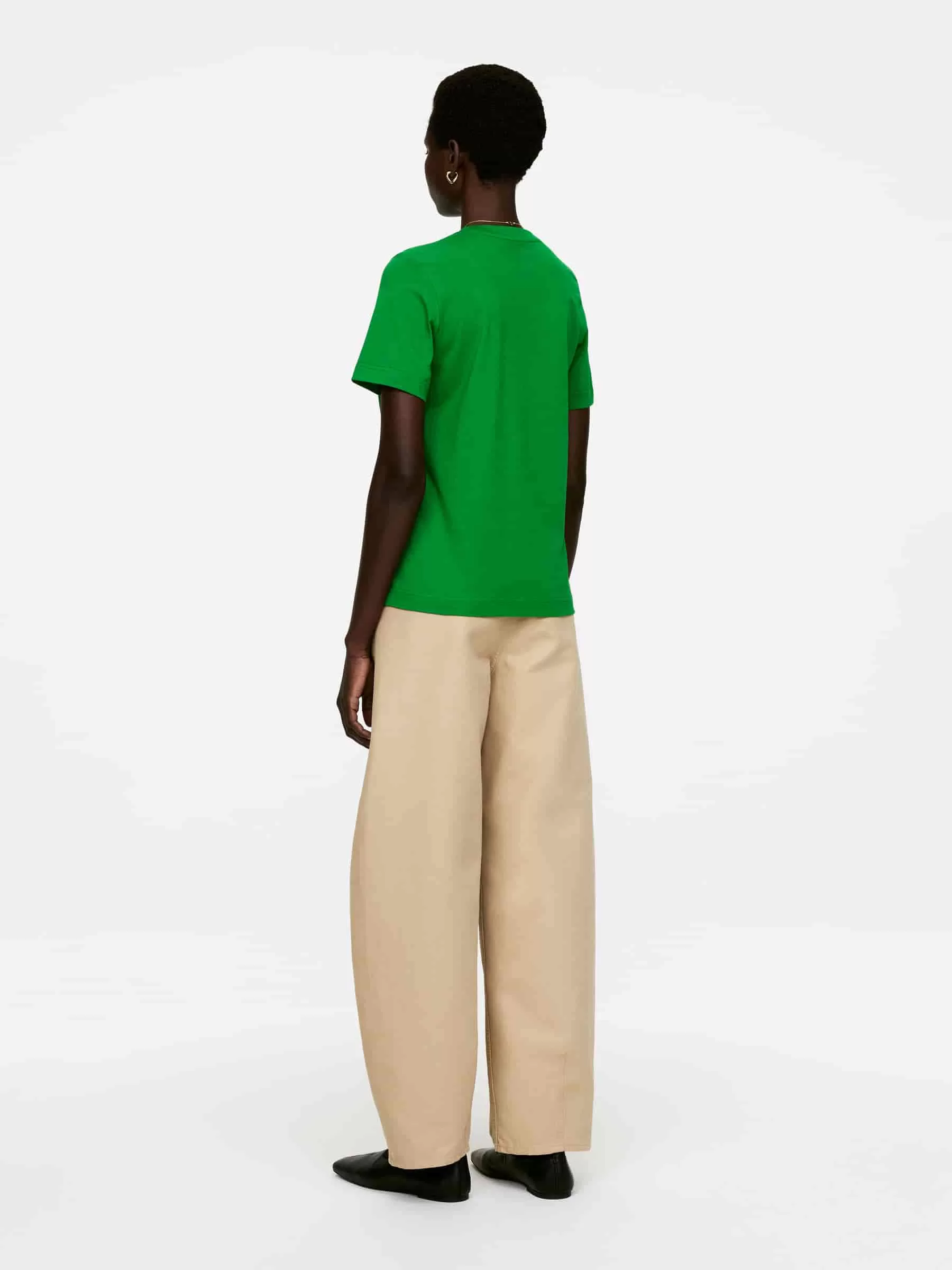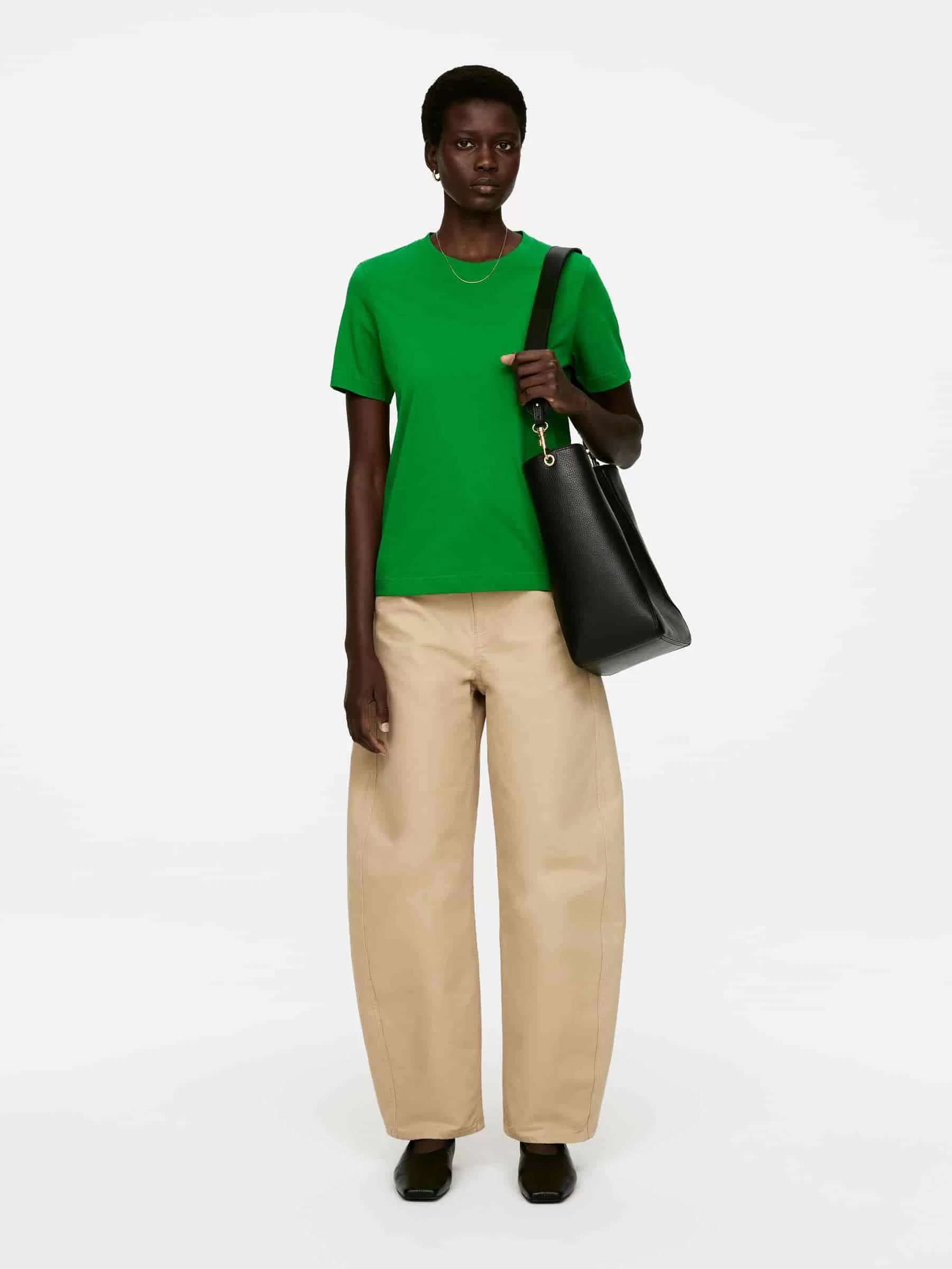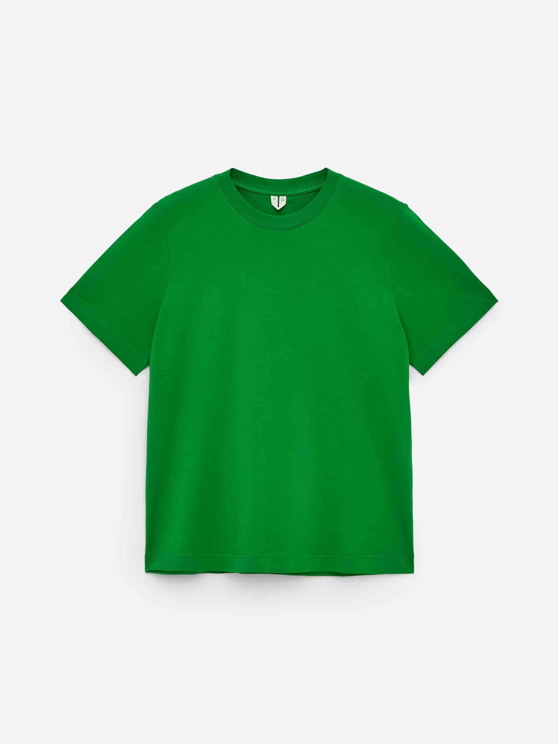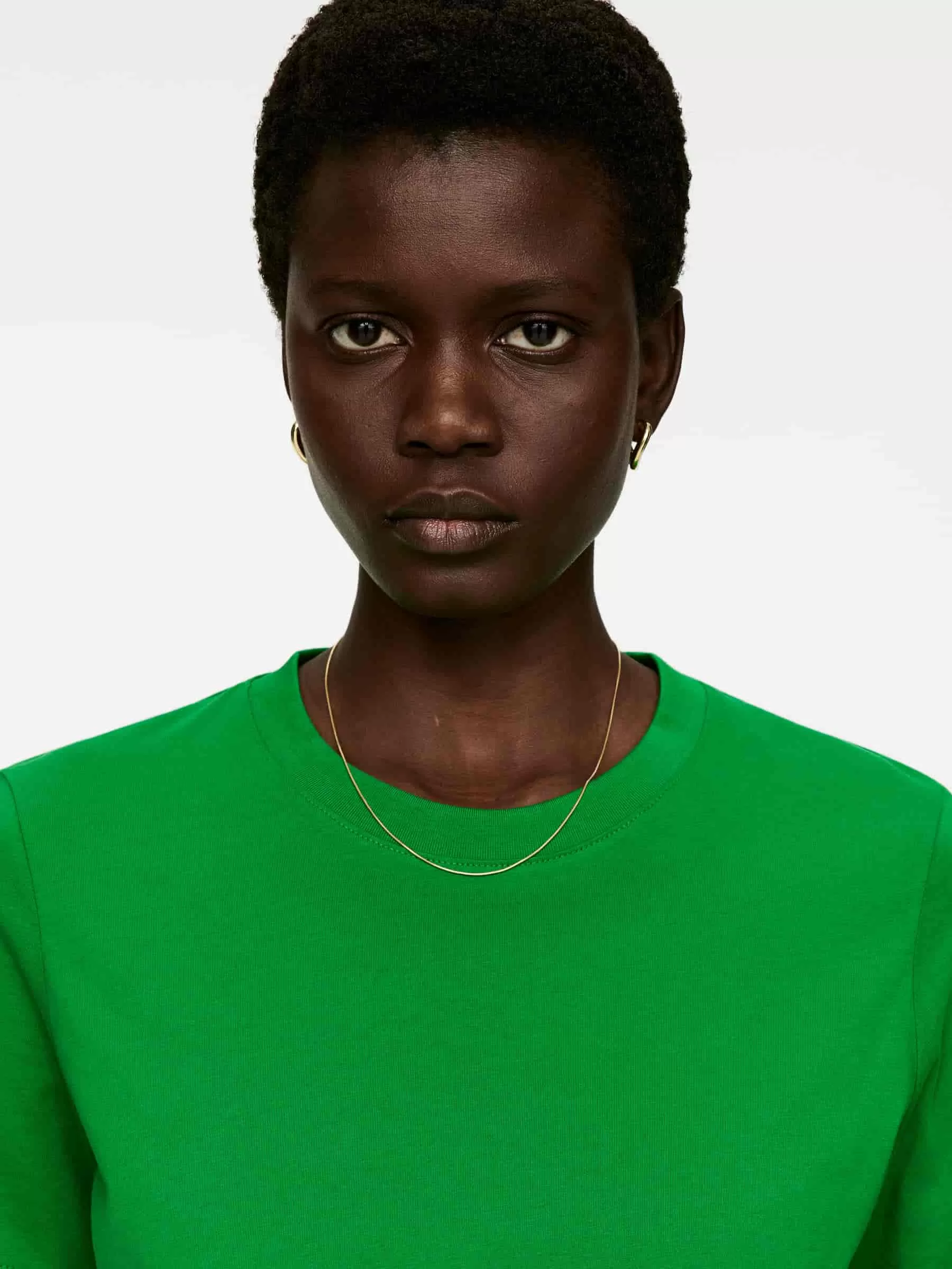 Camiseta tejida con algodón de fibra larga, suave y compacto. Diseñado con un ajuste regular de punto sencillo con ribetes acanalados alrededor del cuello redondo.