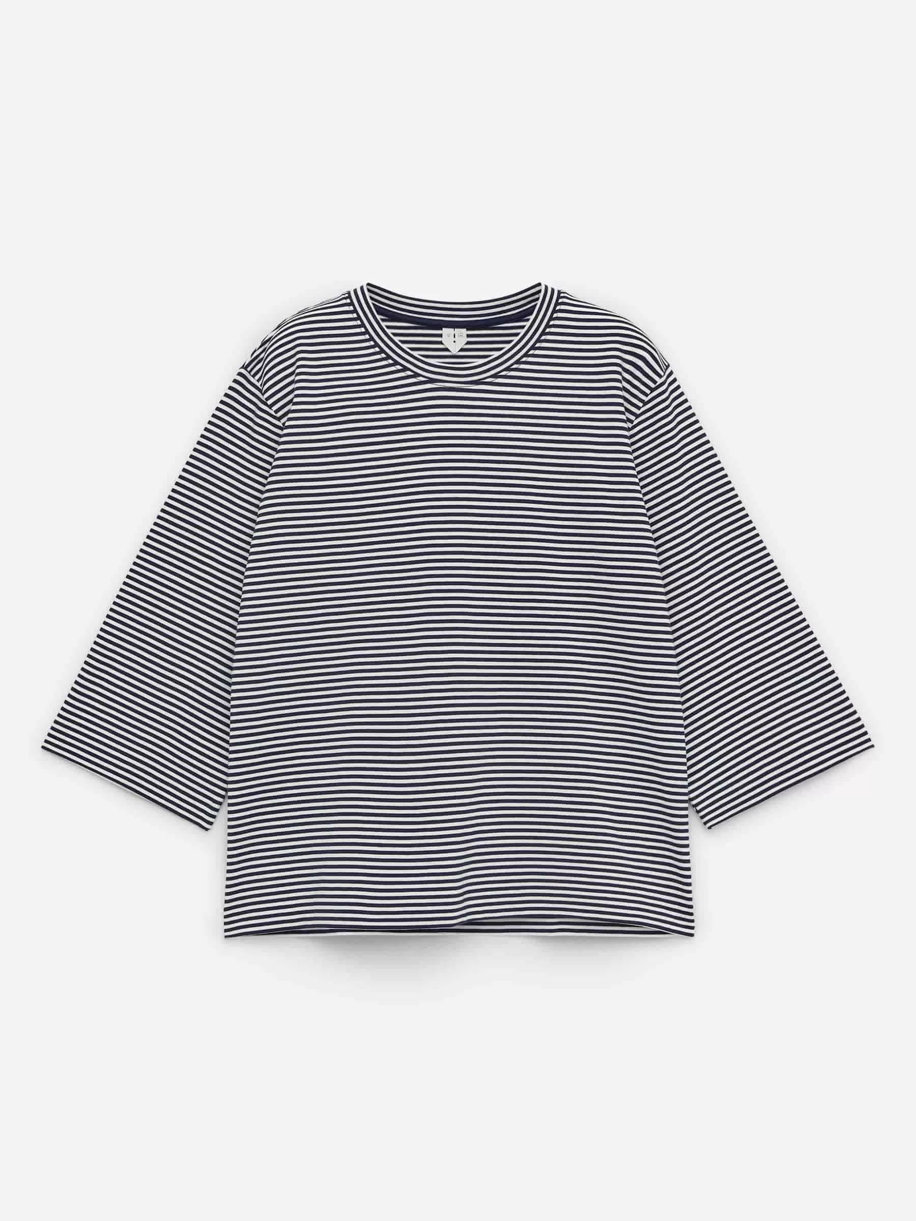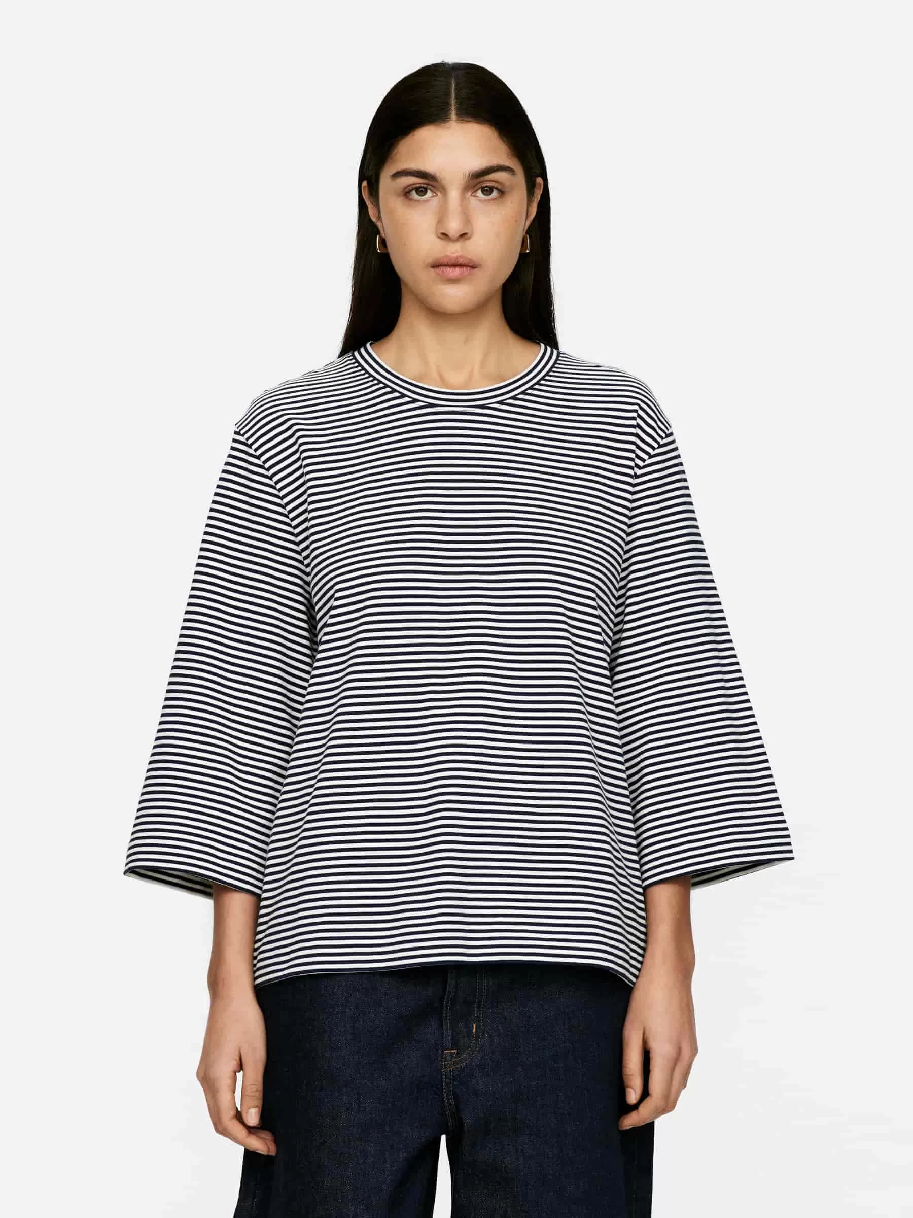 Camiseta de cuello redondo confeccionada con un jersey de algodón pesado y fresco. Diseñado con mangas de 3/4.