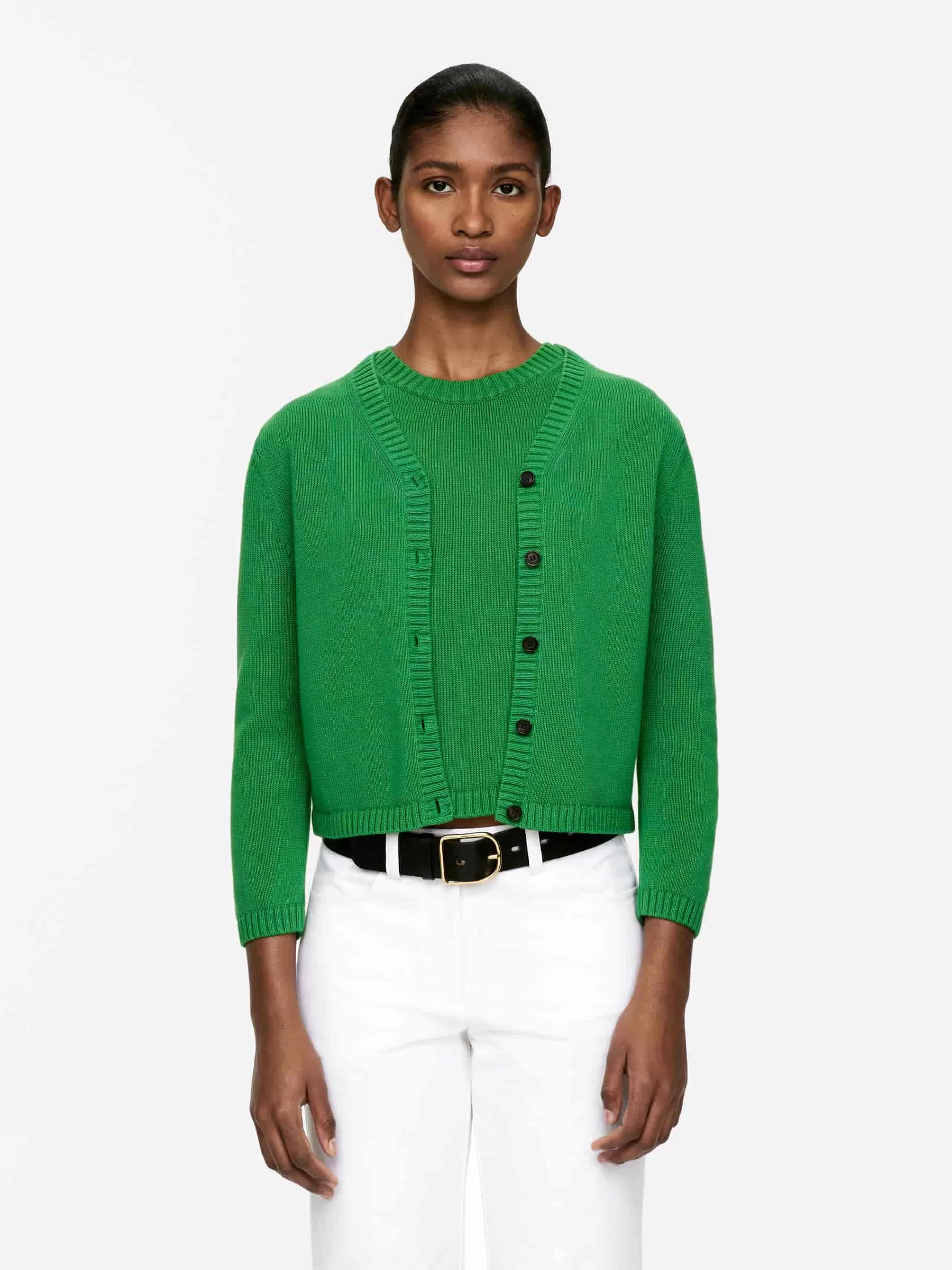 Cárdigan tejido en algodón, con corte encogido, ribetes acanalados y cierre de botones.