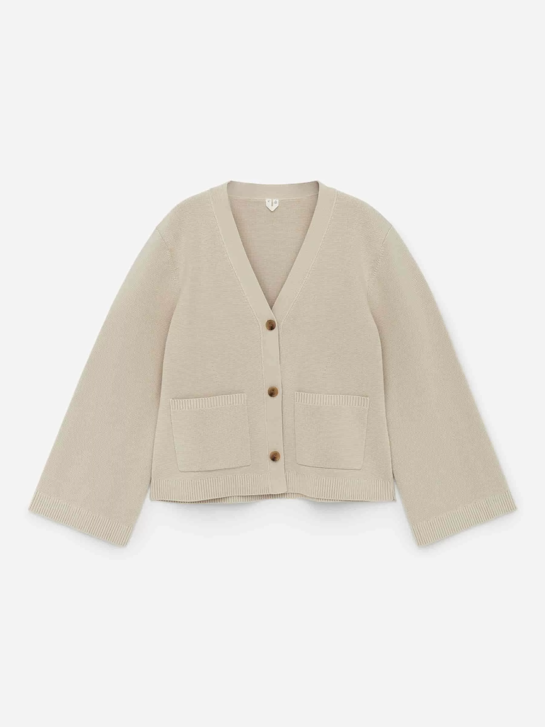 Cárdigan de algodón tejido en punto Milano completo. Este es un modelo con cuello en V, tres botones, bolsillos delanteros y puños y dobladillo inferior de canalé. Ajuste regular.