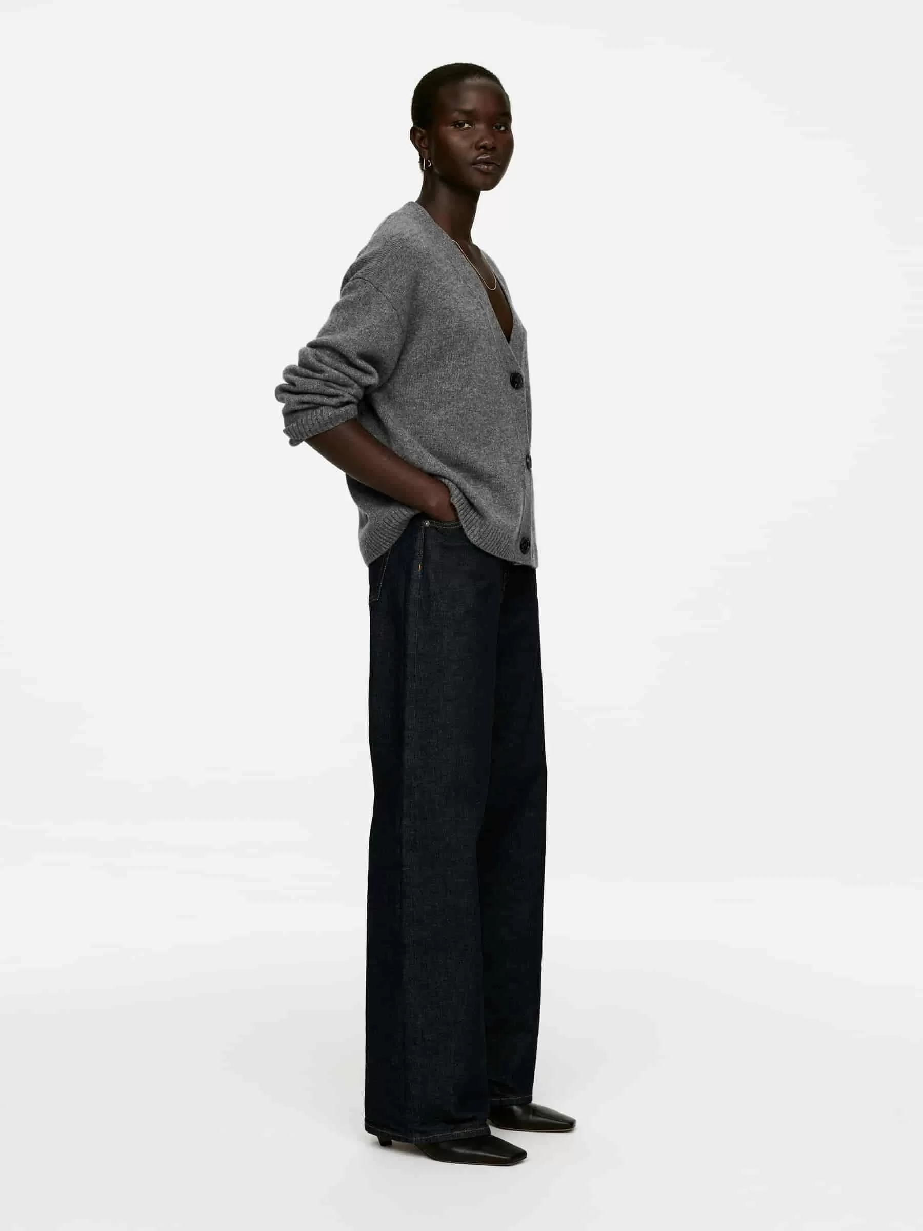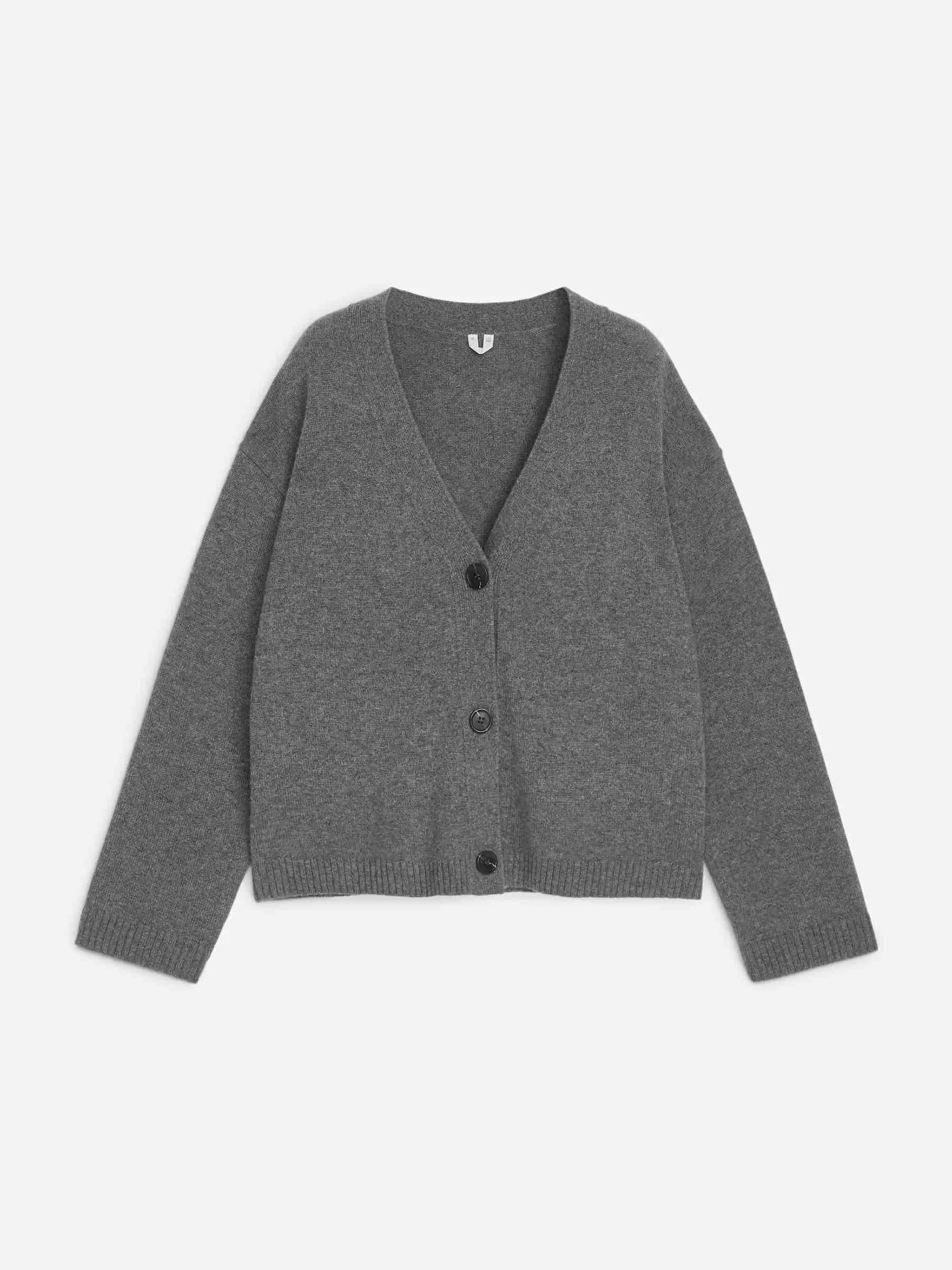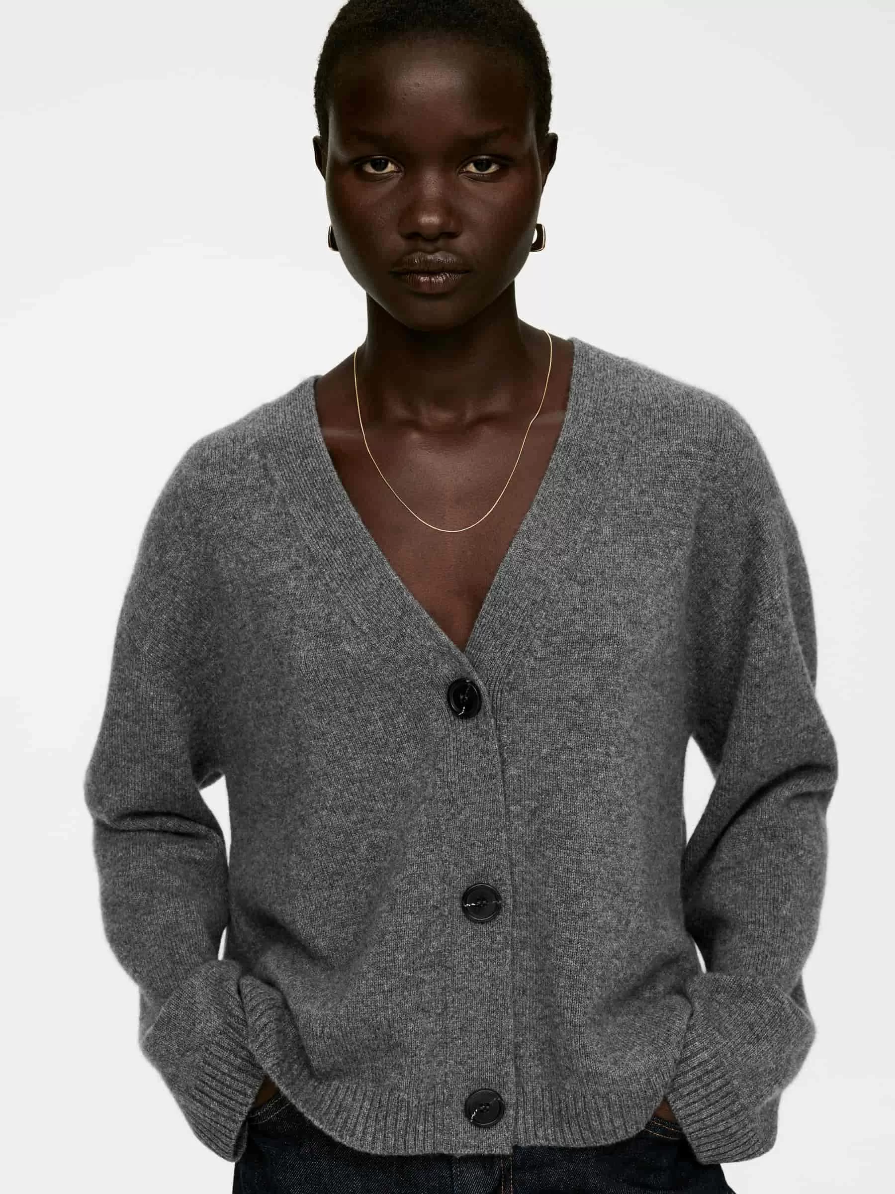 Cárdigan de manga larga confeccionado con cachemira y una parte de lana para mayor resistencia. Cierre con botones y ribetes en punto canalé.