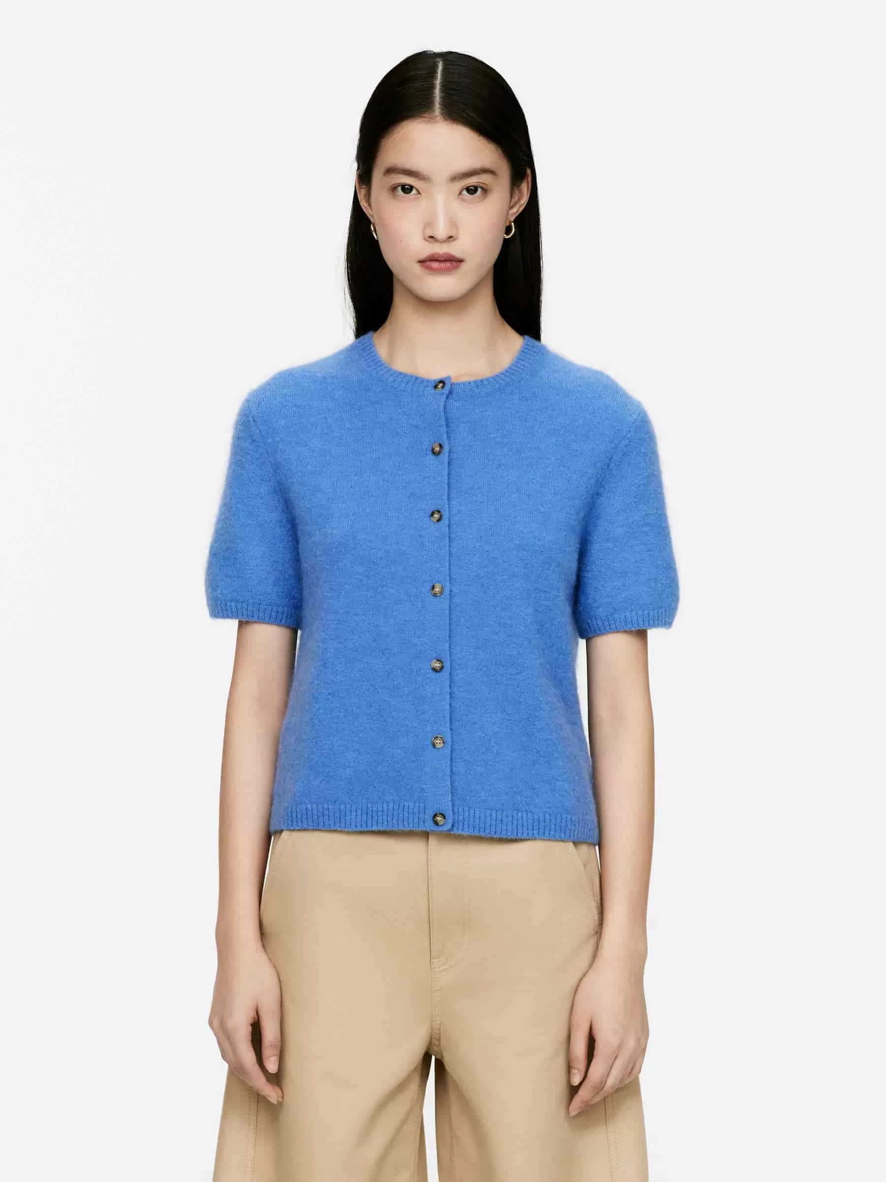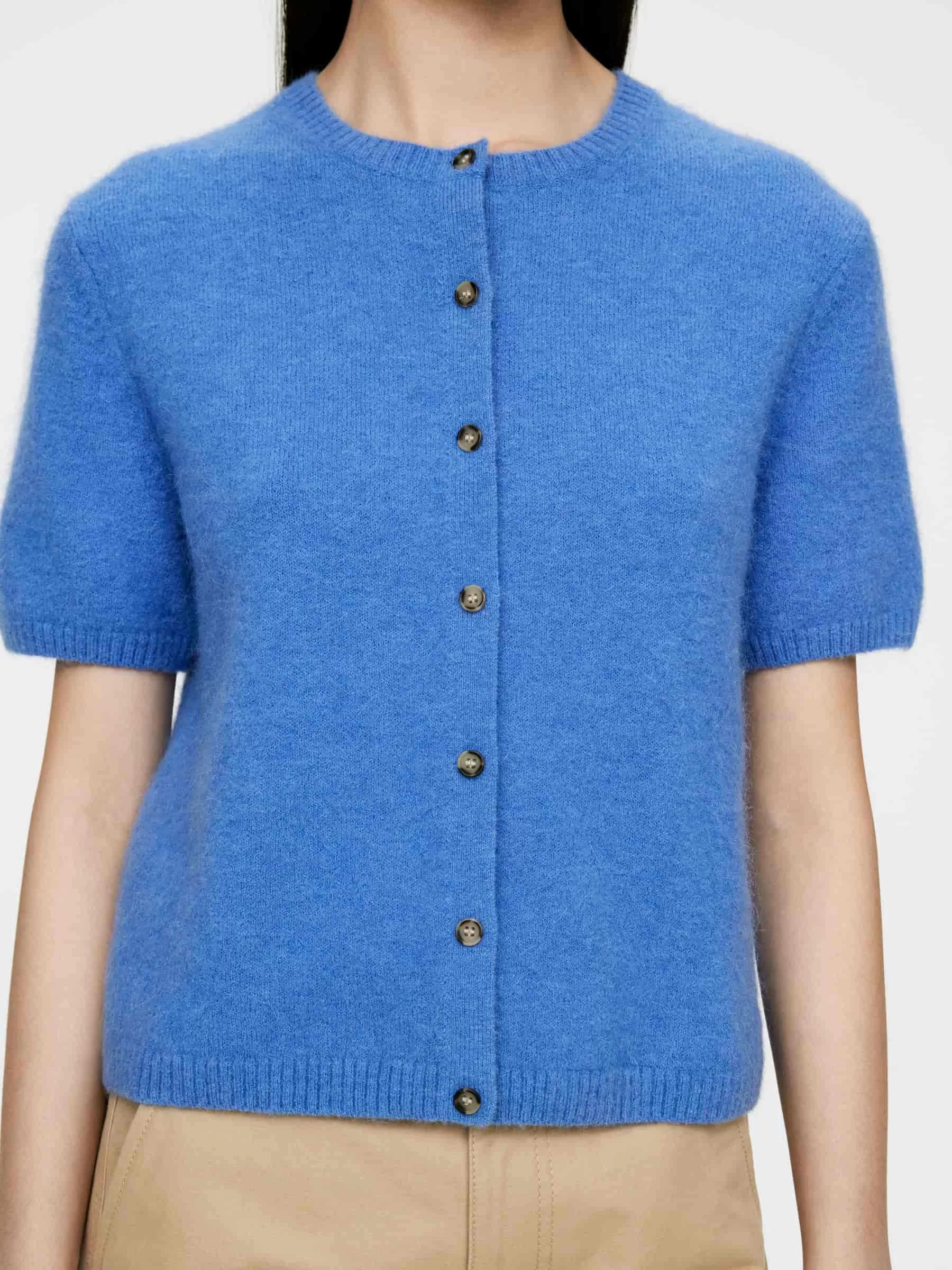 Cárdigan de manga corta tejido en una mezcla de lana y alpaca. Diseñado con cierre de botón y corte estándar. Este estilo contiene 31% RAS Alpaca y 31% lana RWS (TE-00047206). Los productos certificados según el Estándar de lana responsable (RWS) y el Estándar de alpaca responsable (RAS) contienen lana y fibra de alpaca de granjas certificadas de forma independiente según los requisitos de bienestar animal y gestión de la tierra.