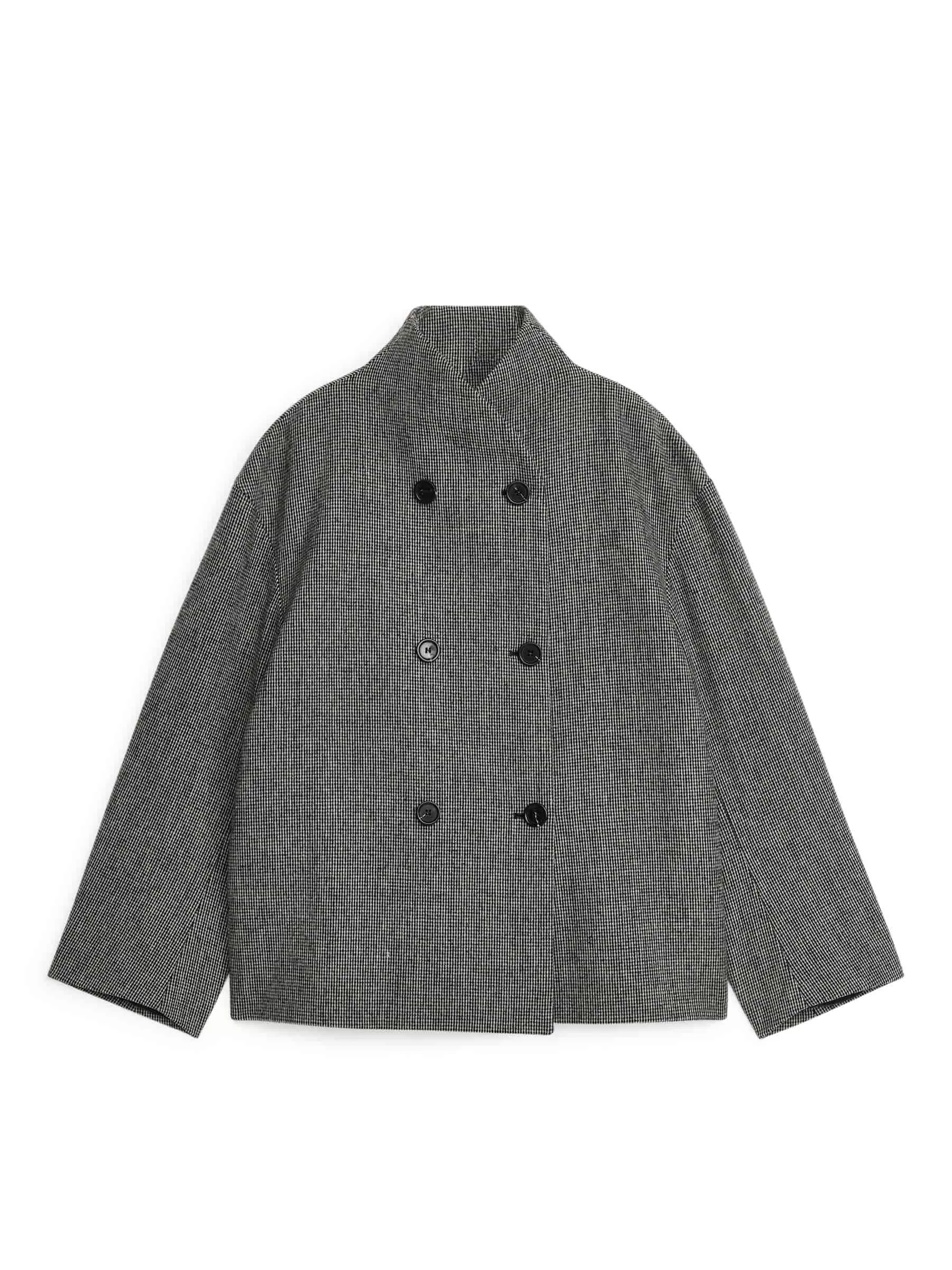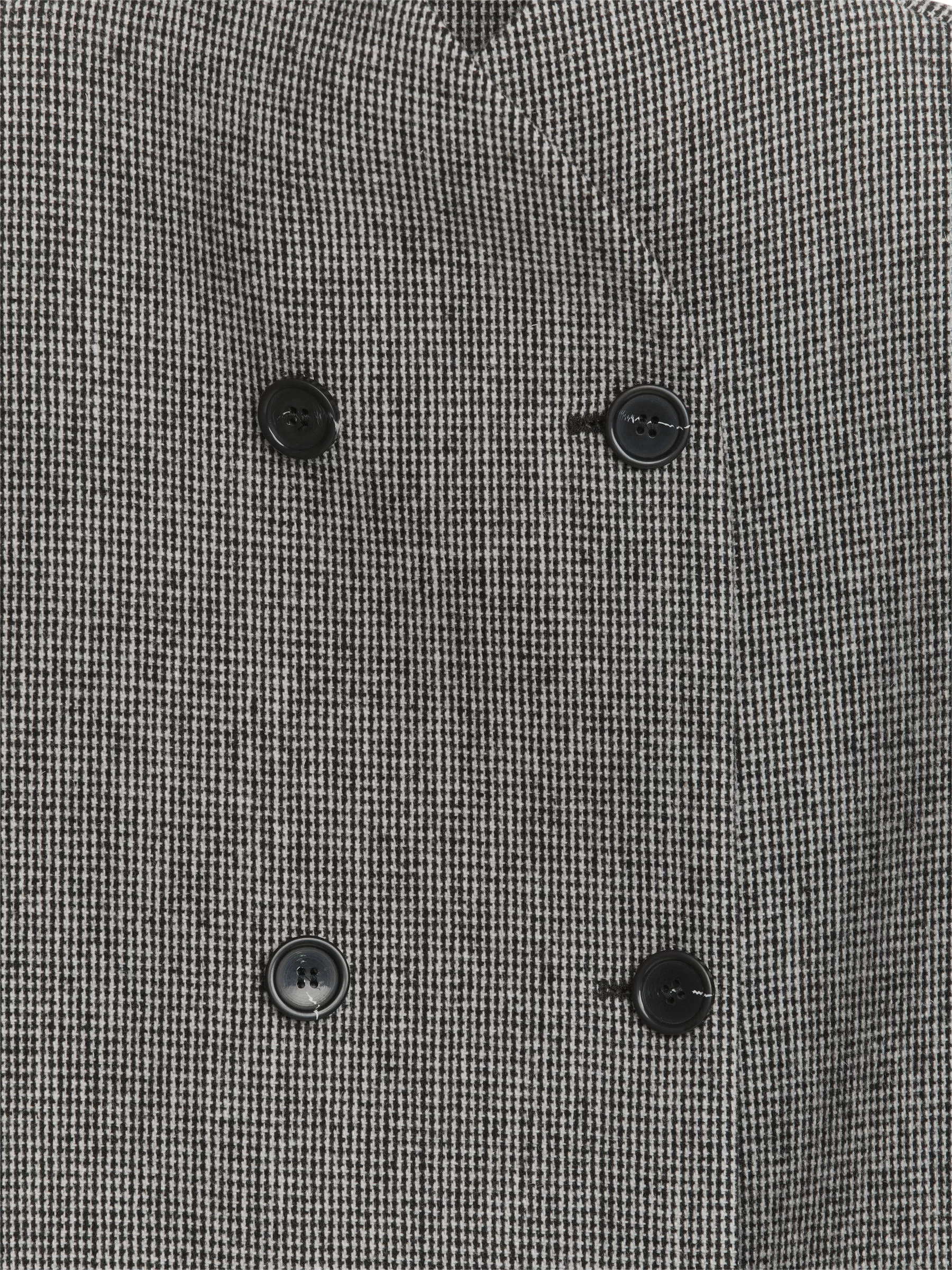 Chaqueta cruzada confeccionada en mezcla de lana. Tiene un corte ligeramente redondeado y extragrande y se detalla con un cuello chal. Bolsillos ocultos en costuras laterales. Totalmente forrado.