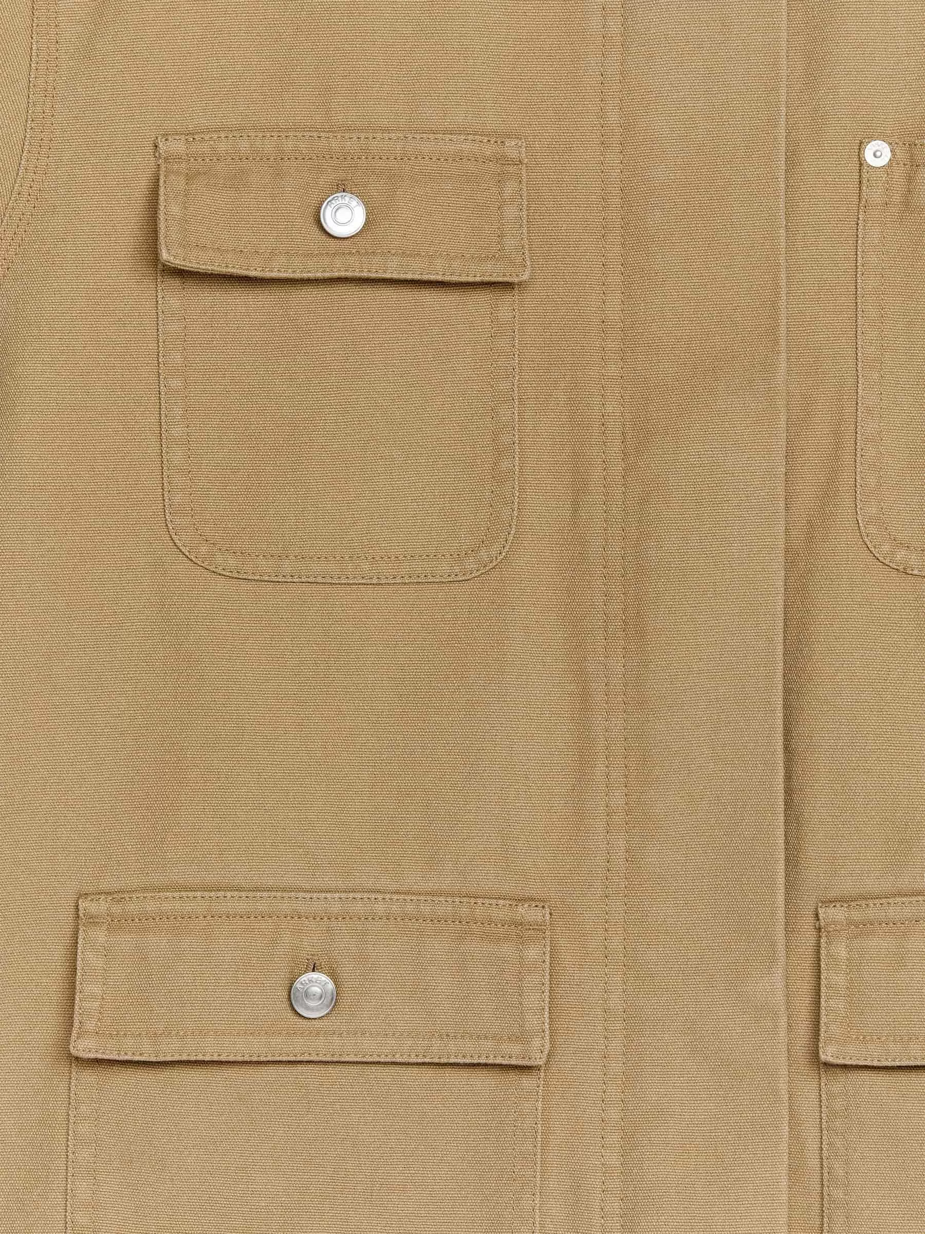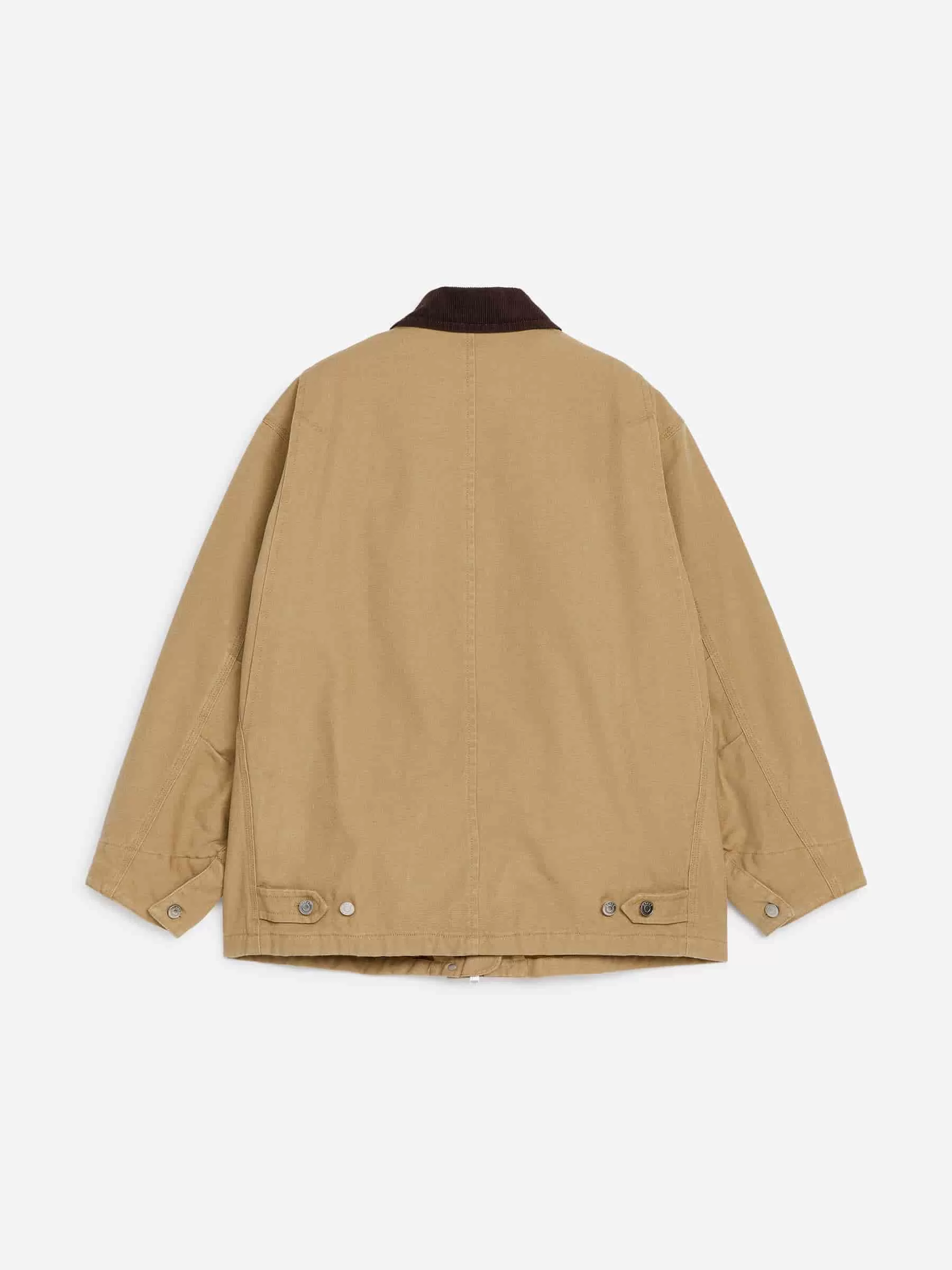 Chaqueta de inspiración workwear confeccionada en tejido de lona lavada a la piedra. Se trata de un modelo acolchado con cuello de pana, cremallera metálica de dos direcciones en la parte delantera y bolsillos de parche con botones.