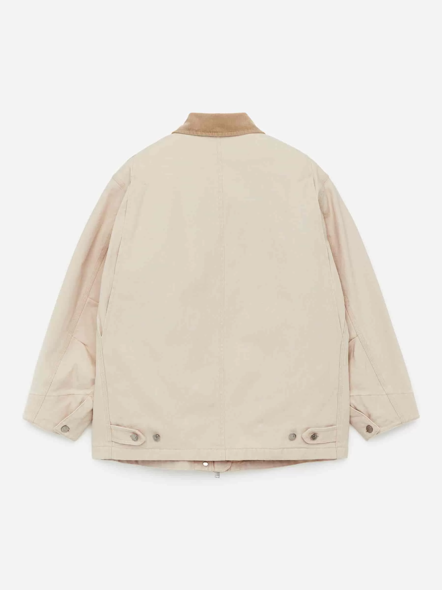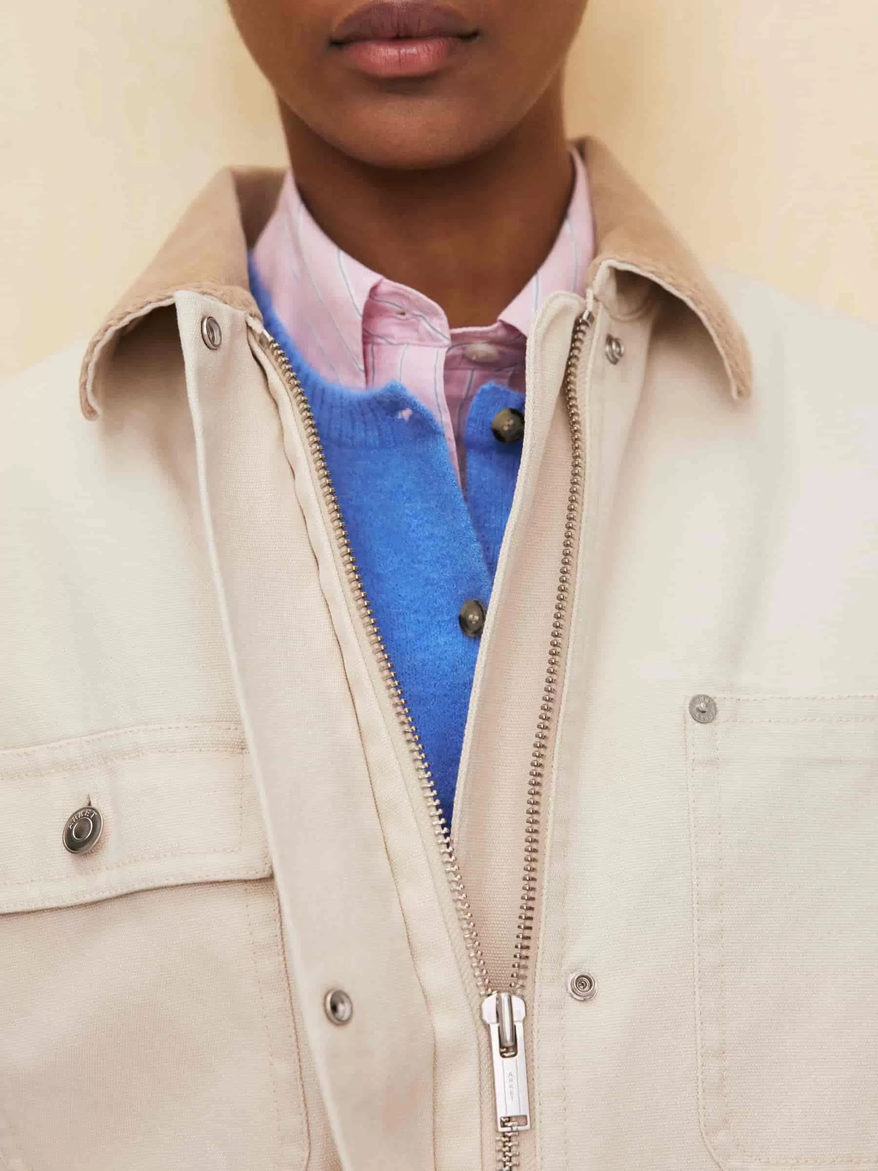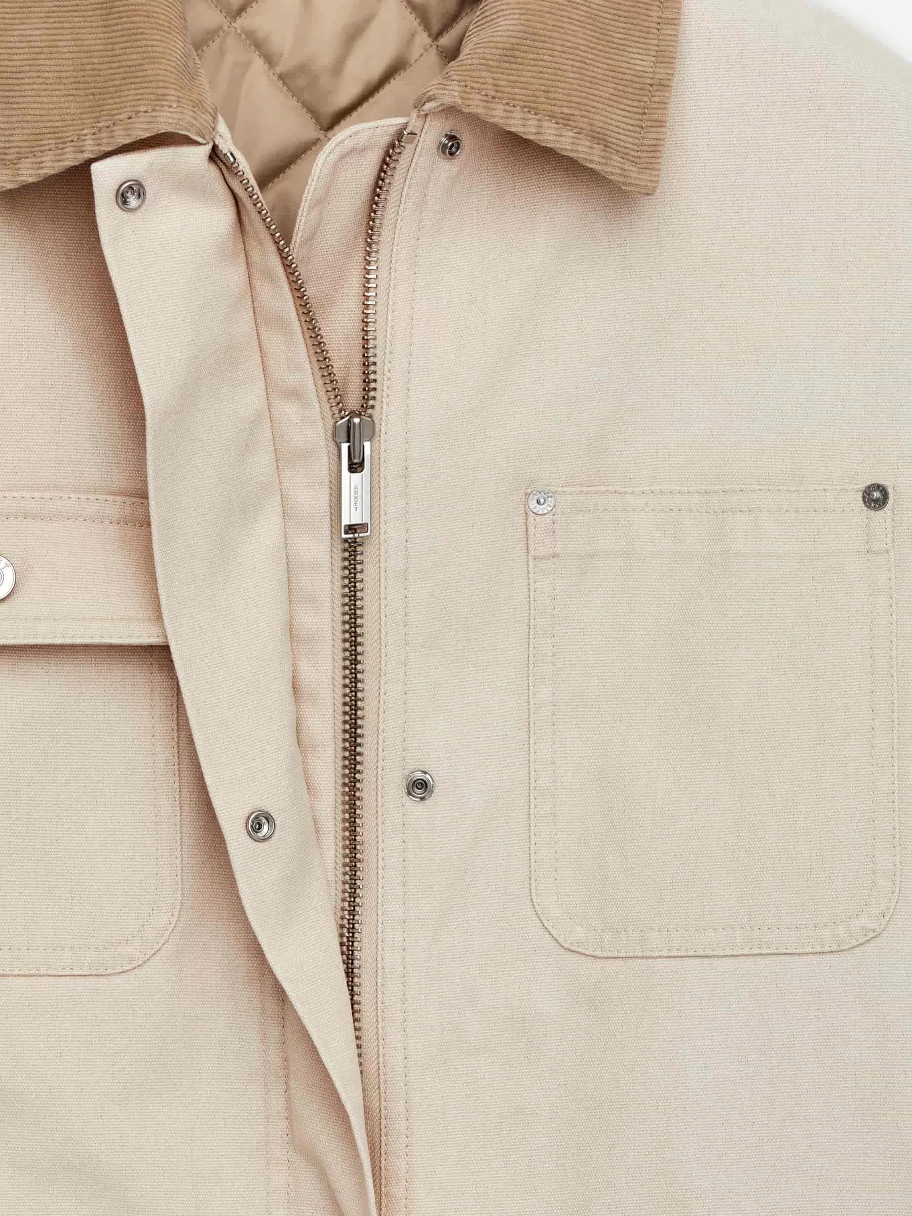 Chaqueta de inspiración workwear confeccionada en tejido de lona lavada a la piedra. Se trata de un modelo acolchado con cuello de pana, cremallera metálica de dos direcciones en la parte delantera y bolsillos de parche con botones.
