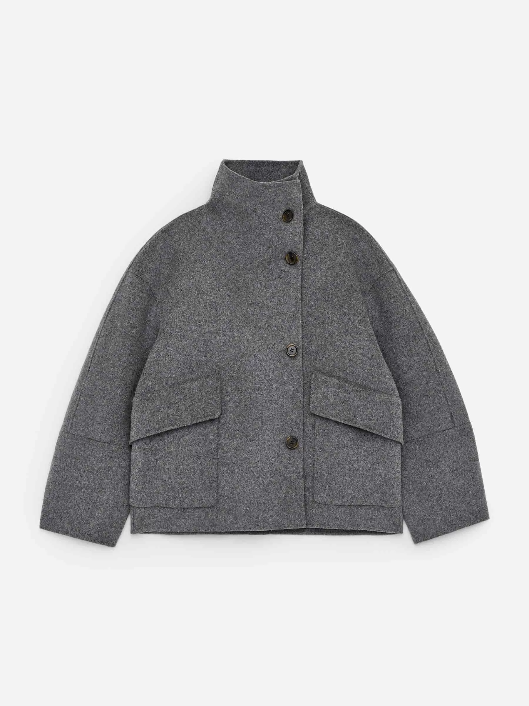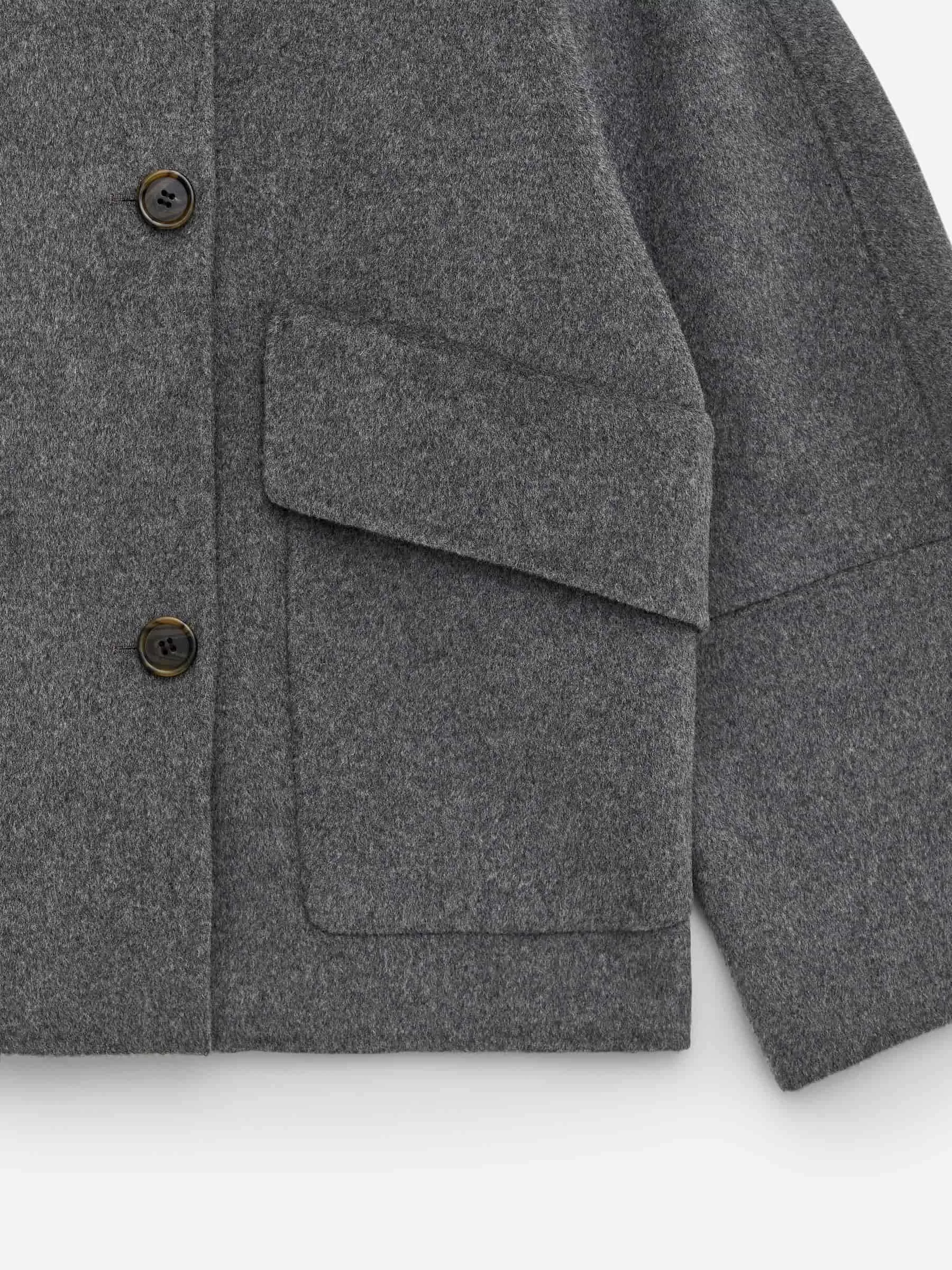 Chaqueta confeccionada en tejido mixto lana doble faz. Diseñado con cuello alto, cierre de botón y bolsillos de parche inclinados con solapas en la parte delantera. La chaqueta contiene 80% lana RWS (TE-00047206). Los productos certificados según el Estándar de Lana Responsable (RWS) contienen fibra de lana procedente de granjas certificadas de forma independiente según los requisitos de bienestar animal y gestión de la tierra.