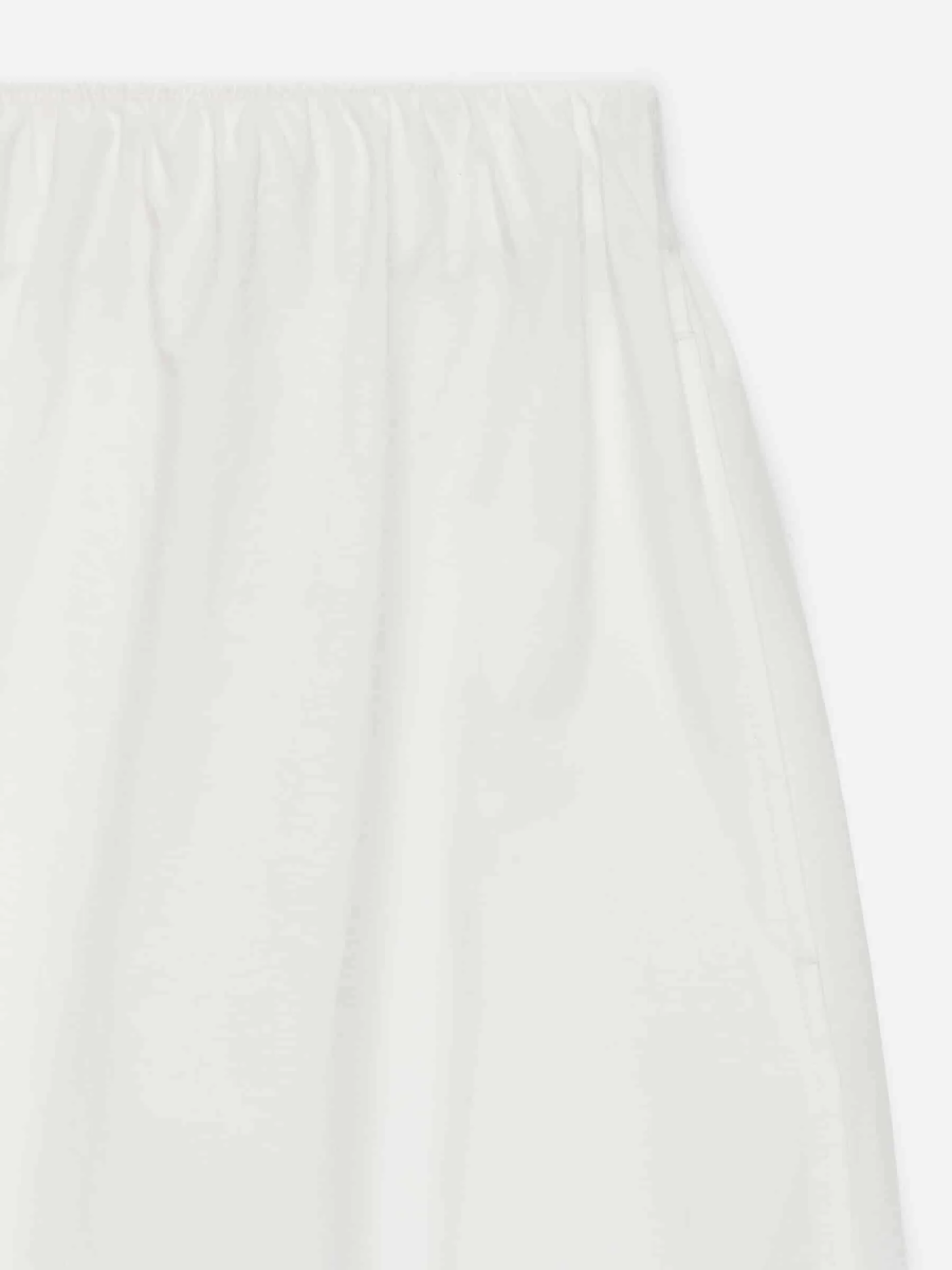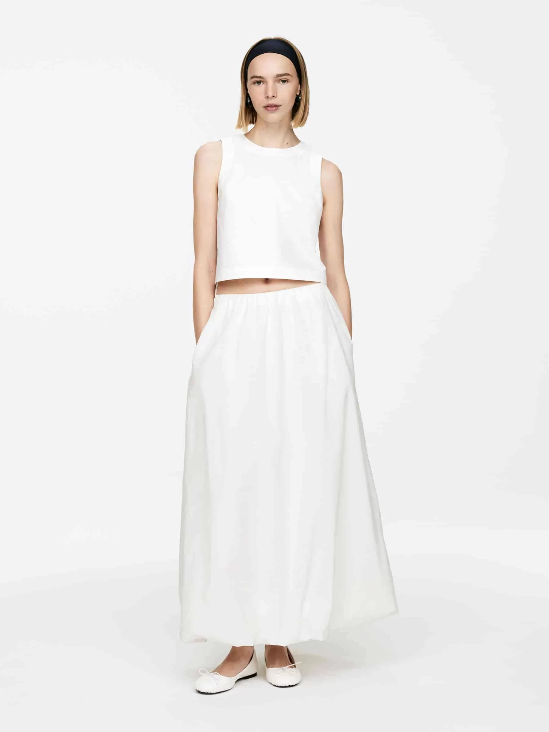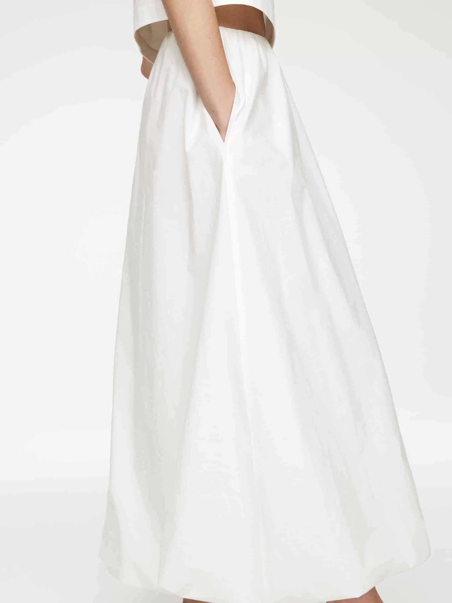 Falda larga de algodón con bajo abullonado, bolsillos laterales y elásticos en cintura.