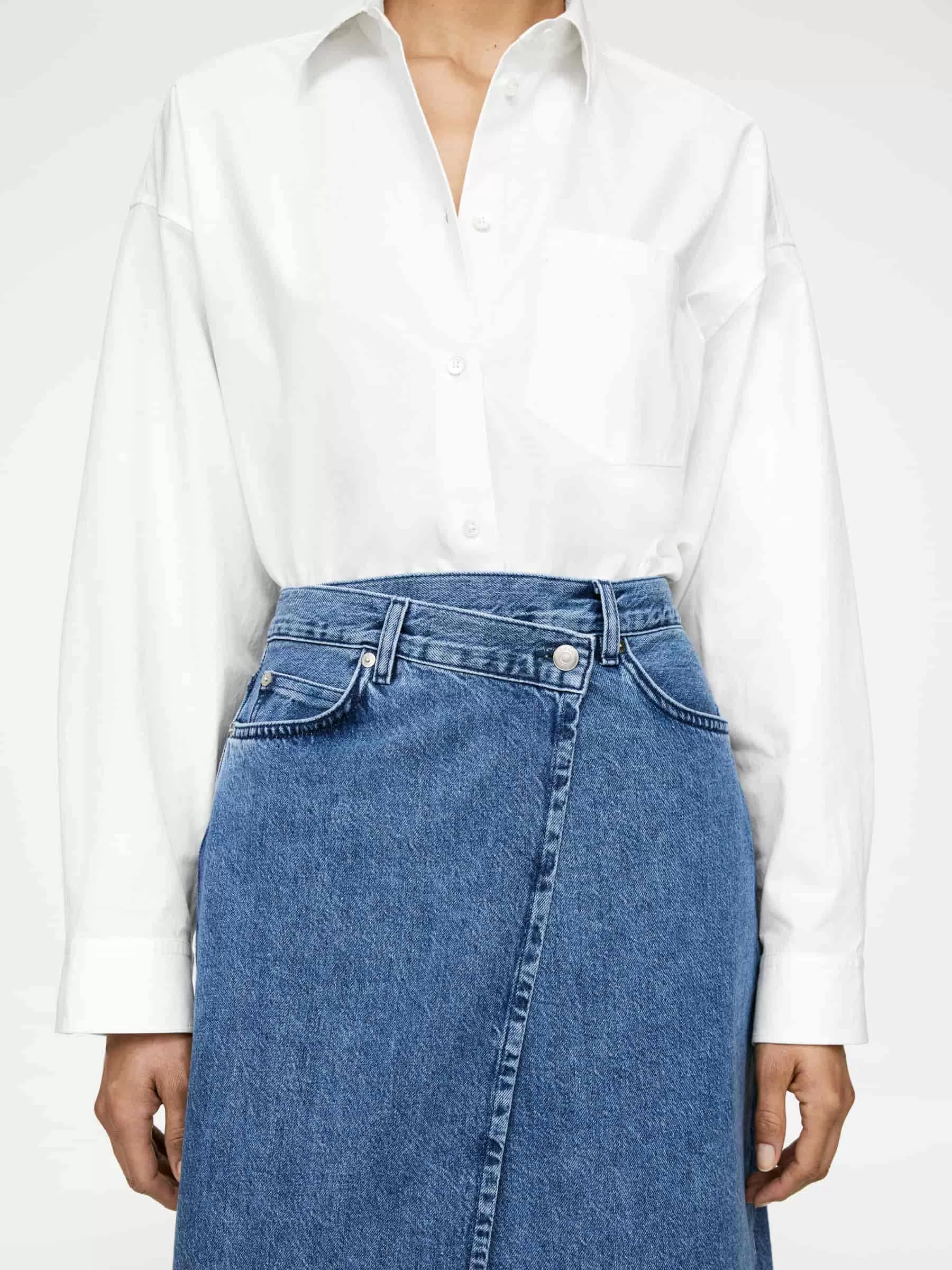 Falda cruzada de cintura alta con bajo asimétrico y cierre de botones. Confeccionado con denim de peso medio hecho de algodón.
