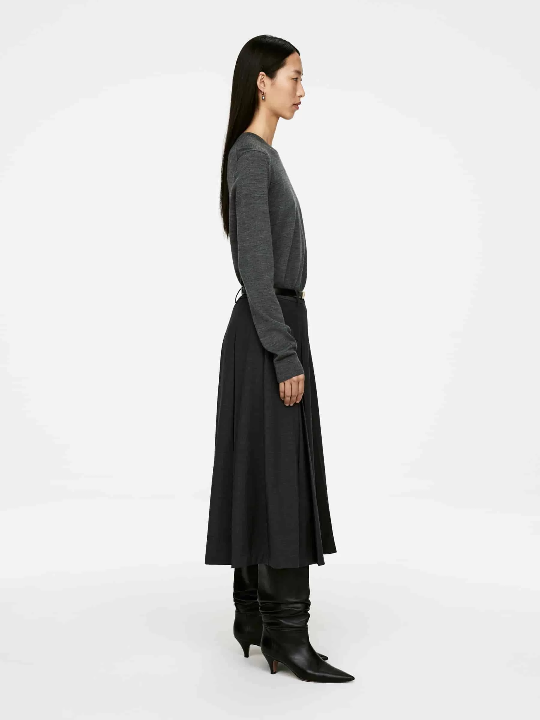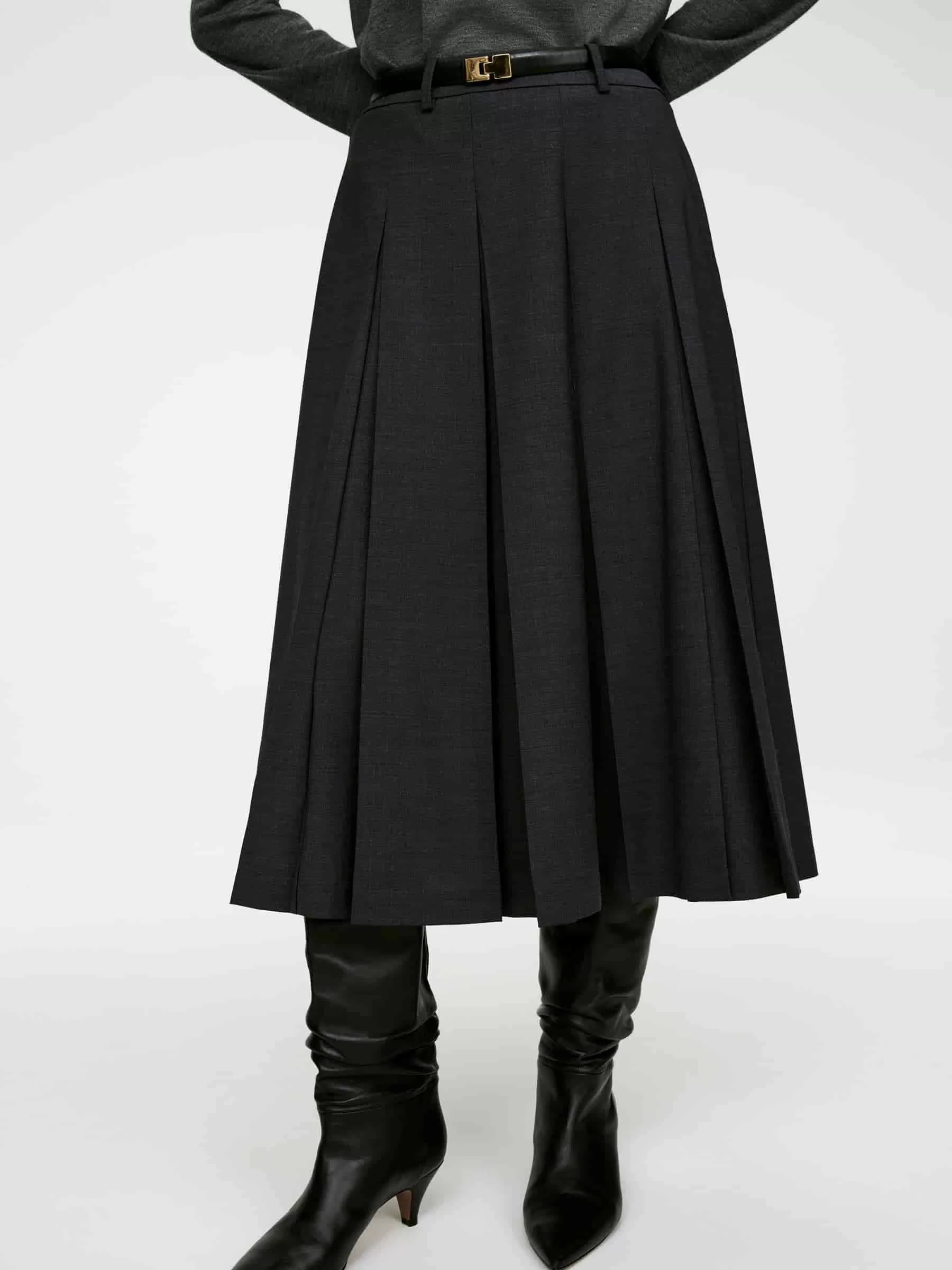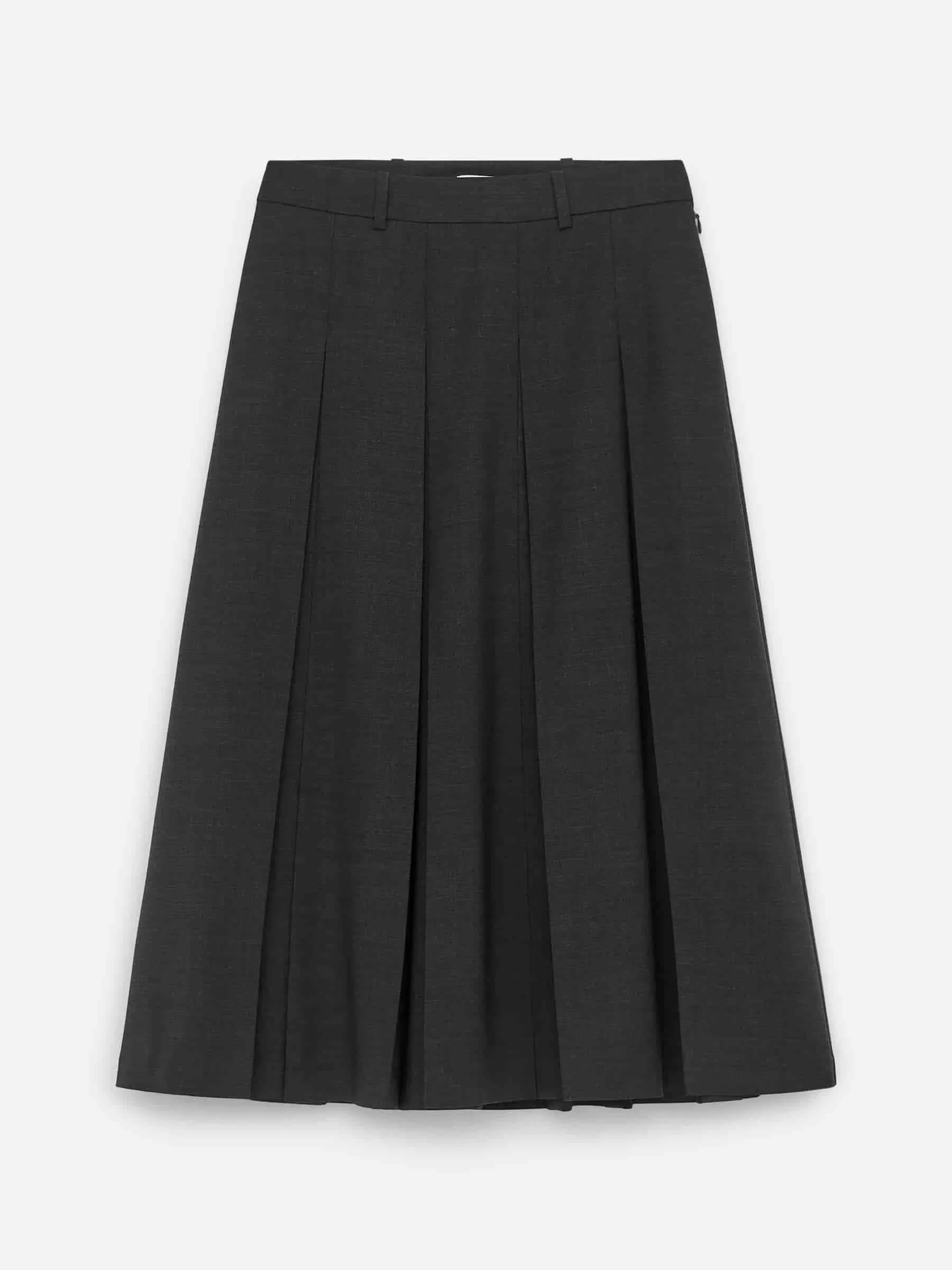 Falda plisada confeccionada en una mezcla de lana elástica. Cinturilla con trabillas para cinturón. Cierre de cremallera oculta, botón y corchete en la costura lateral. Forrado. El producto contiene 47% lana RWS (TE-00047206). Los productos certificados según el Estándar de Lana Responsable (RWS) contienen fibra de lana procedente de granjas certificadas de forma independiente según los requisitos de bienestar animal y gestión de la tierra.