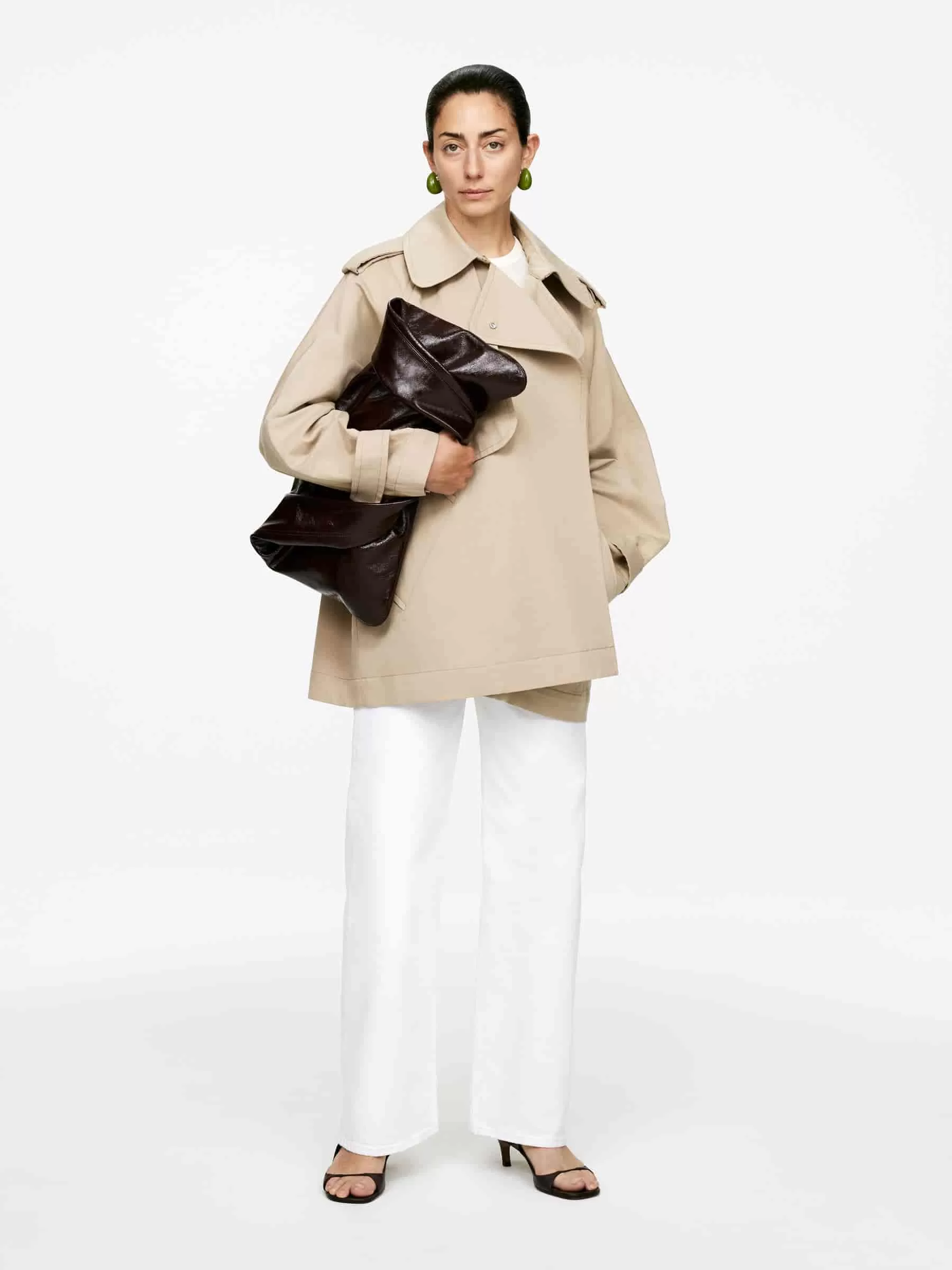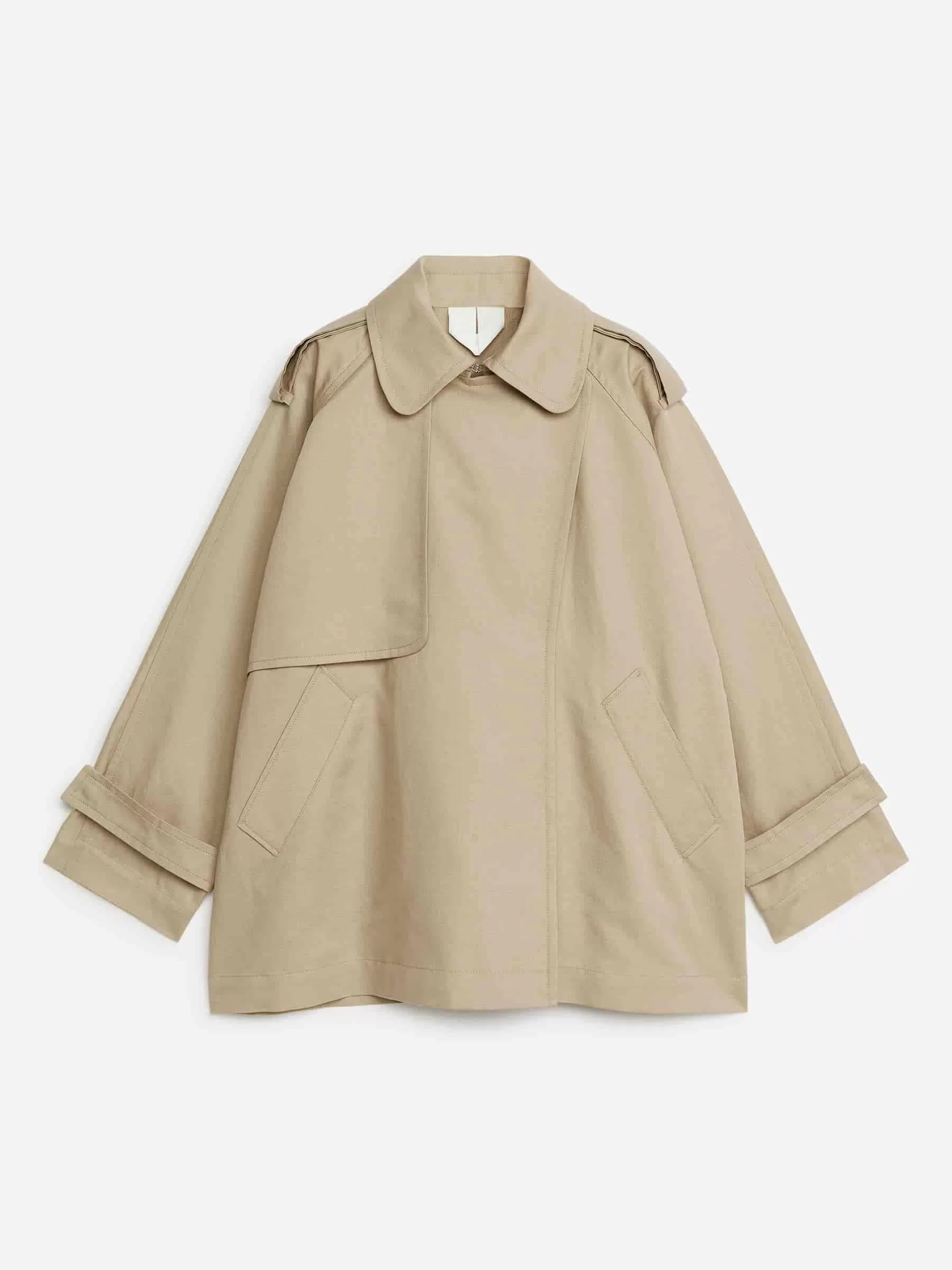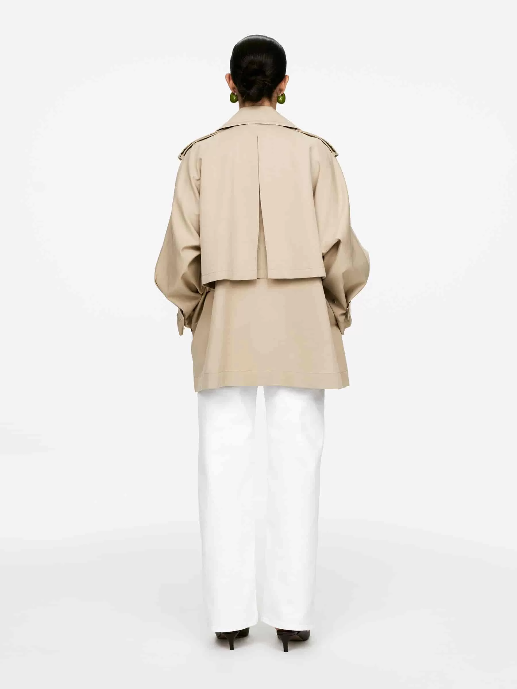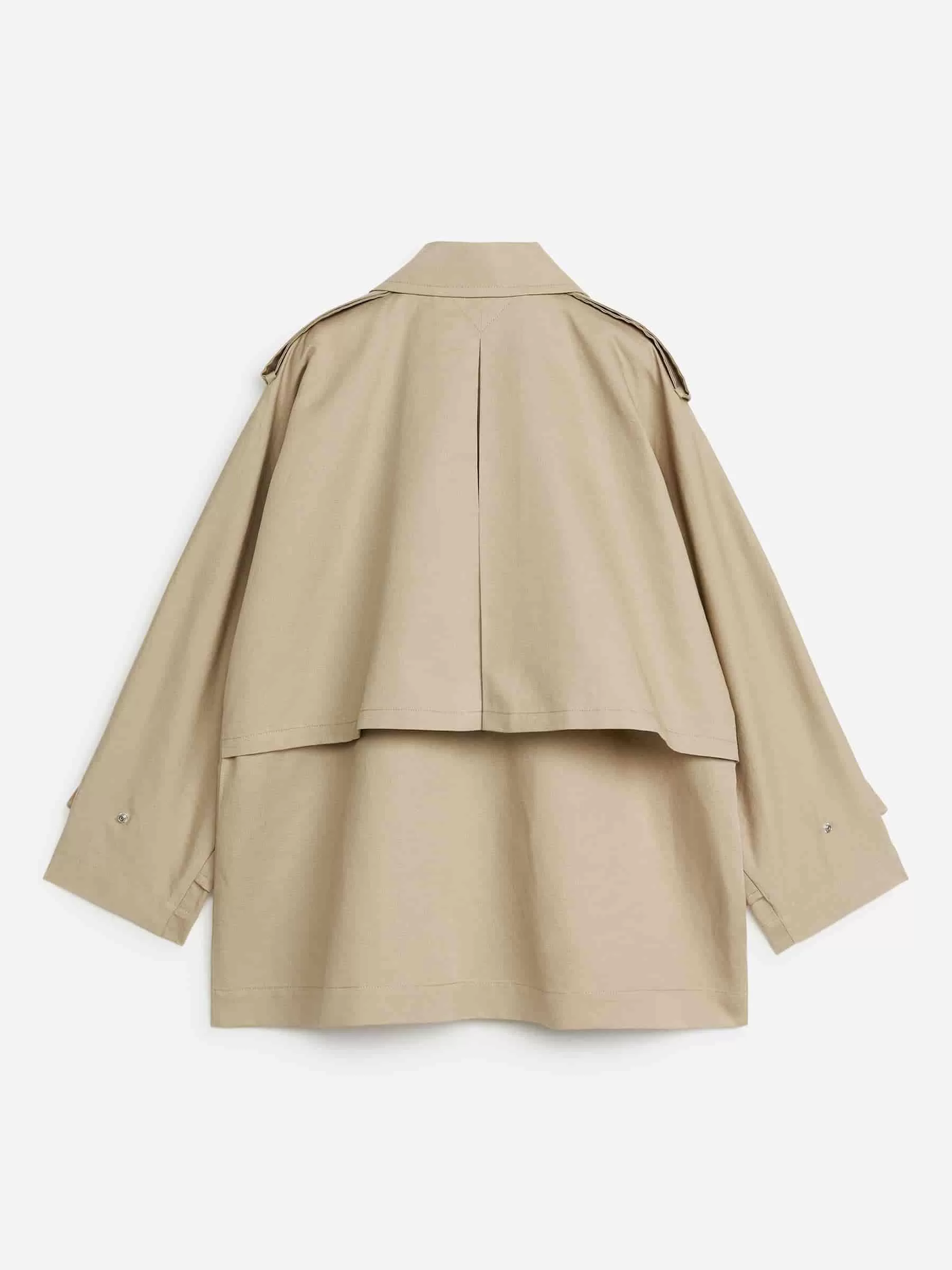 Esta versión corta, una nueva versión de la icónica gabardina, se presenta en una mezcla de lino y algodón tejida en sarga. El abrigo ofrece una silueta voluminosa con un cierre de botón oculto y presenta detalles clásicos como charreteras en los hombros, correas en las mangas, protector contra la lluvia y solapa para armas.
