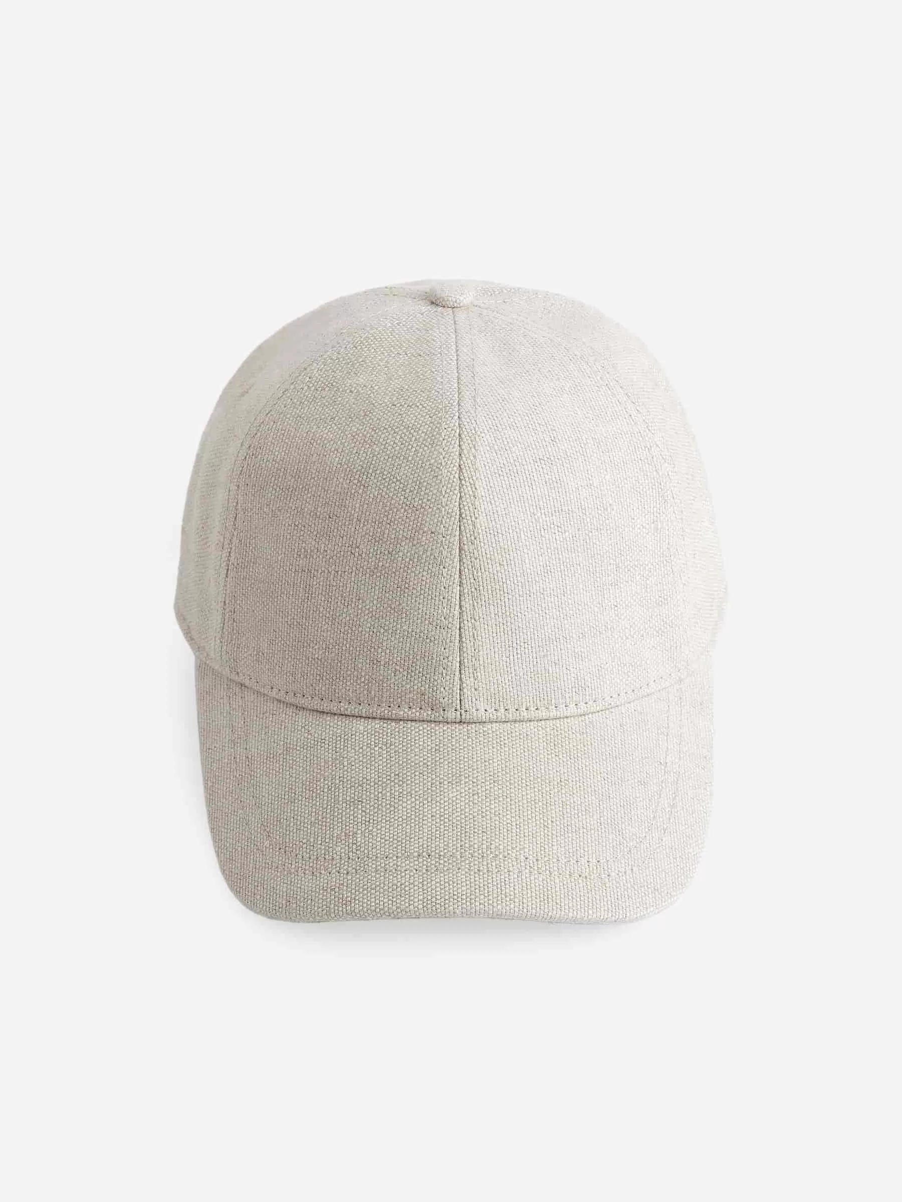 Gorra clásica de 5 paneles confeccionada en una mezcla de lino. Correa ajustable con hebilla metálica en la parte trasera.