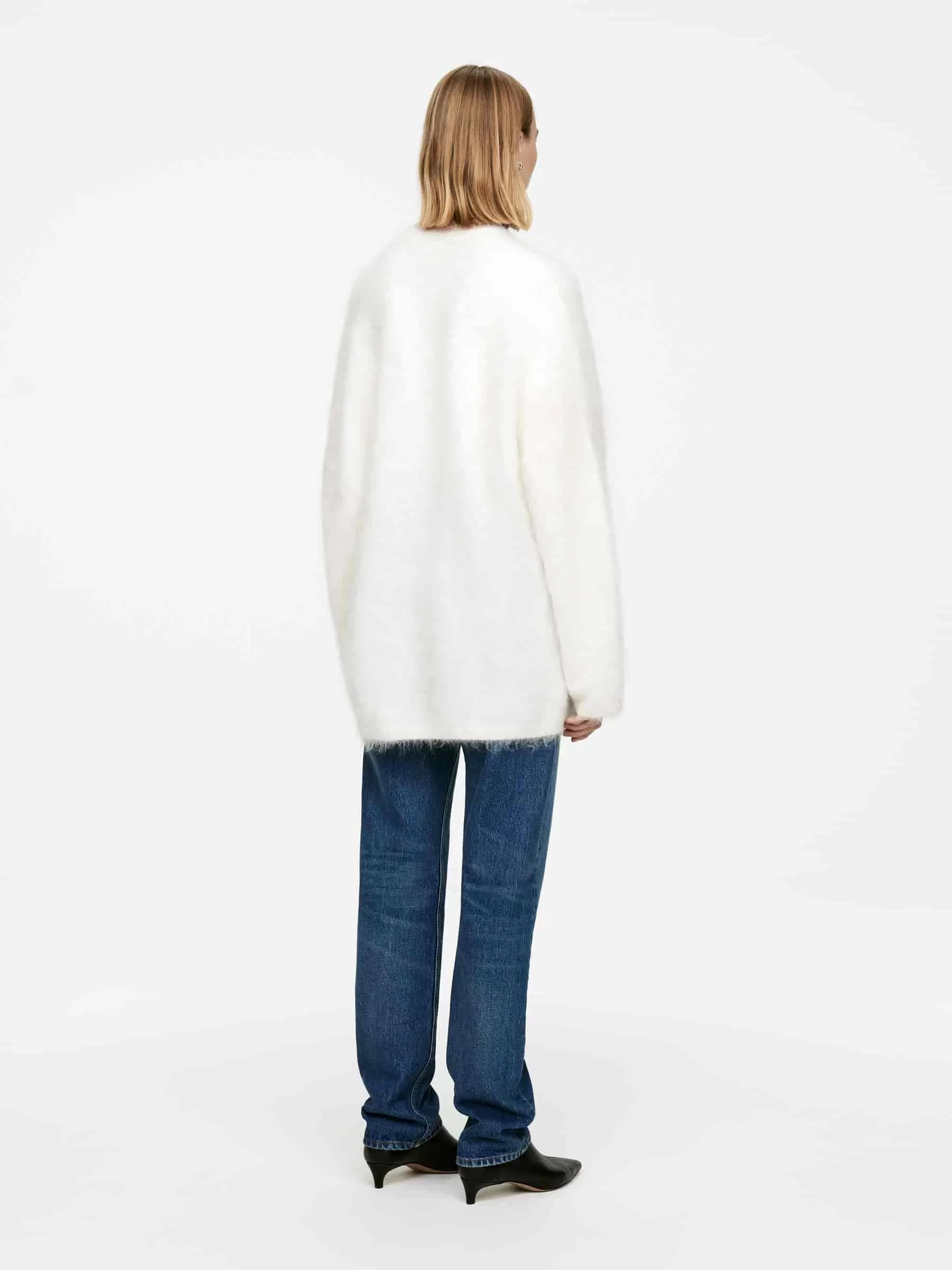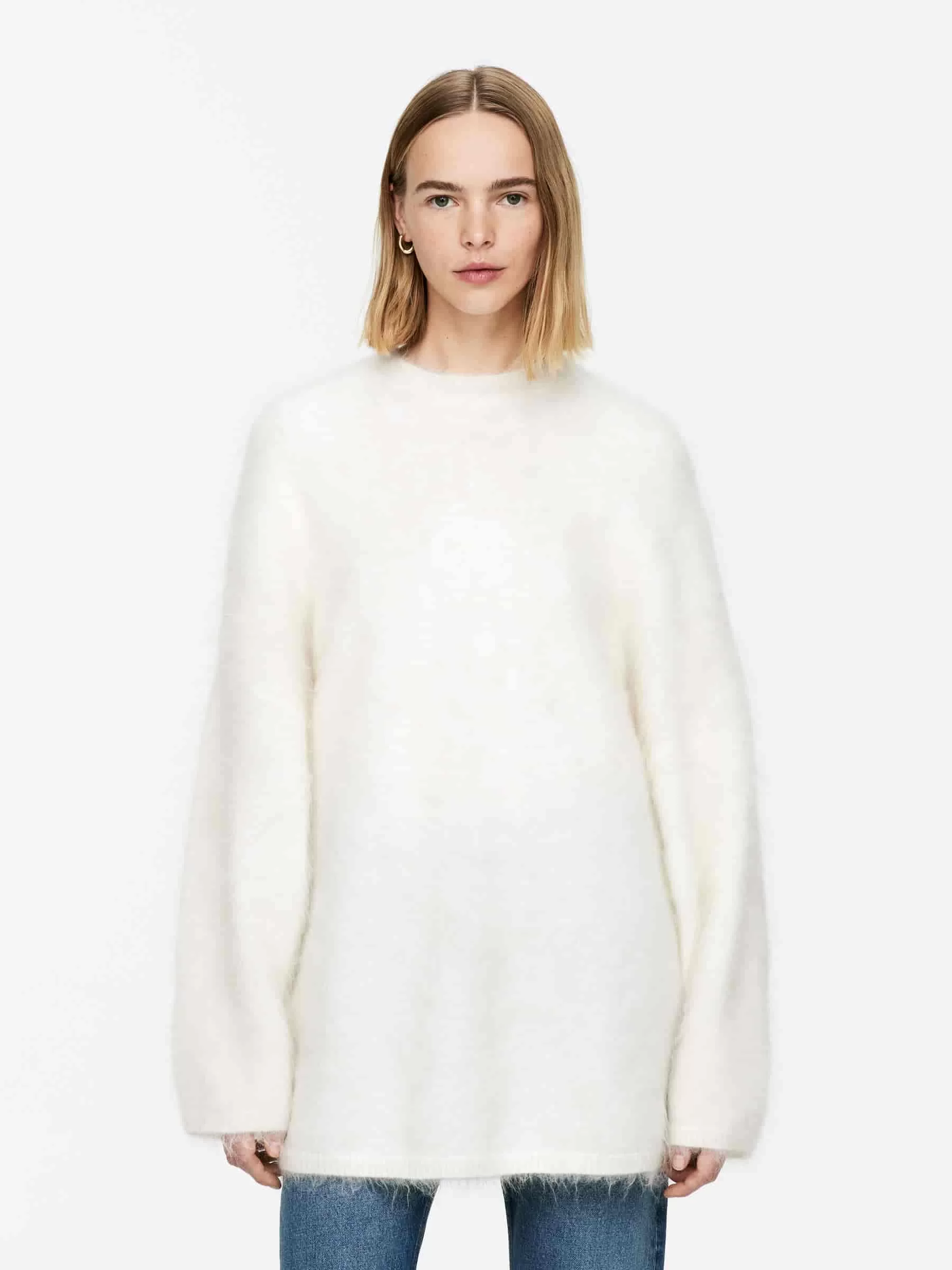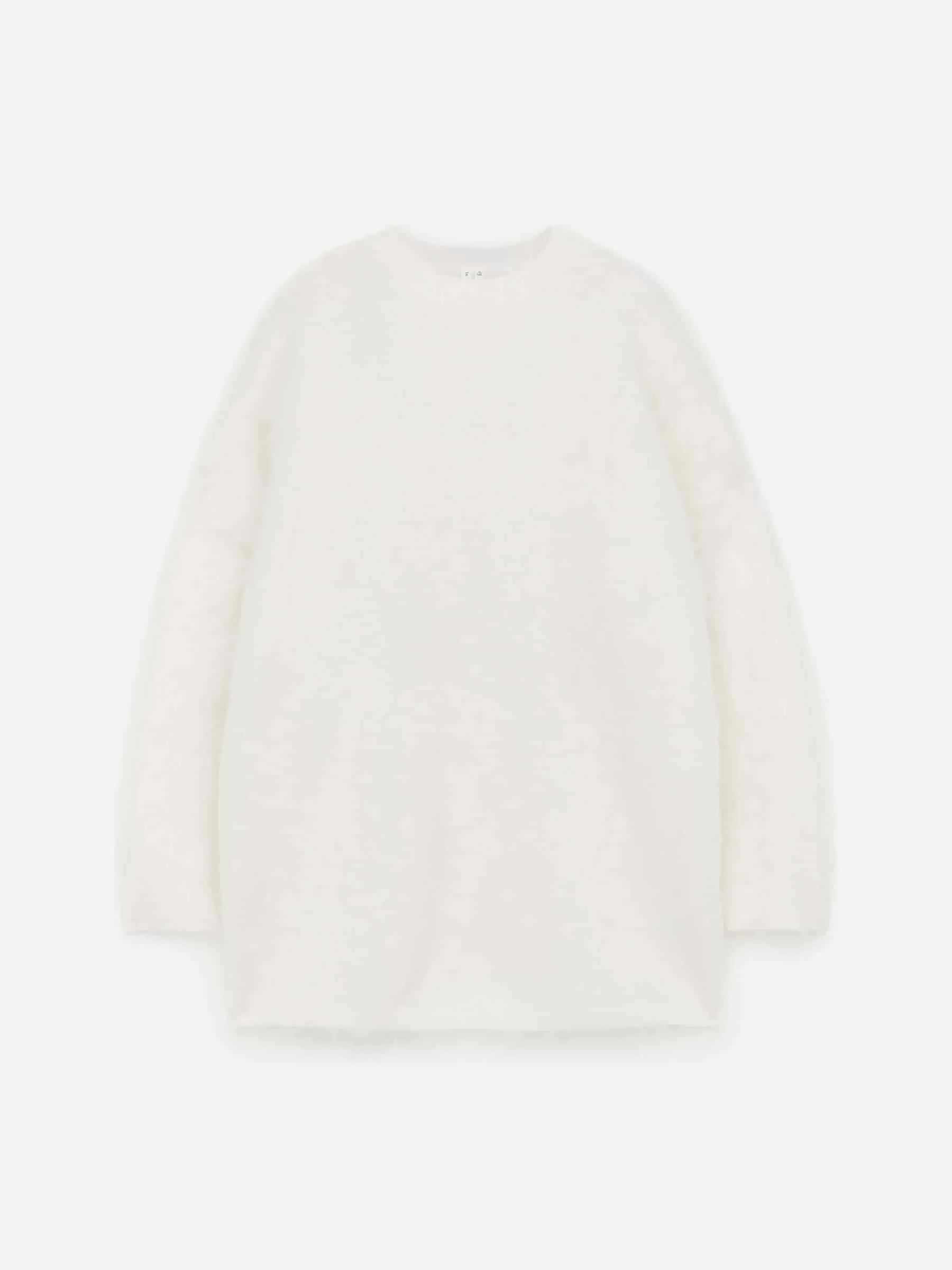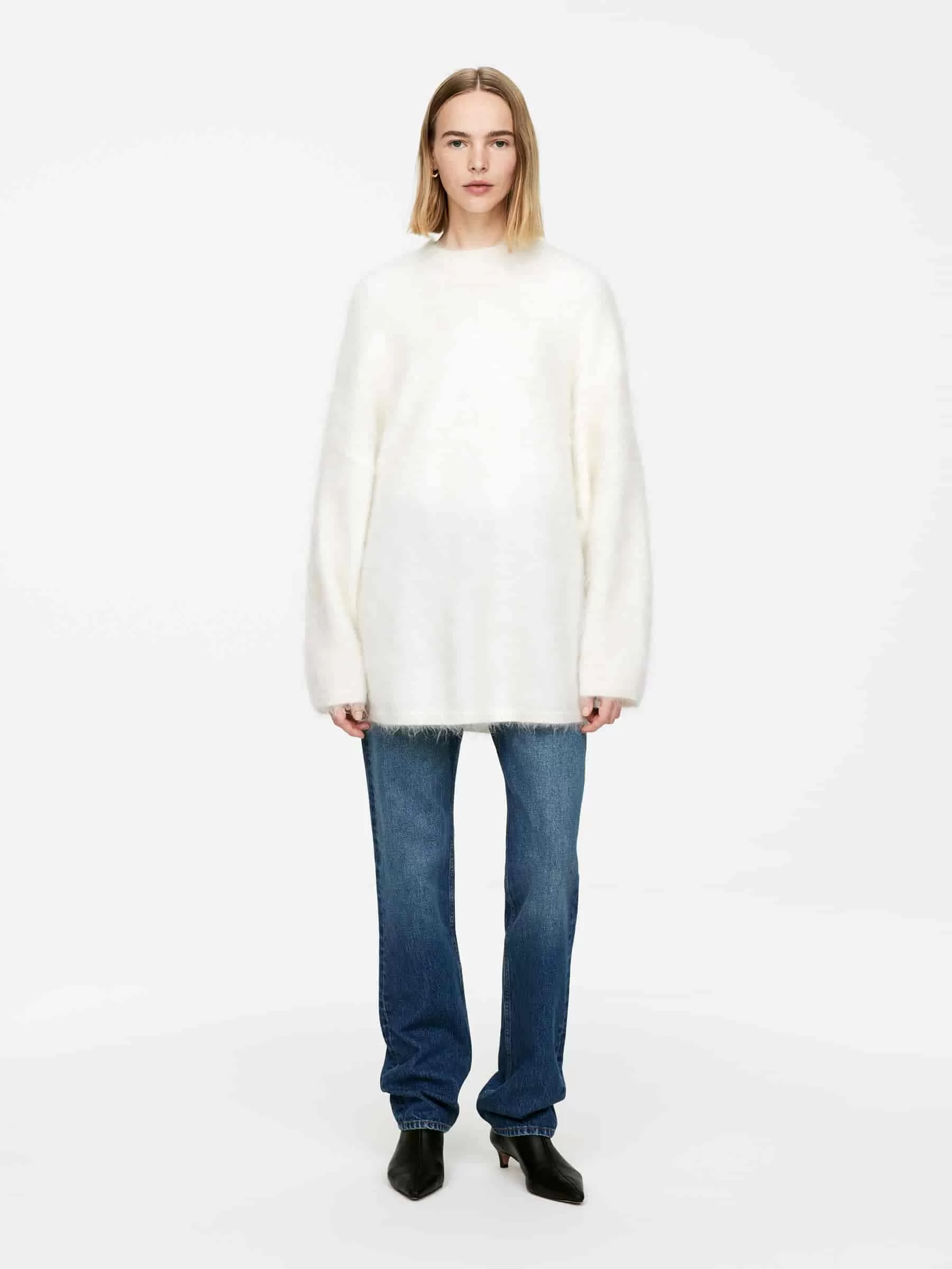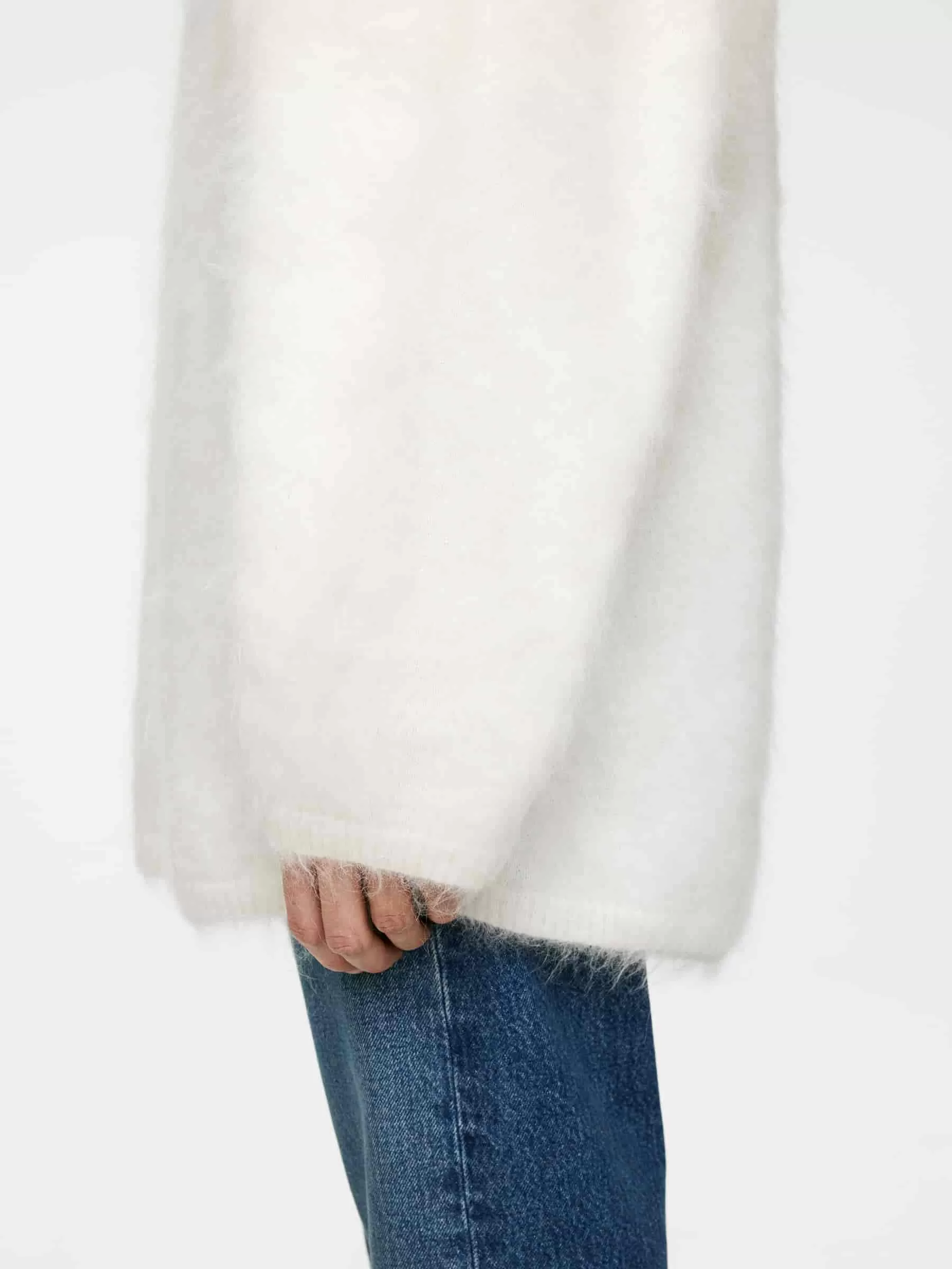 Jersey largo confeccionado en mezcla de lana y mohair. Un modelo de punto liso con cuello redondo y corte oversize. Este jersey contiene 45% RMS Mohair y 17% lana RWS (TE-00047206). Los productos certificados según el Estándar de lana responsable (RWS) y el Estándar de mohair responsable (RMS) contienen lana y fibra de mohair de granjas certificadas de forma independiente según los requisitos de bienestar animal y gestión de la tierra.