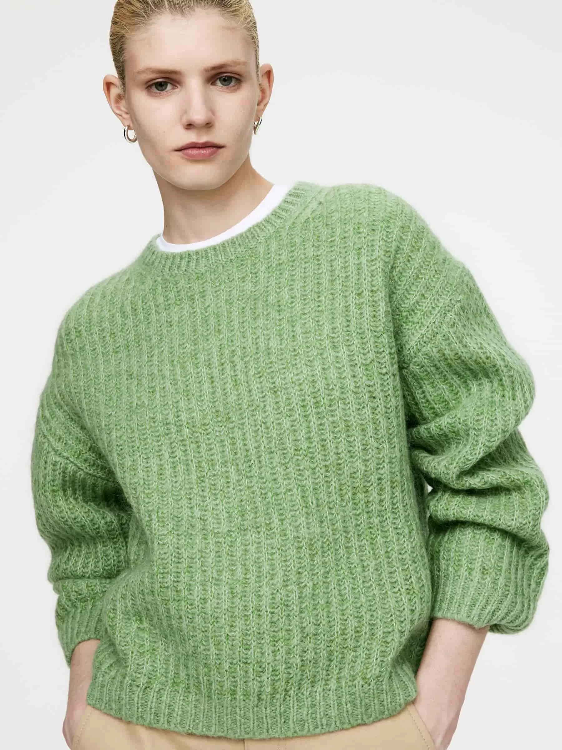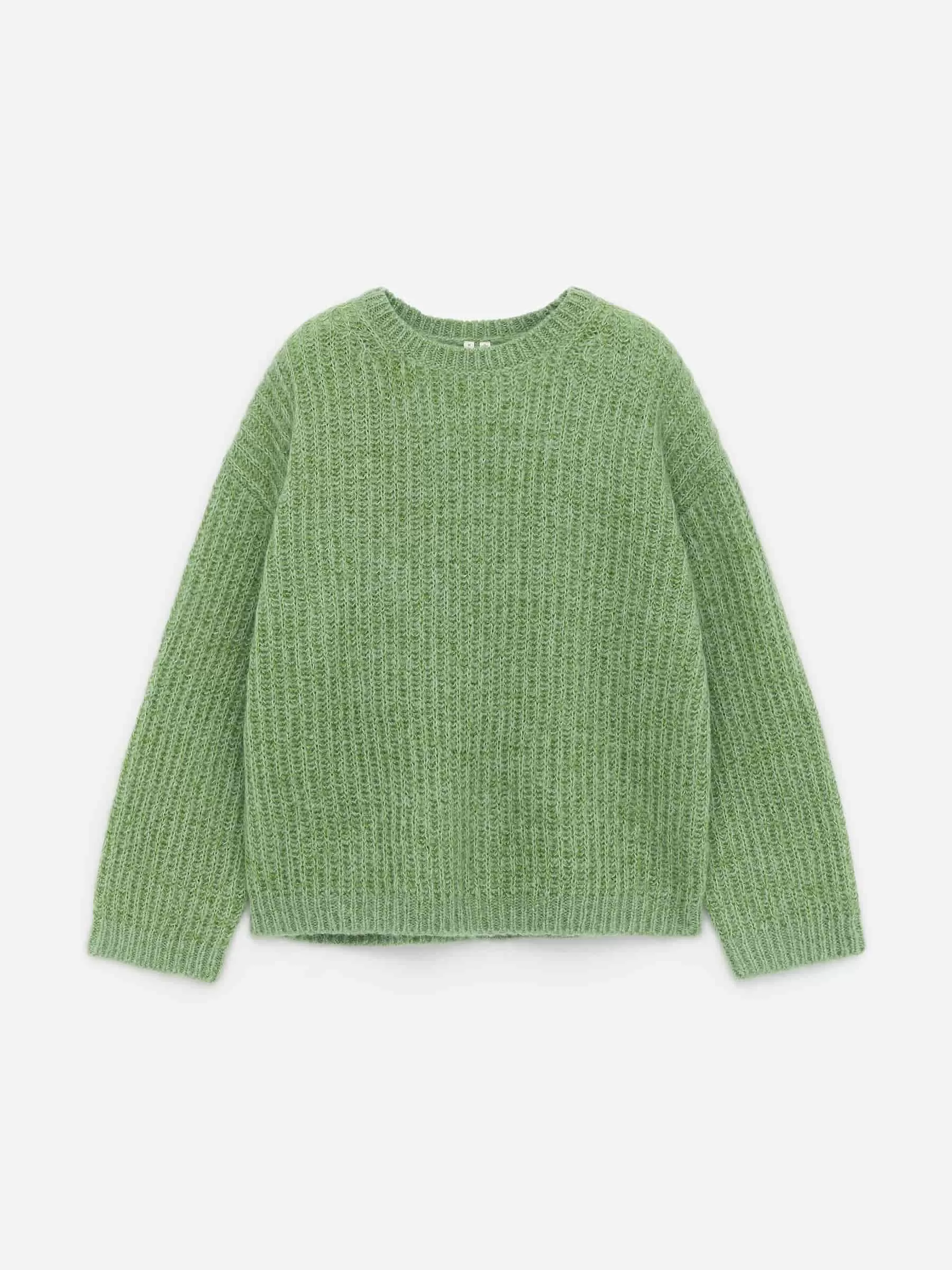 Jersey confeccionado en mezcla de lana y mohair. Ribetes de canalé y corte holgado. Este estilo contiene 23% RMS Mohair y 61% lana RWS (TE-00047206). Los productos certificados según el Estándar de lana responsable (RWS) y el Estándar de mohair responsable (RMS) contienen lana y fibra de mohair de granjas certificadas de forma independiente según los requisitos de bienestar animal y gestión de la tierra.