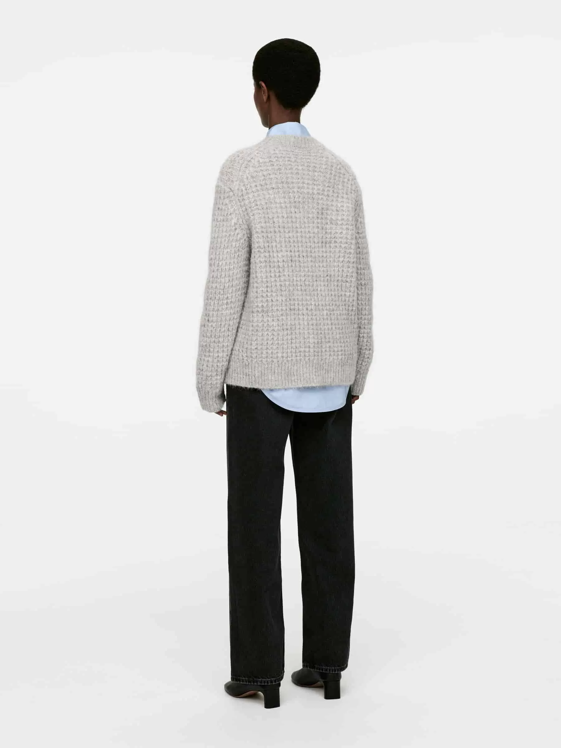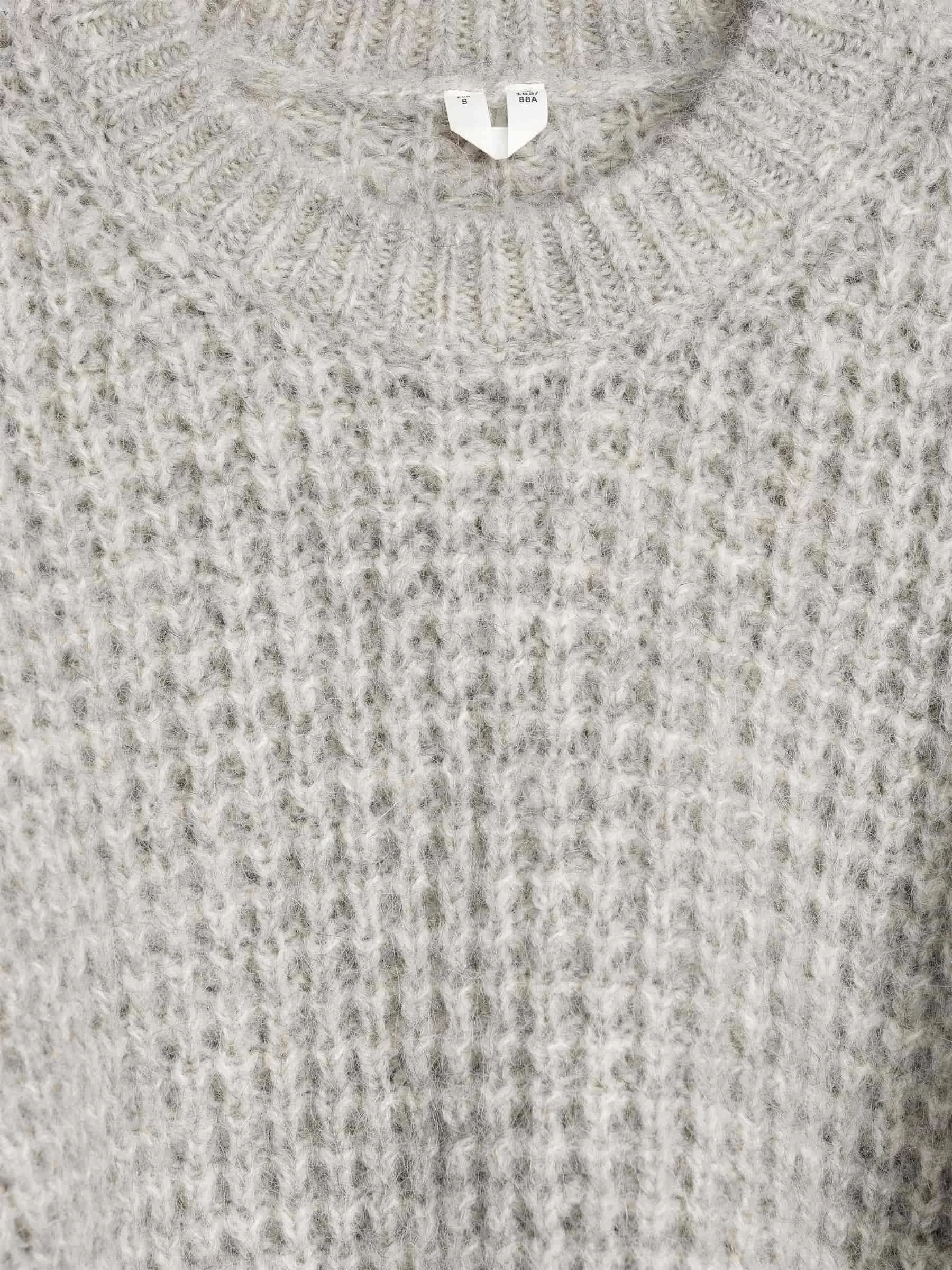 Jersey de cuello redondo confeccionado en mezcla de lana y alpaca en punto medio cardigan. Ribetes acanalados. Ajuste relajado. Este estilo contiene 44% RAS Alpaca y 56% lana RWS (TE-00047206). Los productos certificados según el Estándar de lana responsable (RWS) y el Estándar de alpaca responsable (RAS) contienen lana y fibra de alpaca de granjas certificadas de forma independiente según los requisitos de bienestar animal y gestión de la tierra.