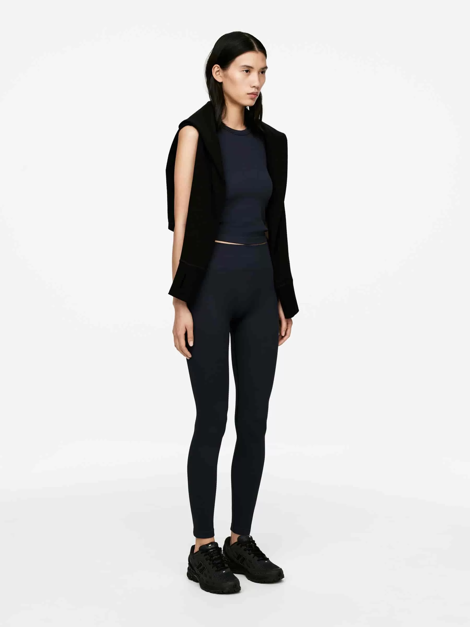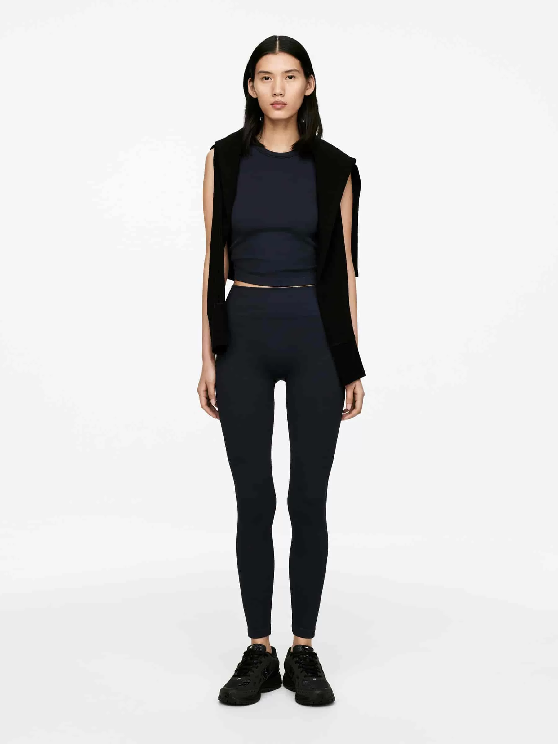 Medias sin costuras en punto de canalé confeccionadas en poliamida elástica con acabado lavado. Un estilo de cintura media, largo completo y cintura elástica. Soporte ligero. Secado rápido.