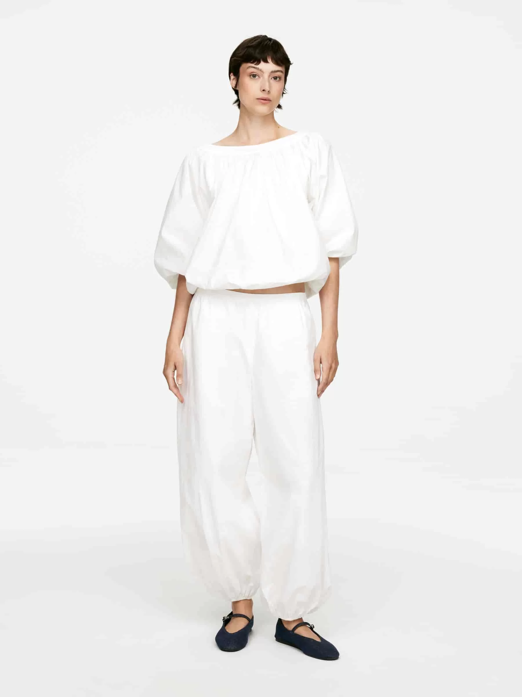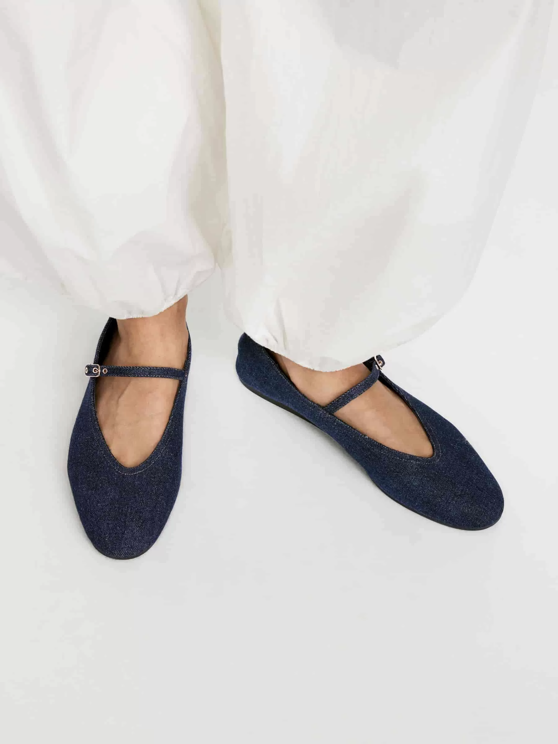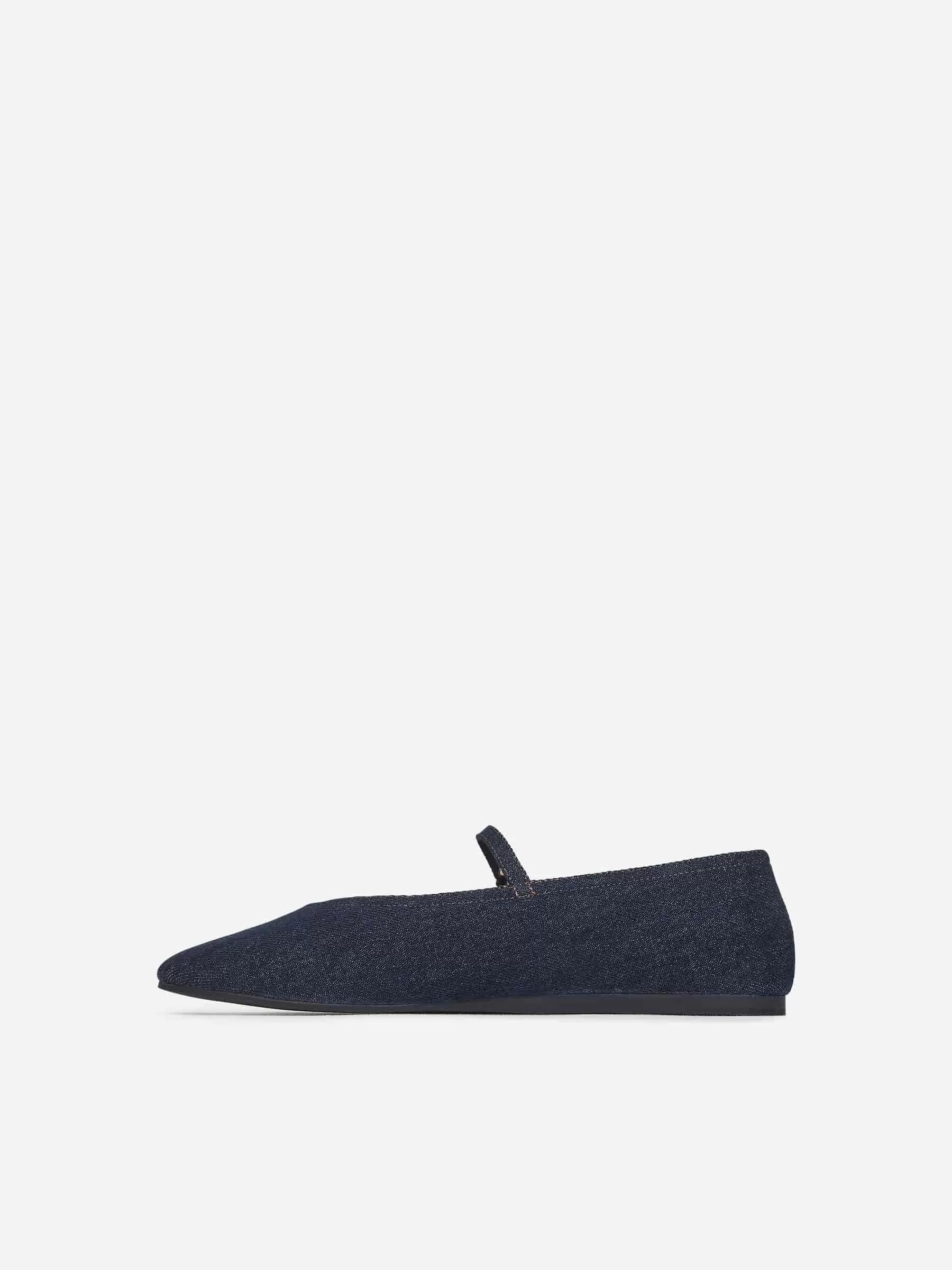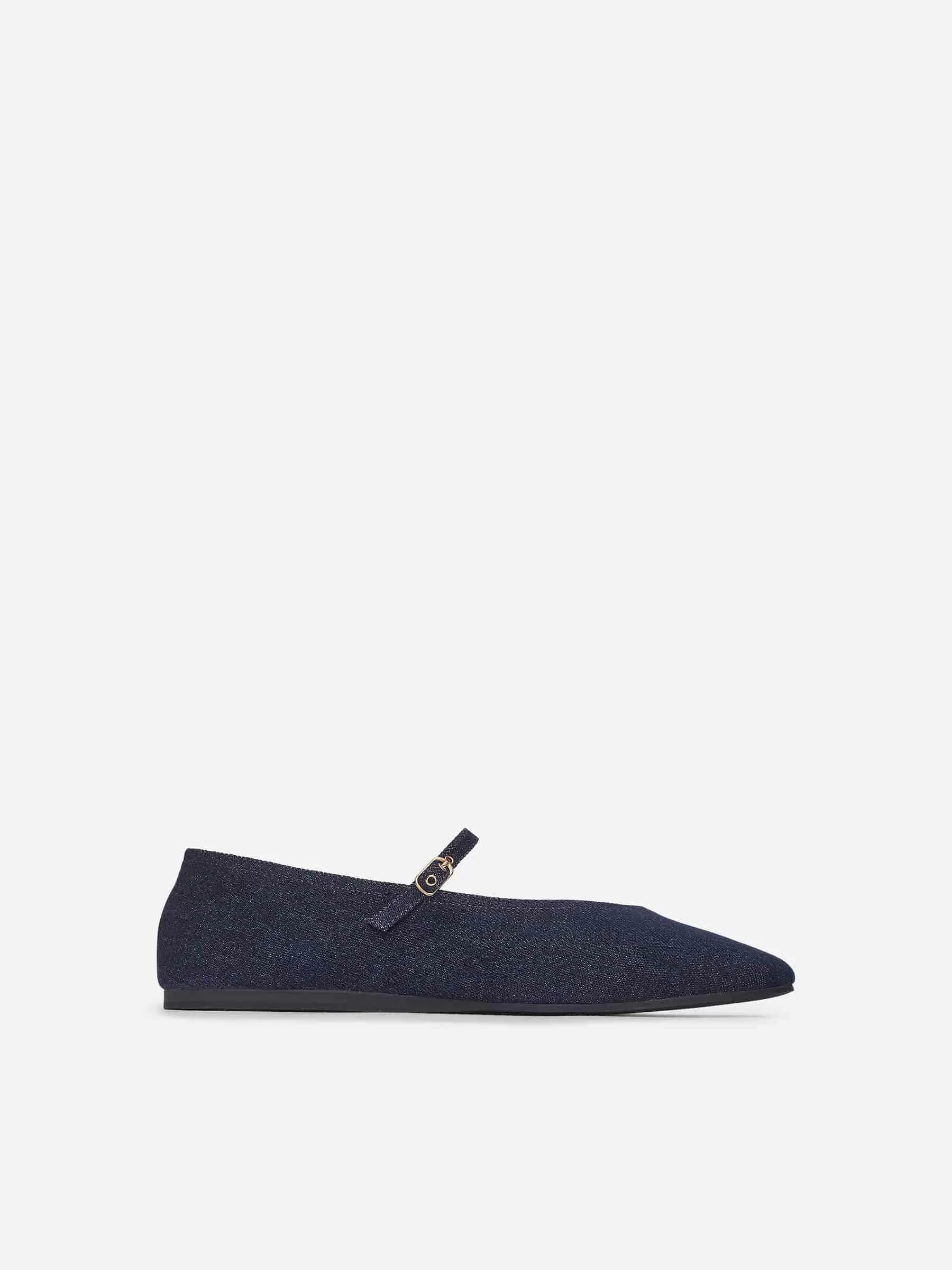 Bailarinas de mezclilla diseñadas con una puntera en forma de almendra y un empeine en forma de V. Correa delgada con delicado cierre de hebilla bañada en oro. Suela de goma fina.