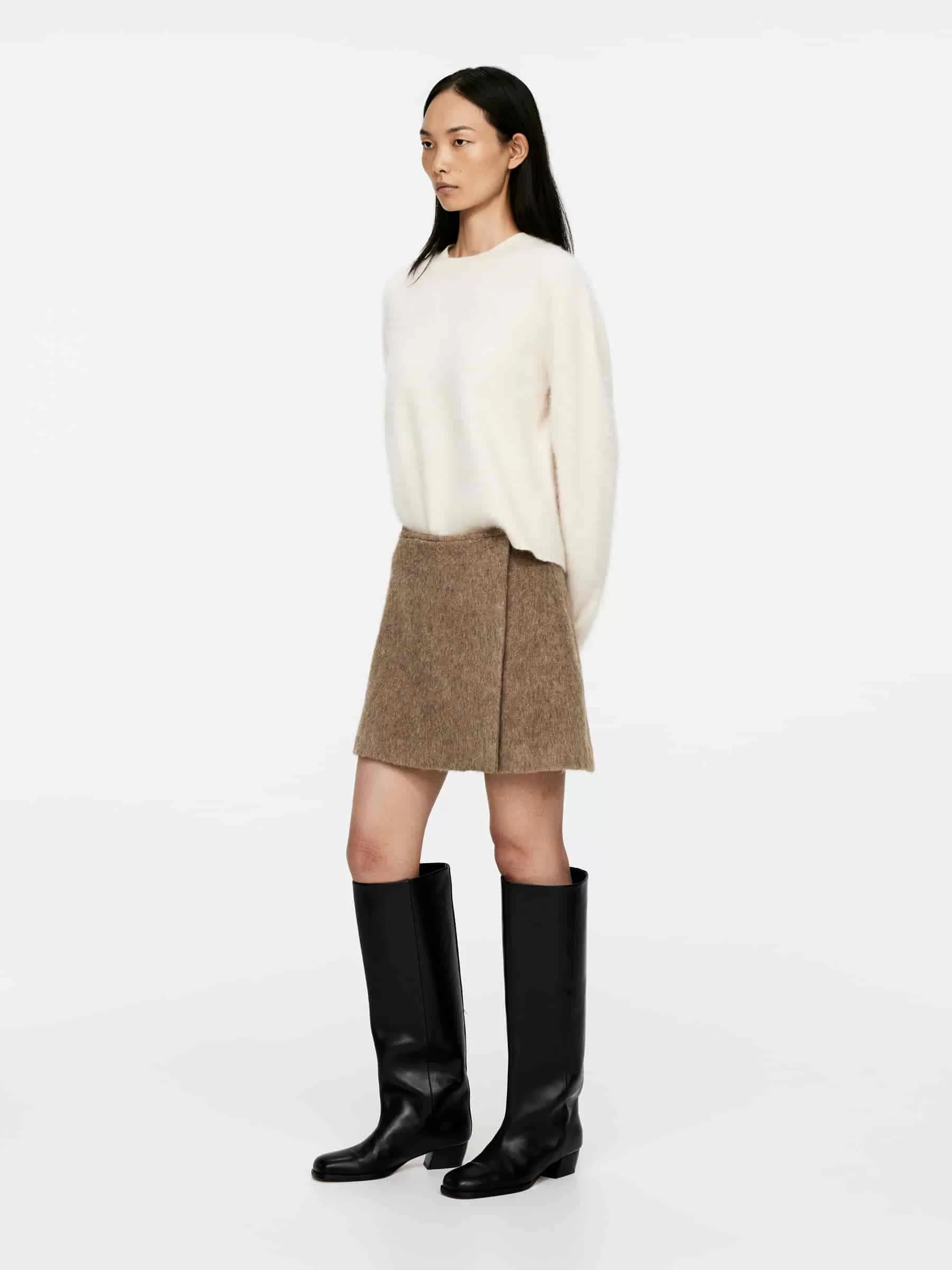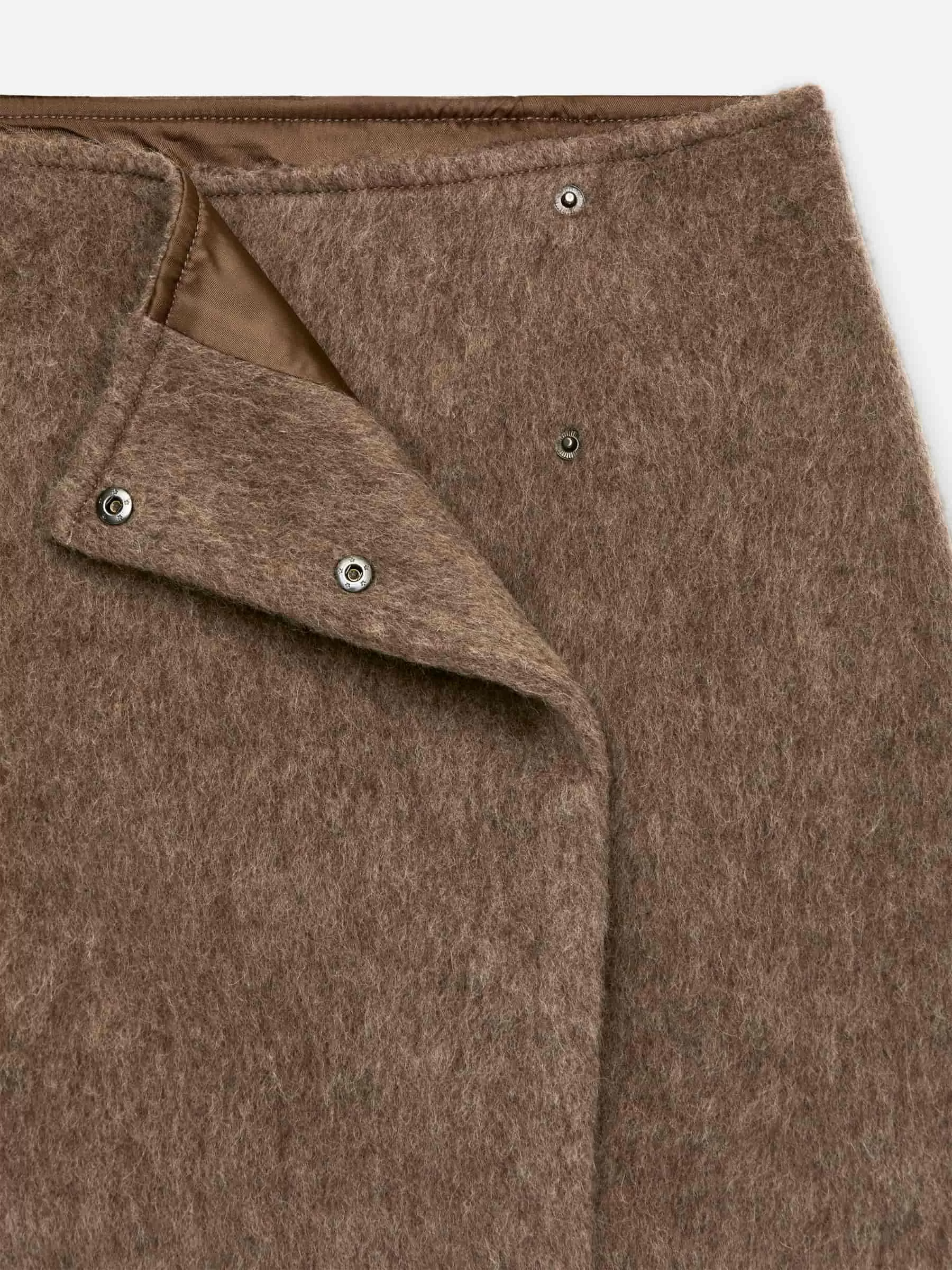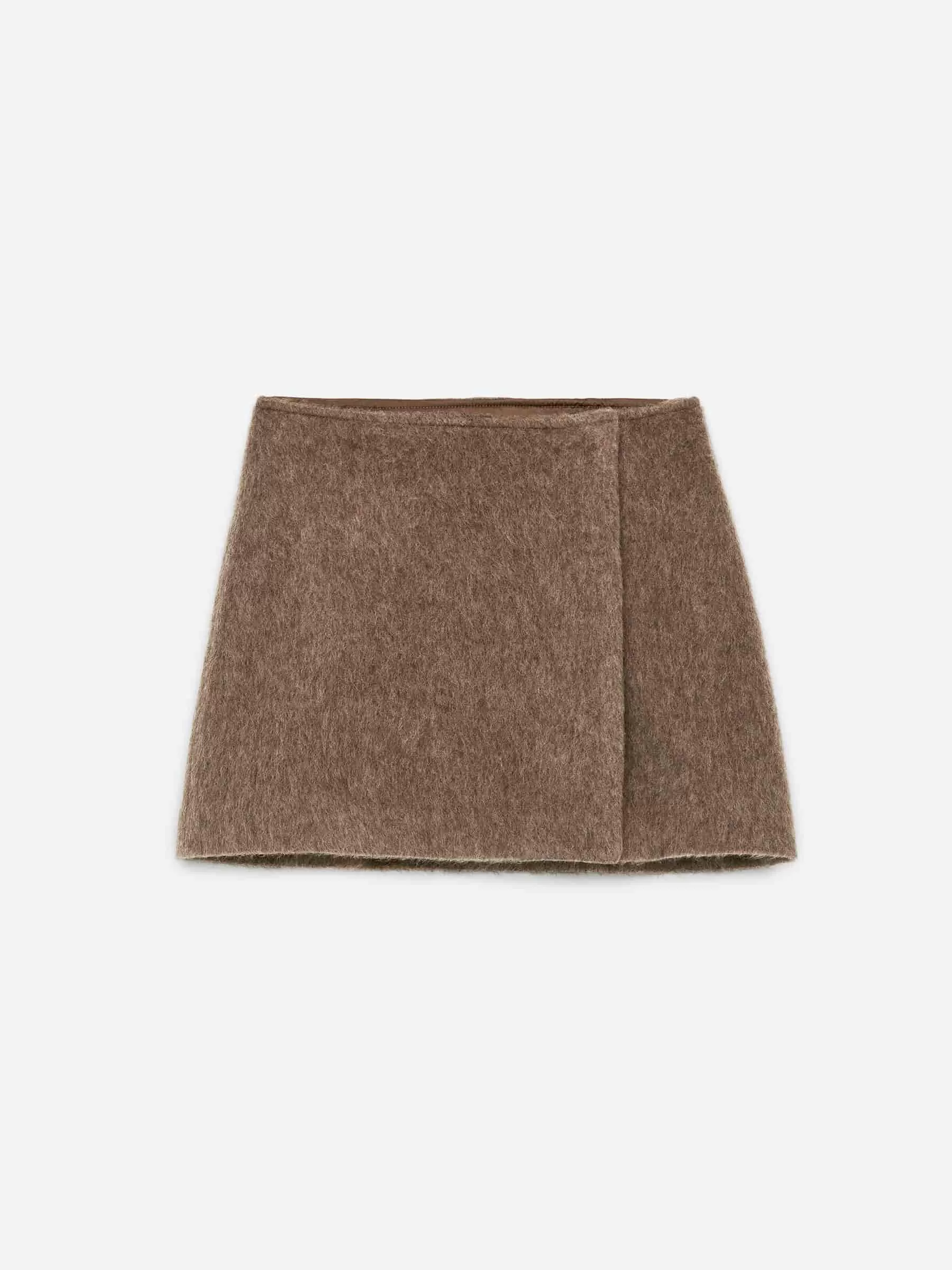 Falda corta cruzada confeccionada en mezcla de lana con superficie peluda. Cierre de botón en costura lateral y botón oculto en el borde cruzado. Totalmente forrado.
