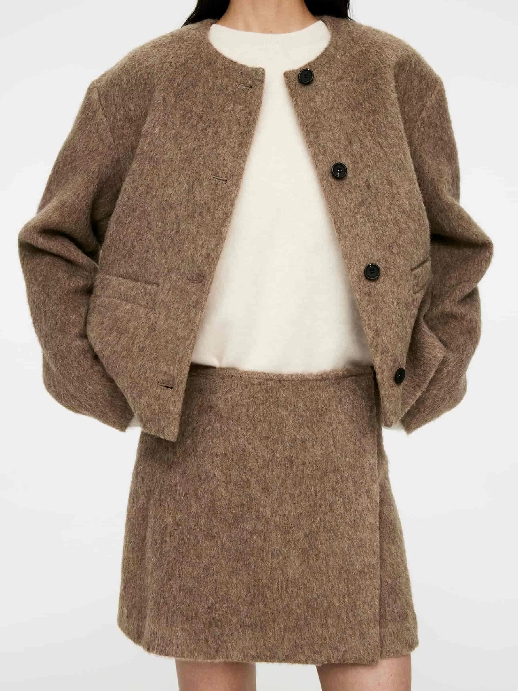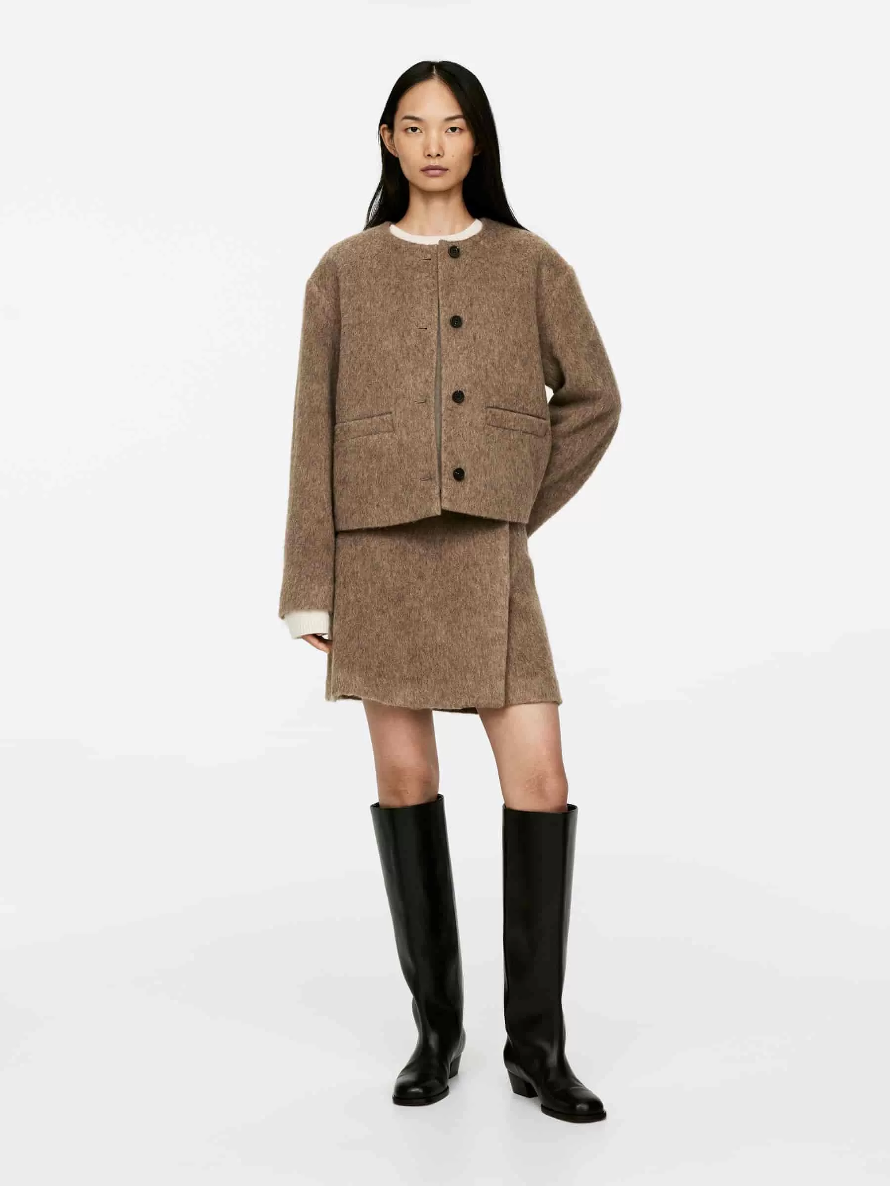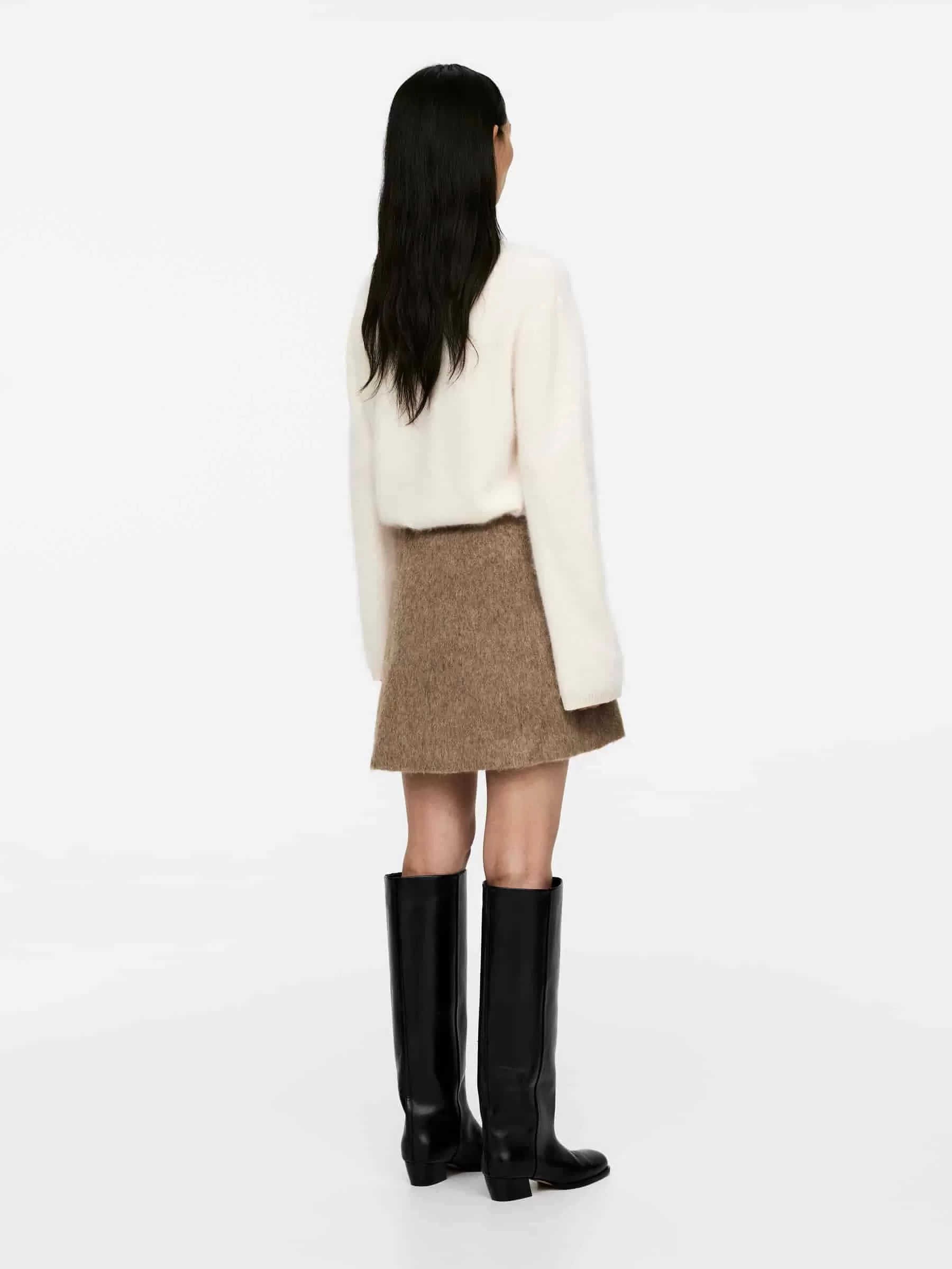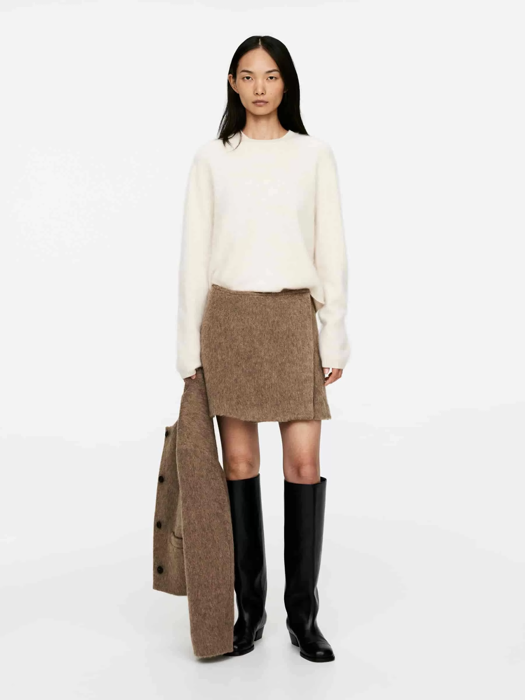 Falda corta cruzada confeccionada en mezcla de lana con superficie peluda. Cierre de botón en costura lateral y botón oculto en el borde cruzado. Totalmente forrado.
