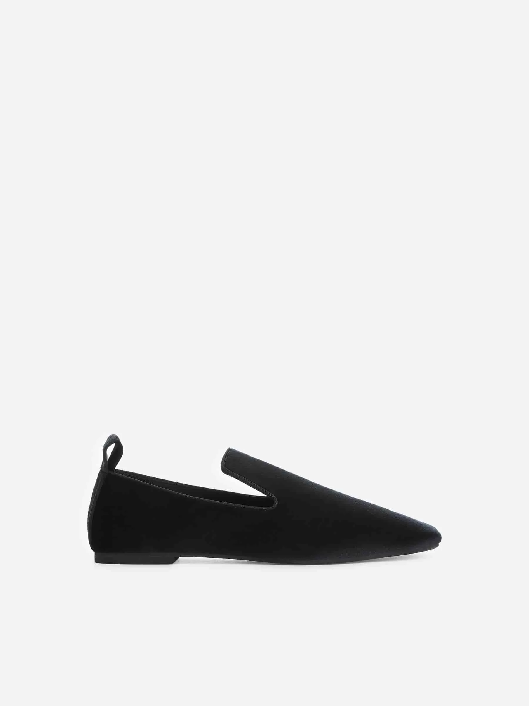 Mocasines de interior confeccionados en terciopelo suave. Diseñado con puntera cuadrada, tirador trasero y ribete decorativo alrededor de la parte superior.