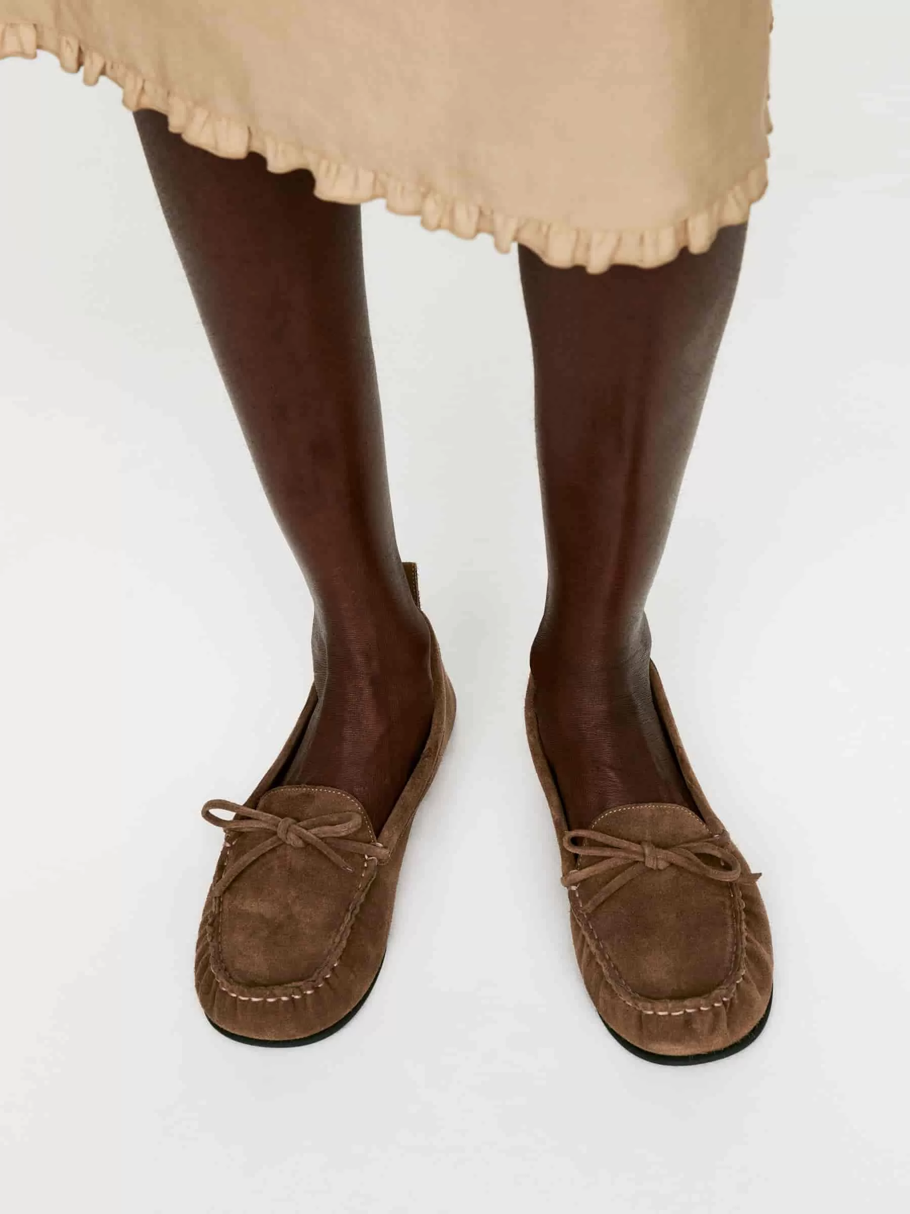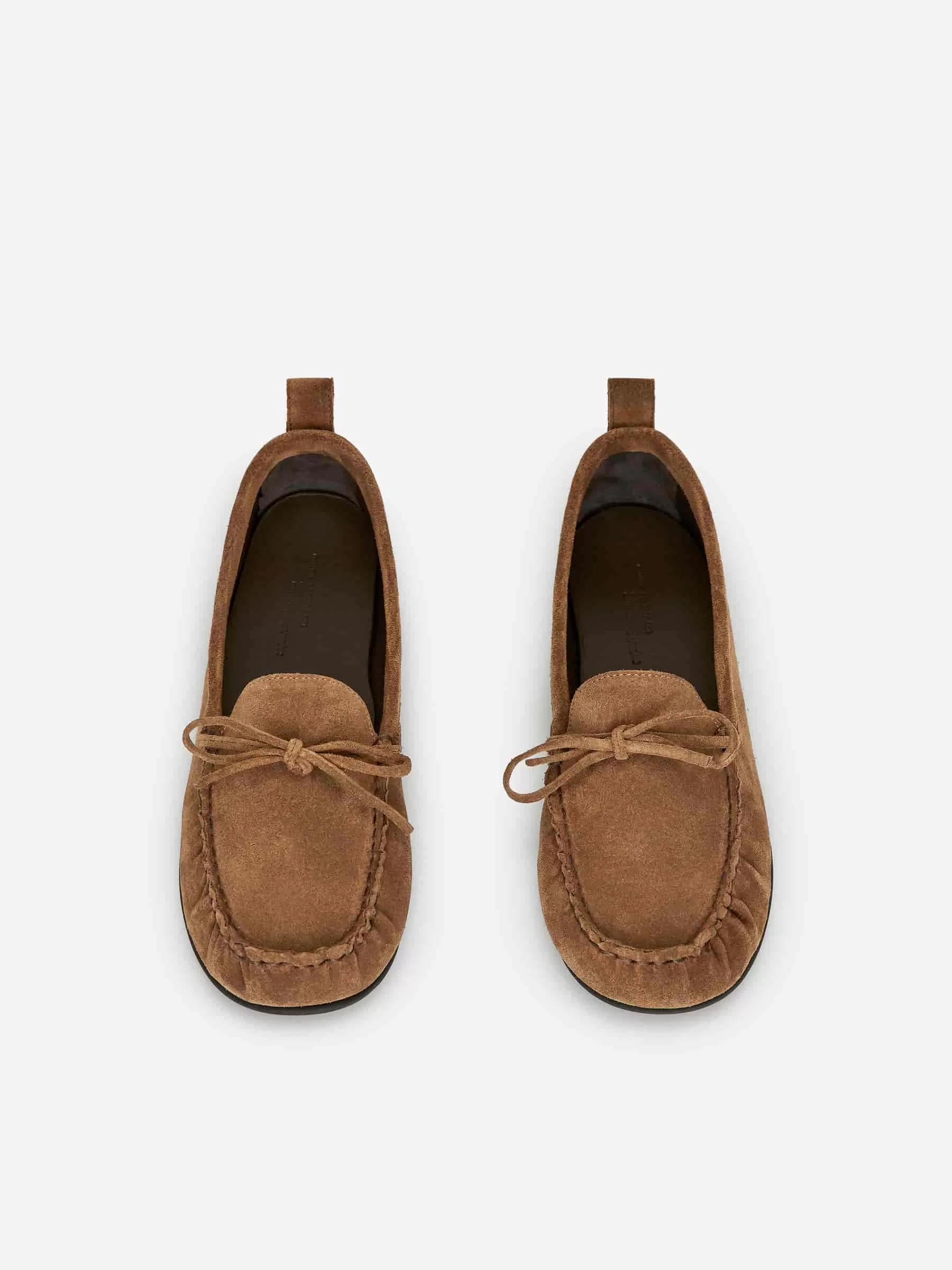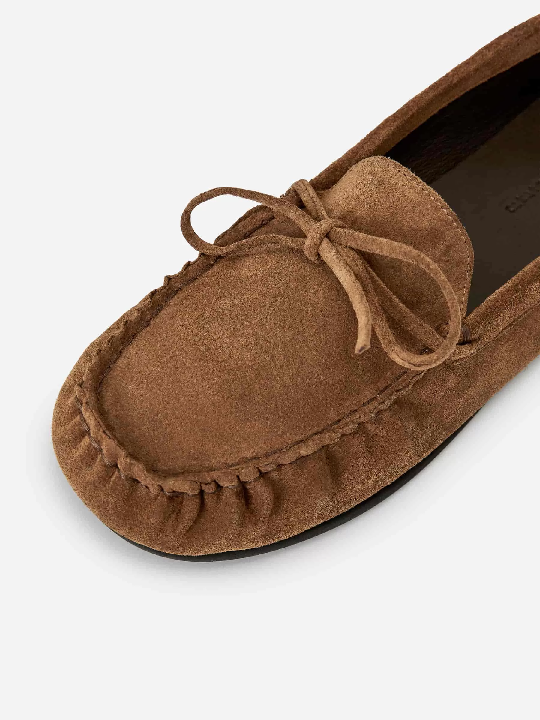 Mocasín tipo mocasín de ante. Detalle de costura superior decorativa, suela plana y cierre con lazo.