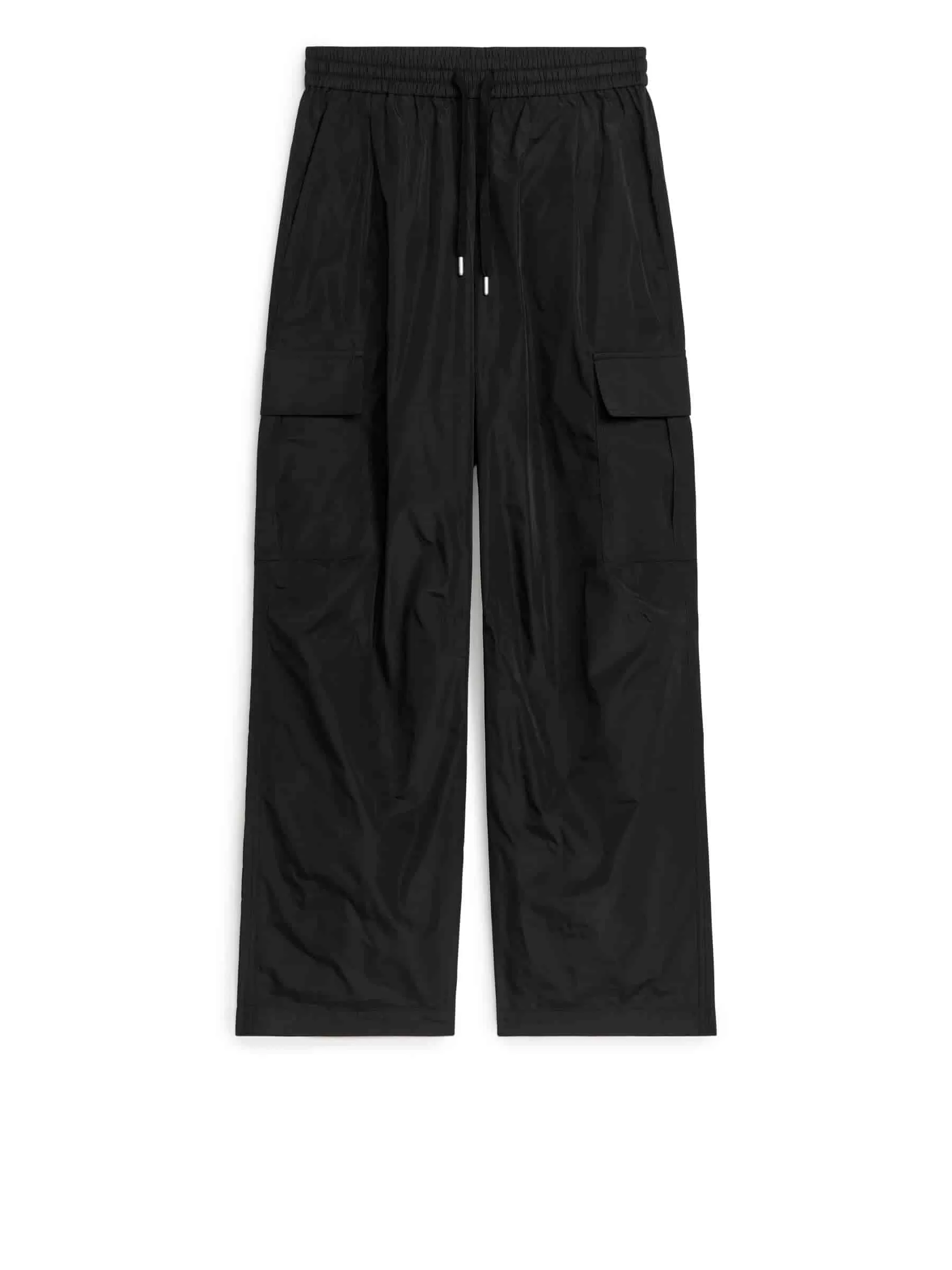 Pantalones de inspiración cargo confeccionados con tafetán técnico brillante. Cintura elástica con cordón, bolsillos delanteros franceses y bolsillos con solapa en perneras.