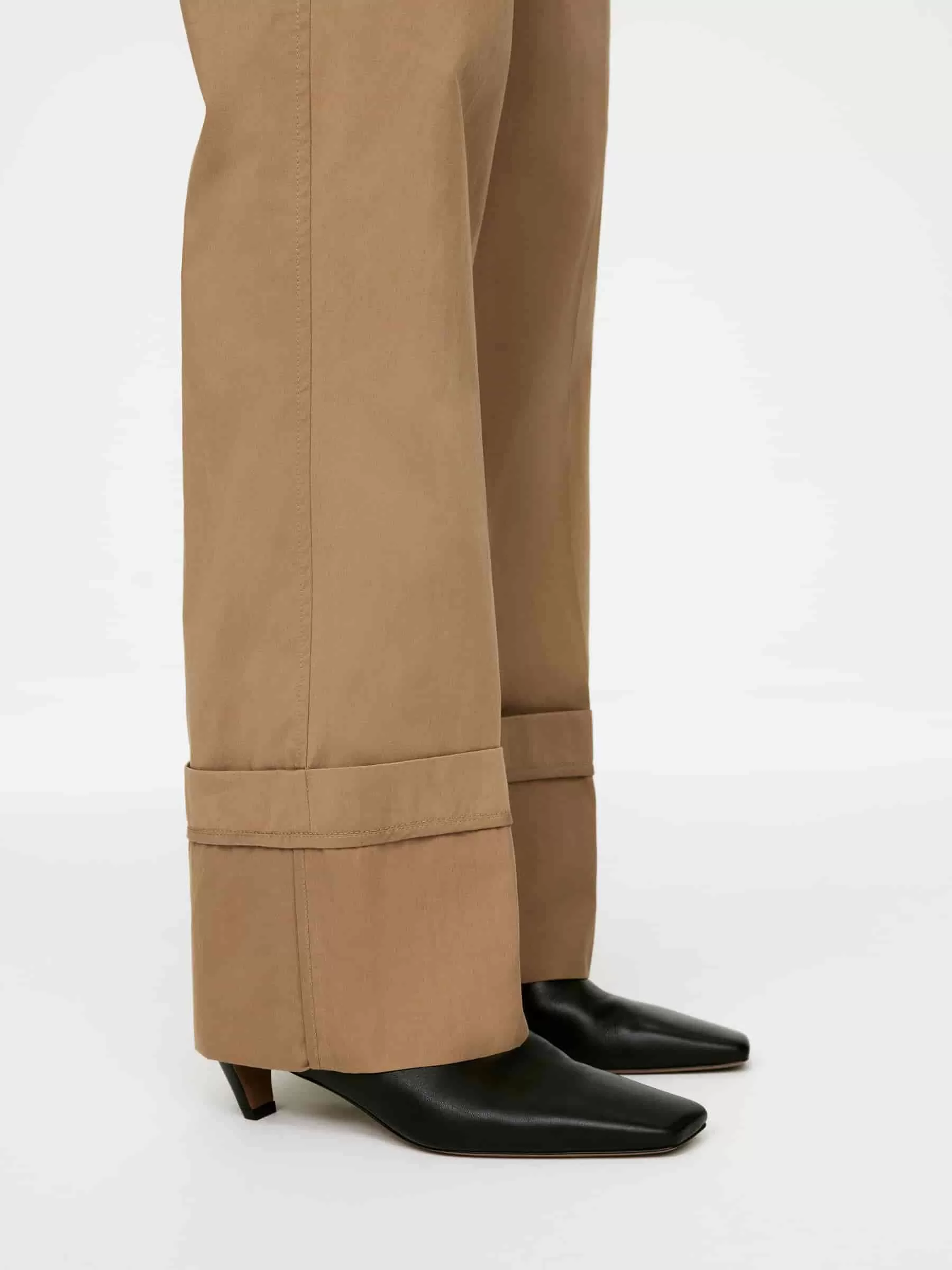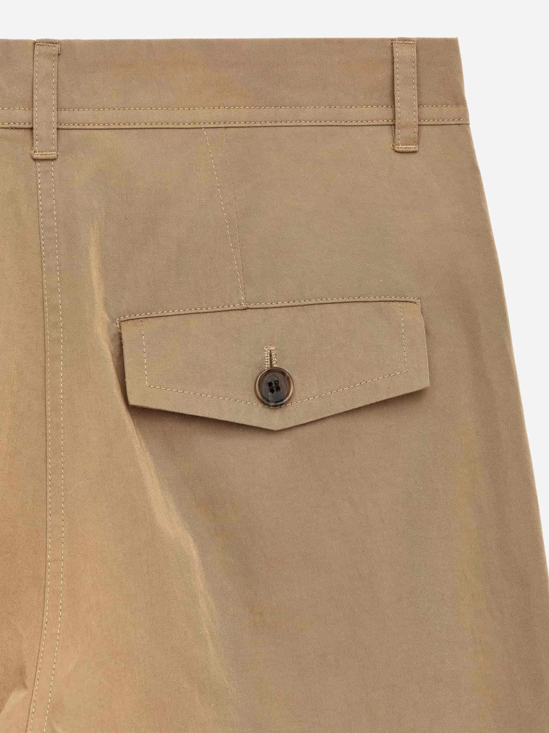 Pantalón holgado con raya a presión en la parte delantera y trasera y detalle de pliegue en el dobladillo inferior. Bragueta con cremallera y cierre de botón, bolsillos laterales inclinados y bolsillos con solapa y cierre de botón en la parte trasera.