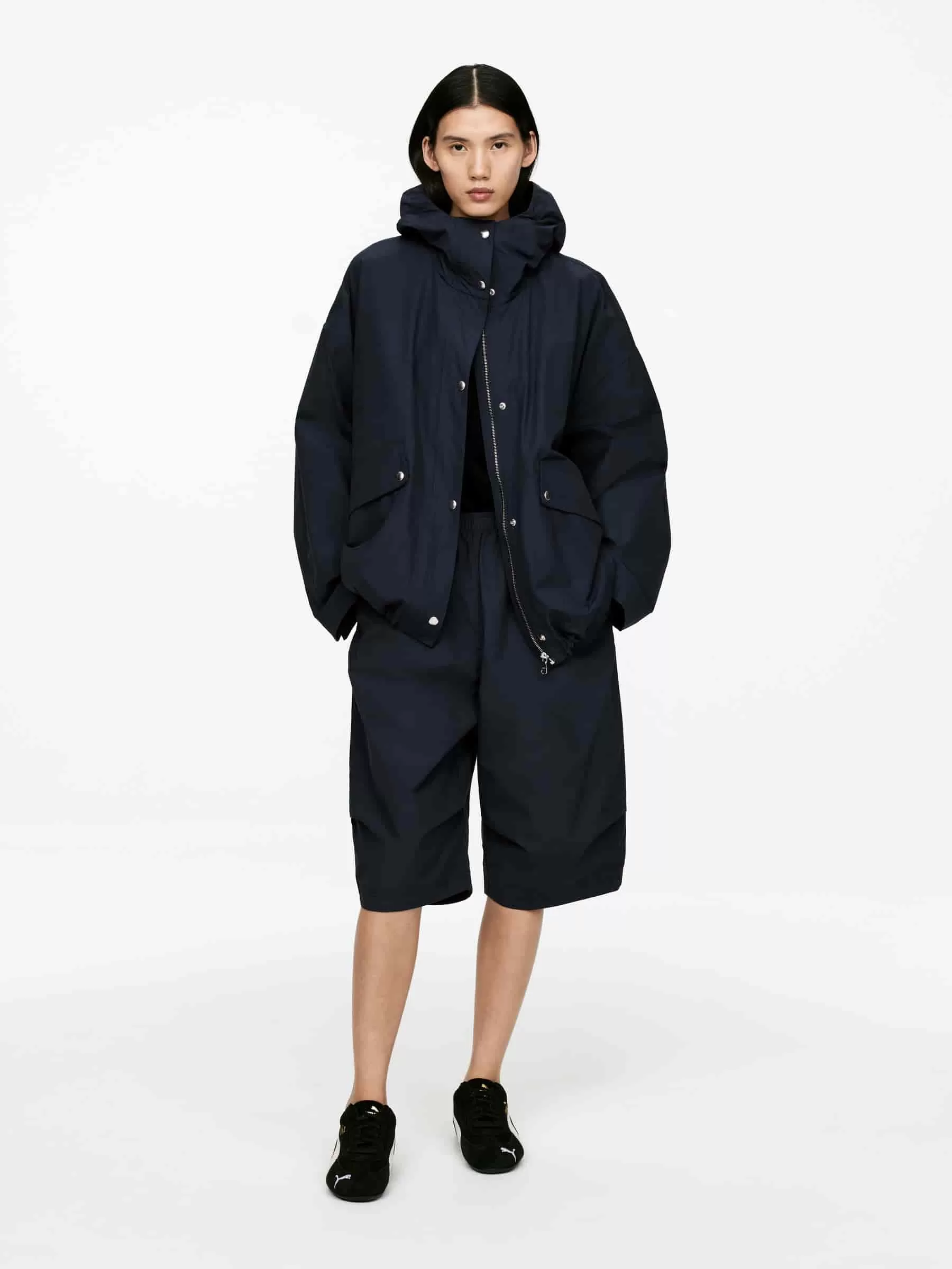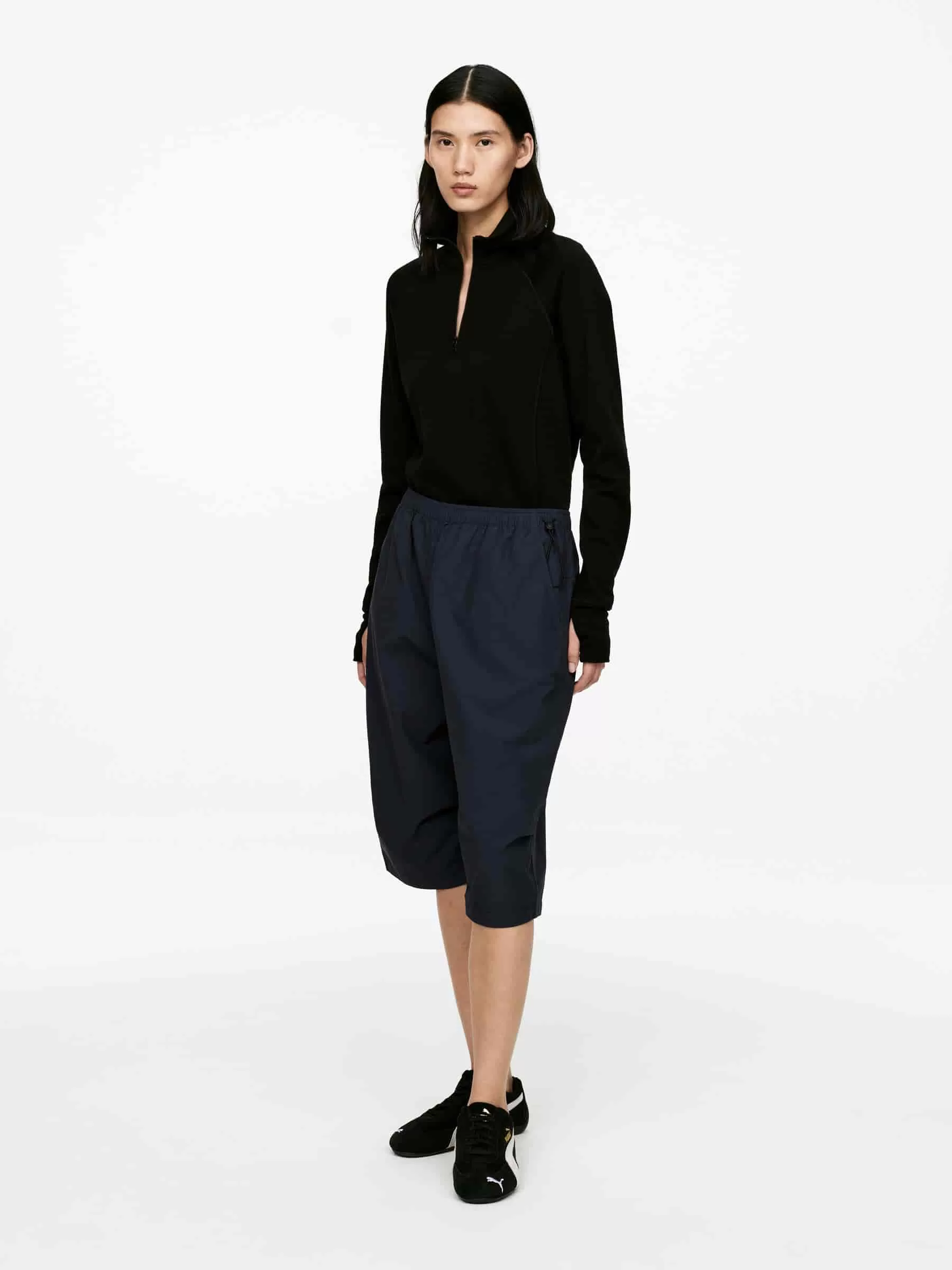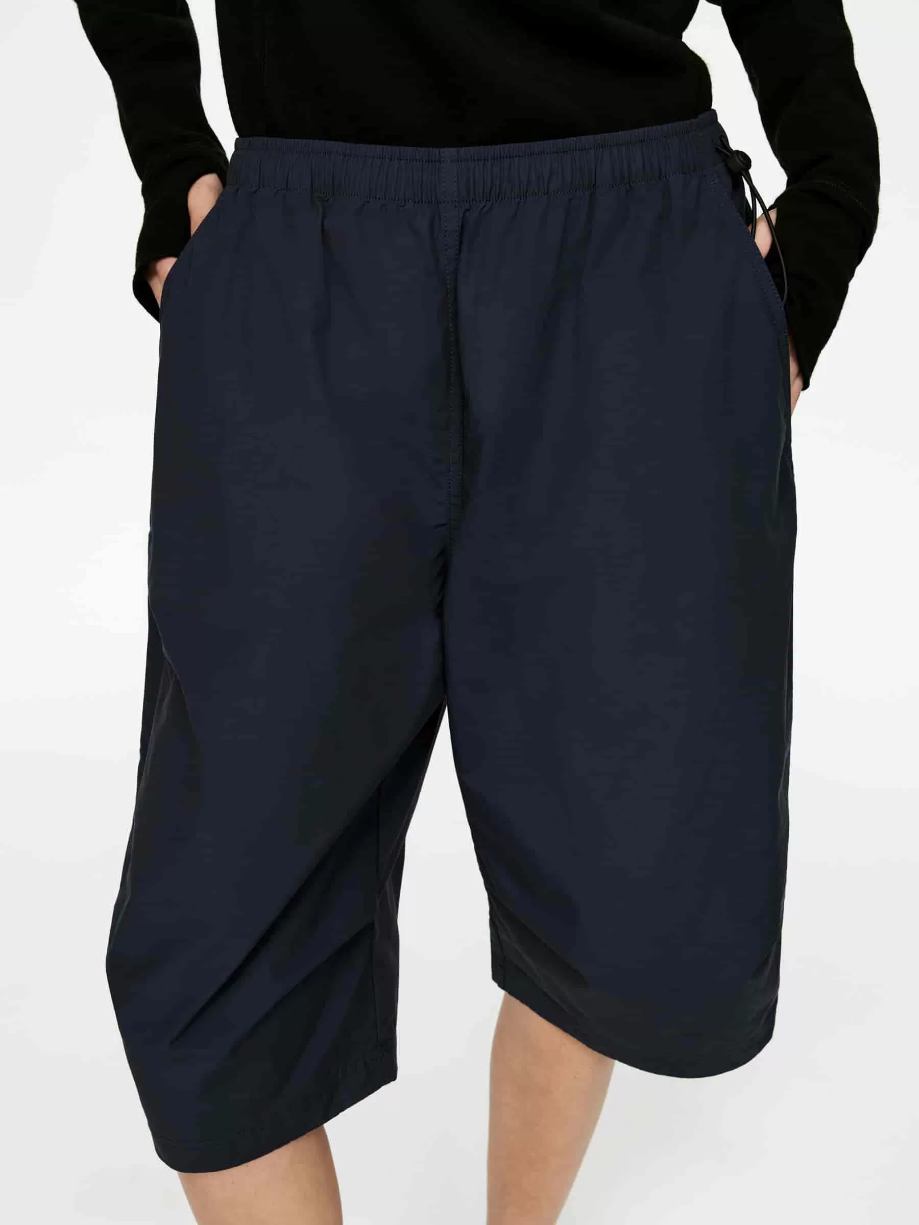 Shorts holgados confeccionados con un tejido de mezcla de algodón. Detallado con elásticos en la cintura con palanca en el lateral y bolsillos laterales.