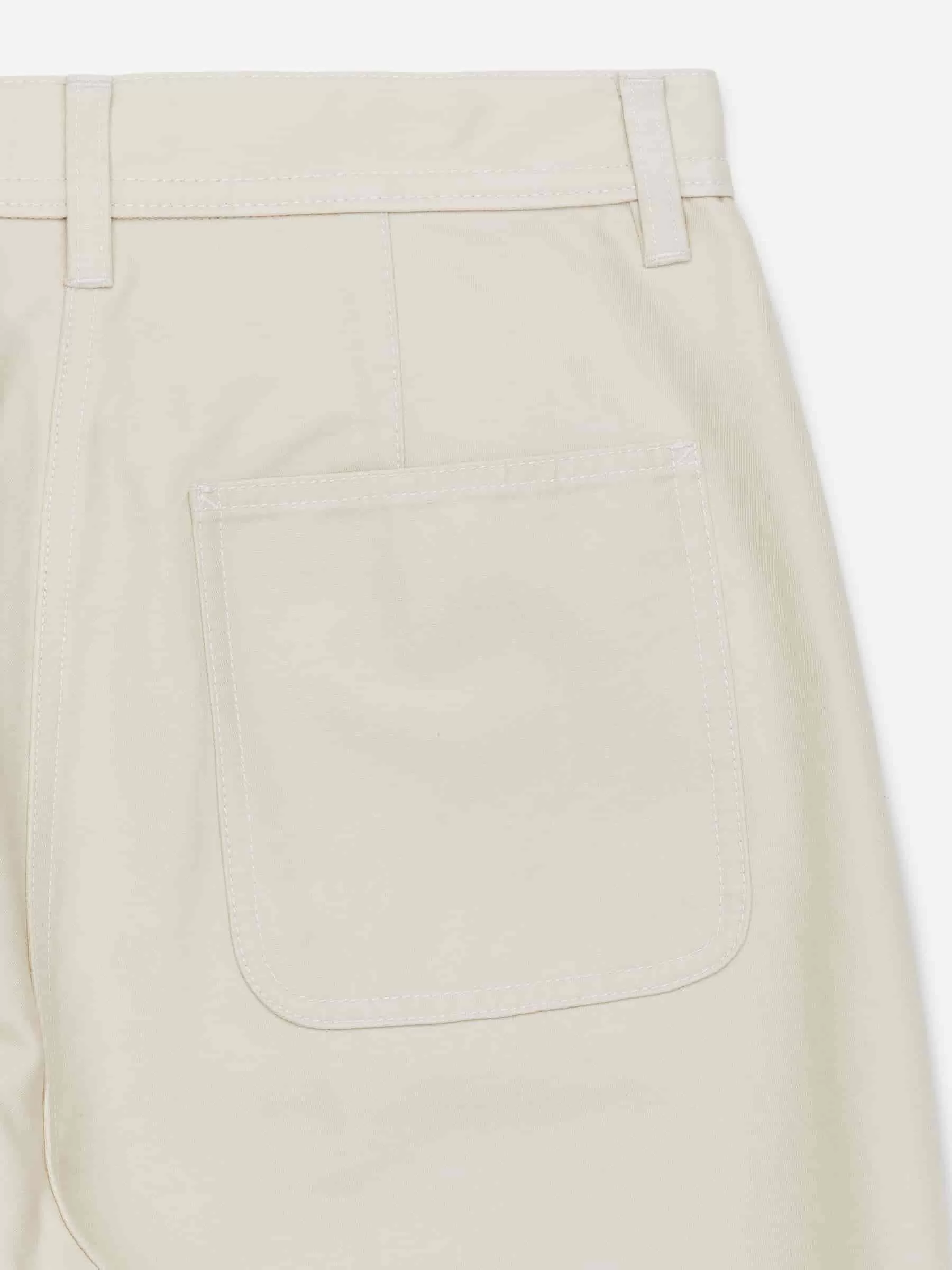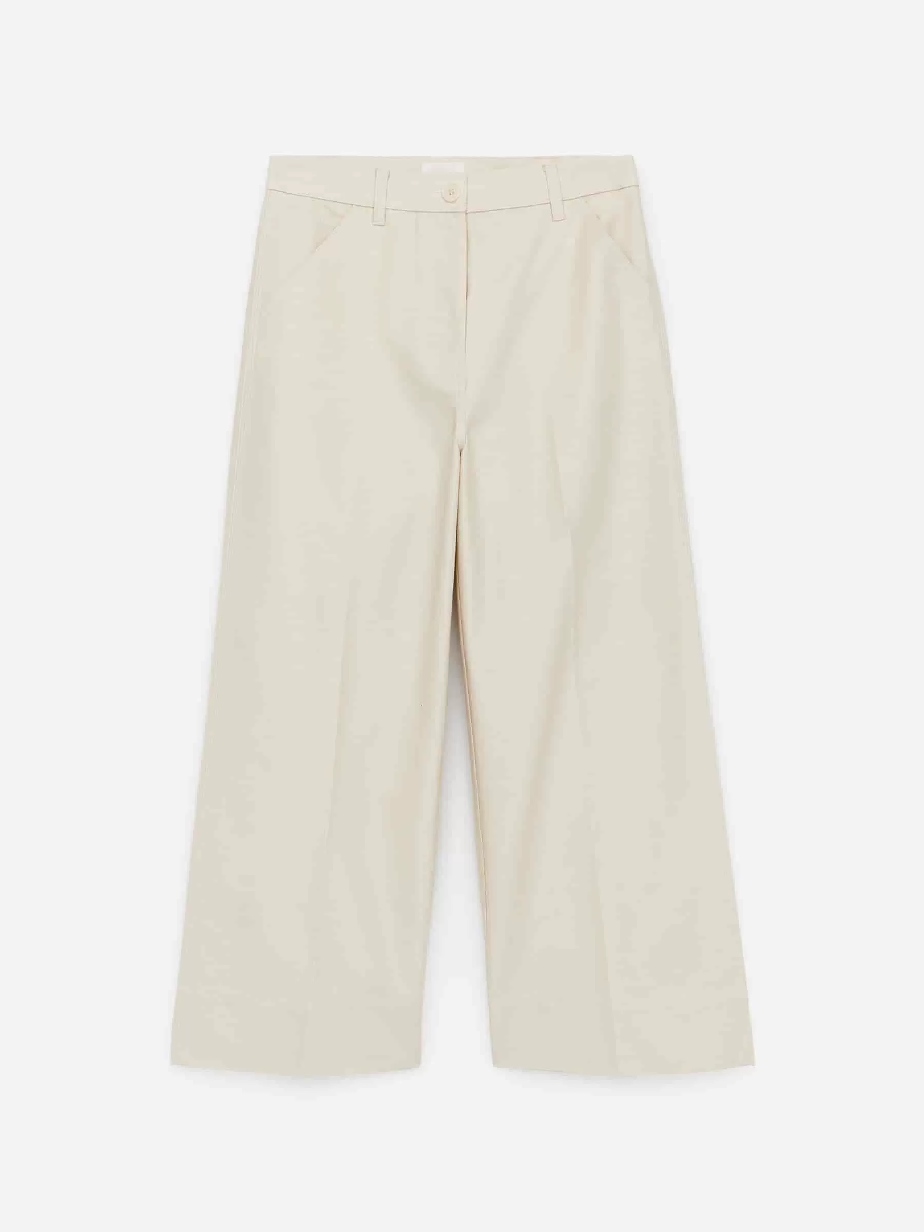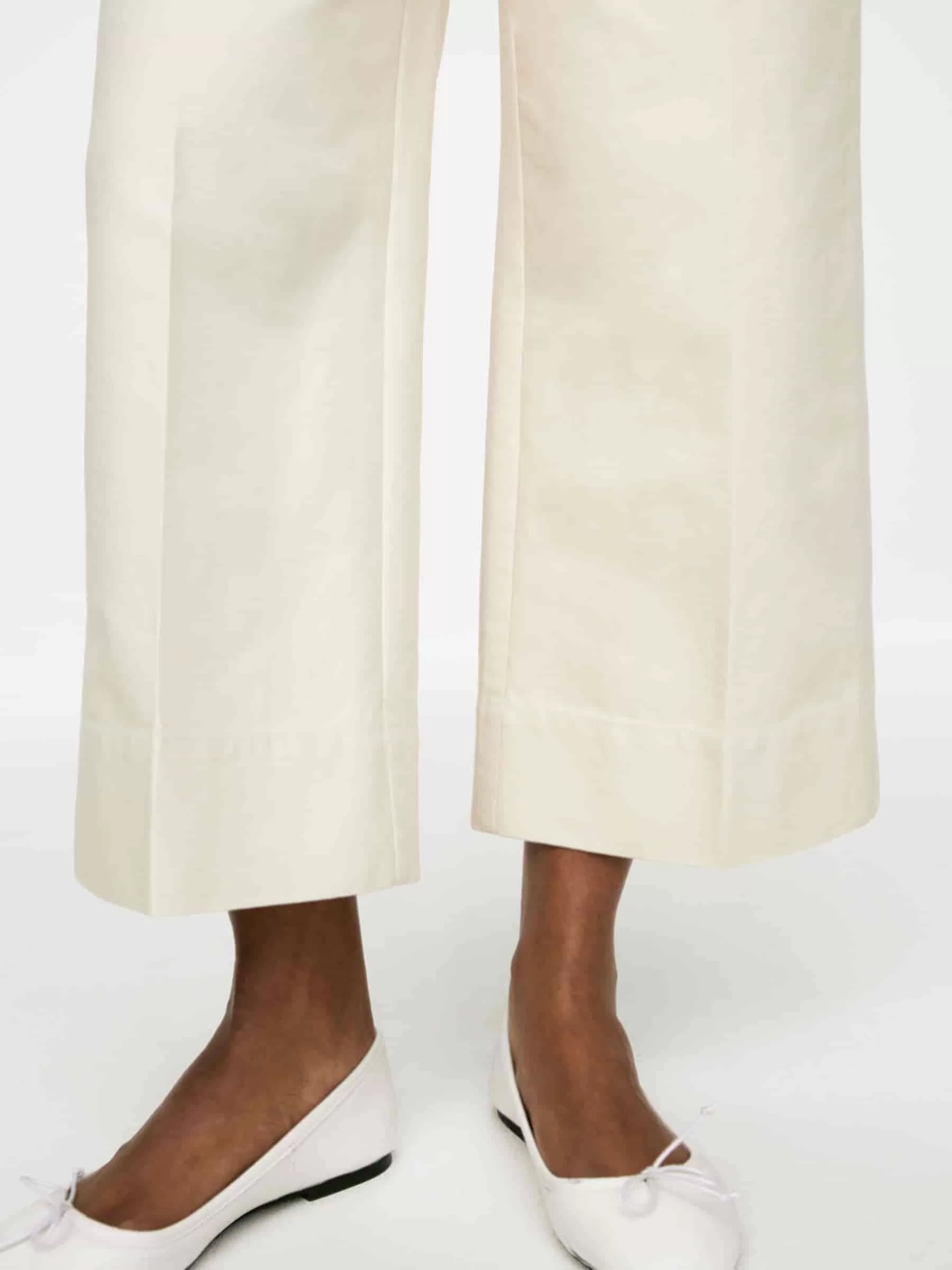 Pantalón confeccionado en tejido de algodón con tacto texturizado. Con cintura estándar y perneras anchas recortadas hasta el tobillo. Bolsillos franceses delante y bolsillos de parche detrás. Trabillas para cinturón.