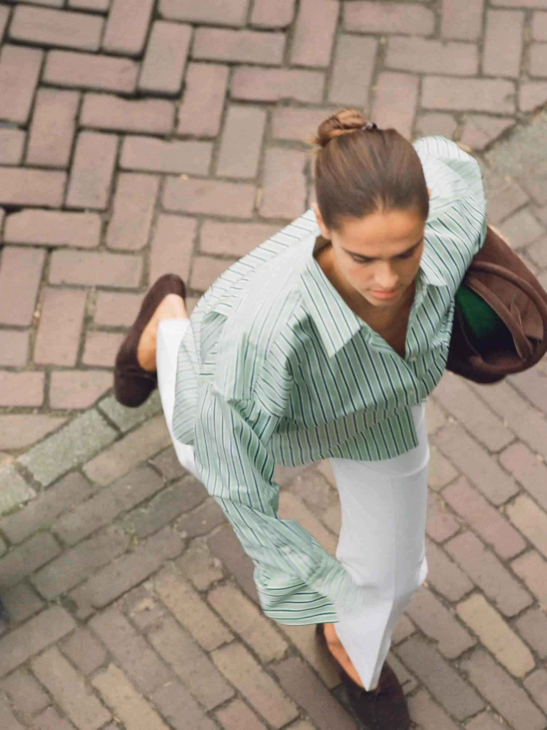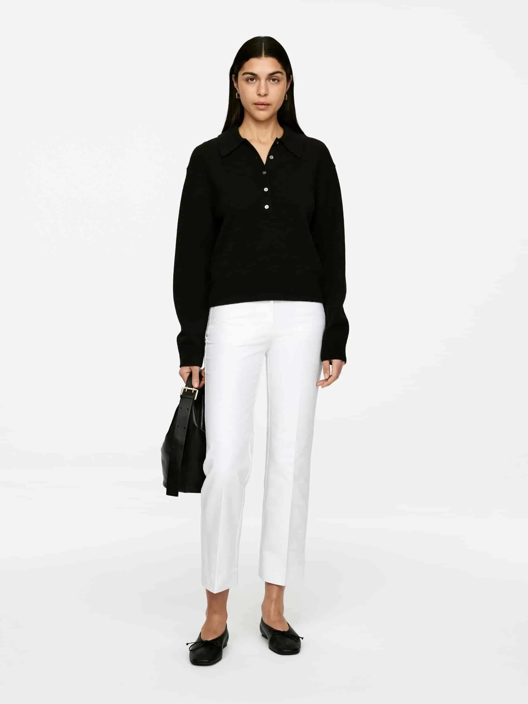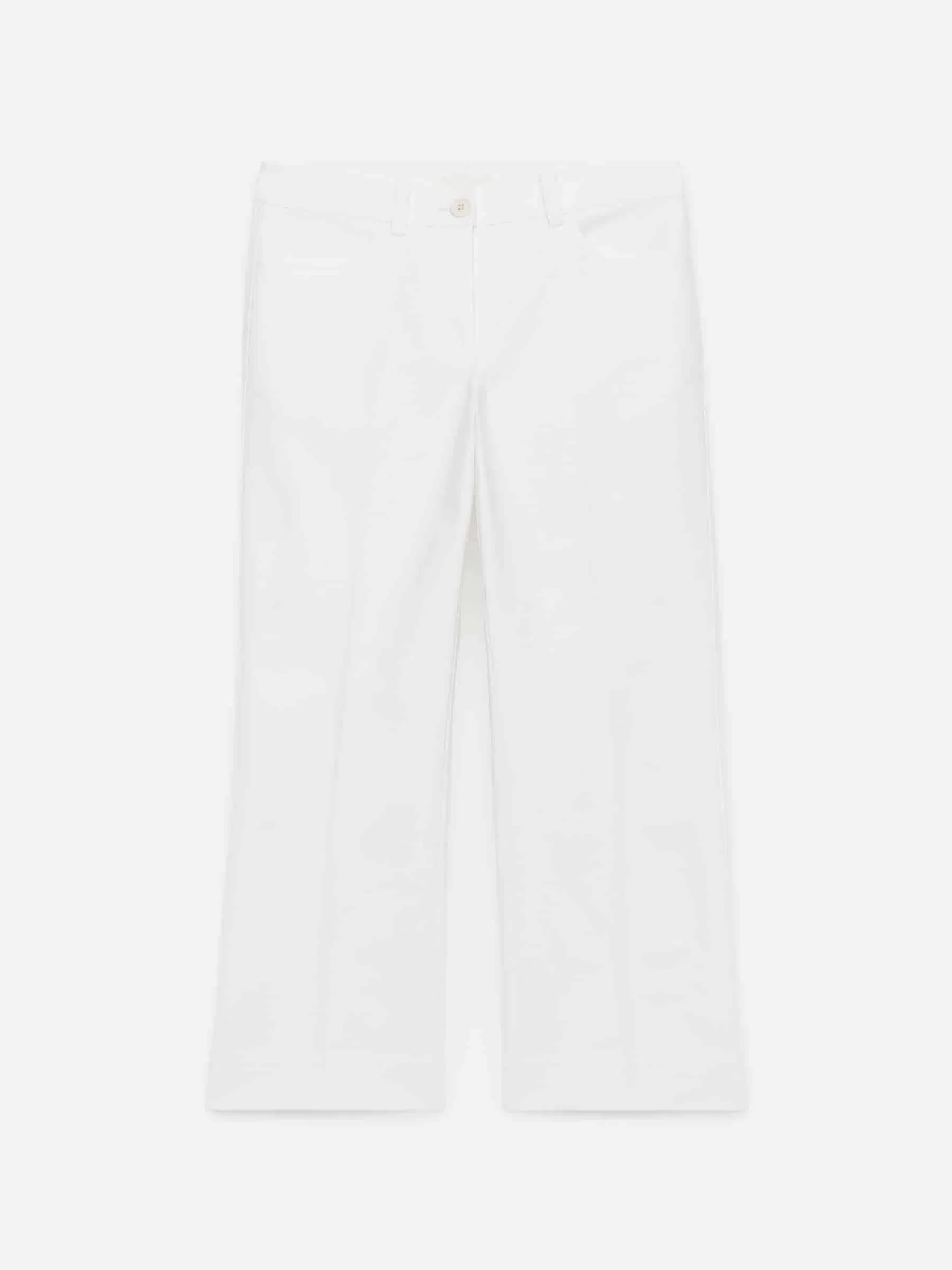 Pantalón entallado con raya planchada en la parte delantera. Diseñado con cintura de tiro medio y perneras rectas. Cierre con cremallera y botón. Bolsillos delanteros y bolsillos de ribete con cierre de botón en la parte trasera.