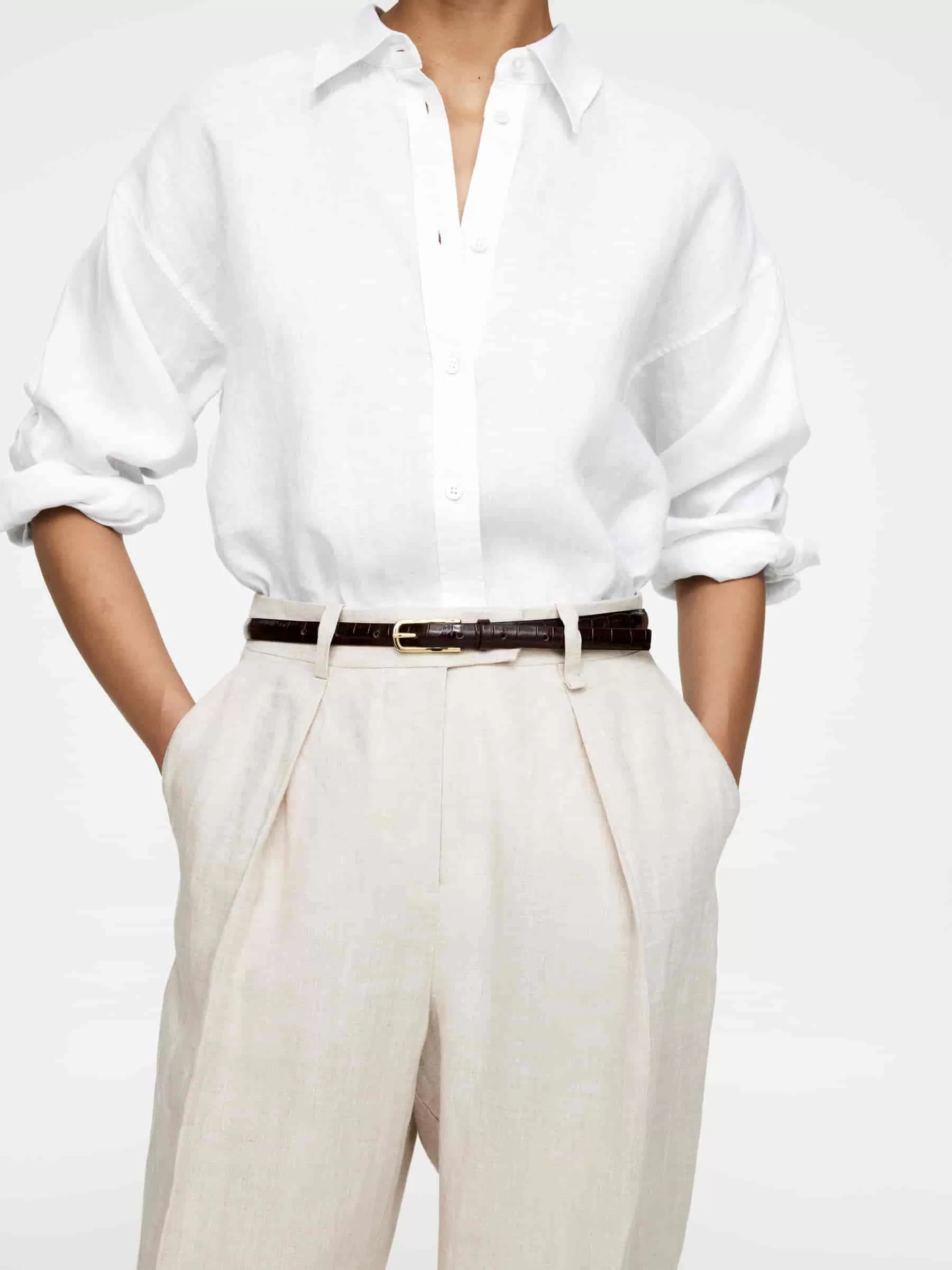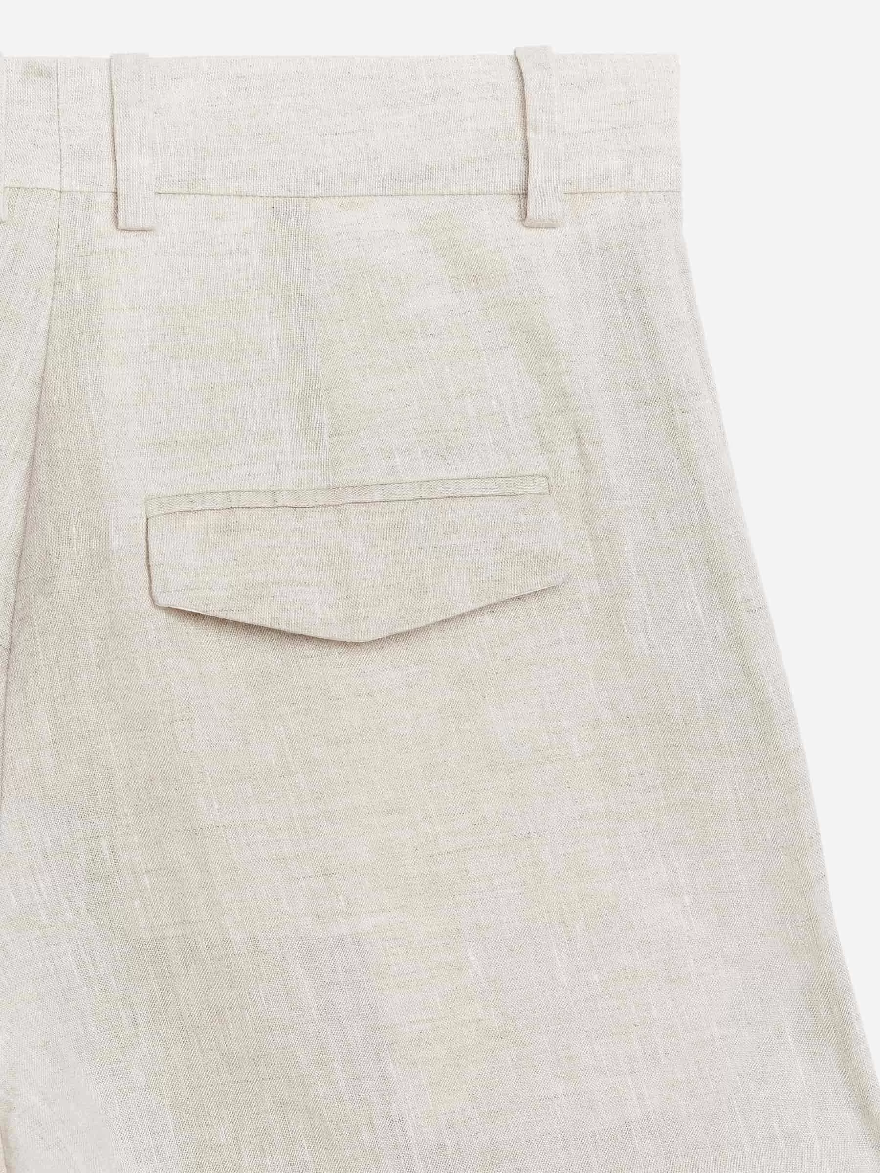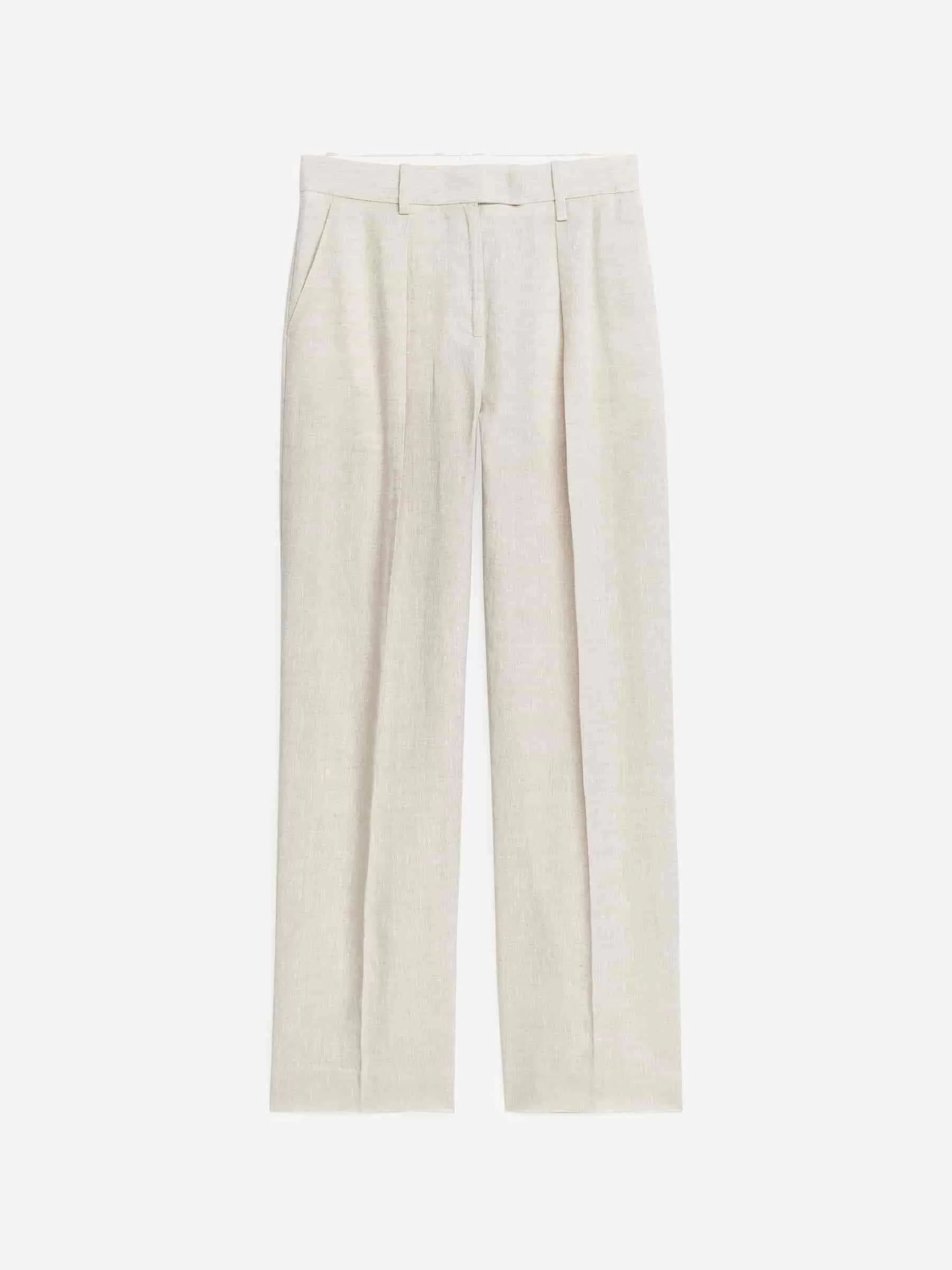 Estos pantalones largos de cintura media están tejidos de lino puro. Un corte recto con pliegues y pliegues en la parte delantera, lo que le da al estilo una elegante caída.
