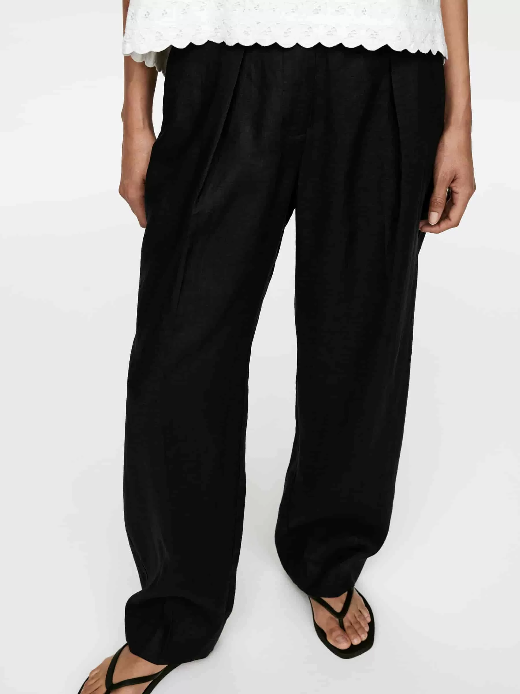 Estos pantalones largos de cintura media están tejidos de lino puro. Un corte recto con pliegues y pliegues en la parte delantera, lo que le da al estilo una elegante caída.