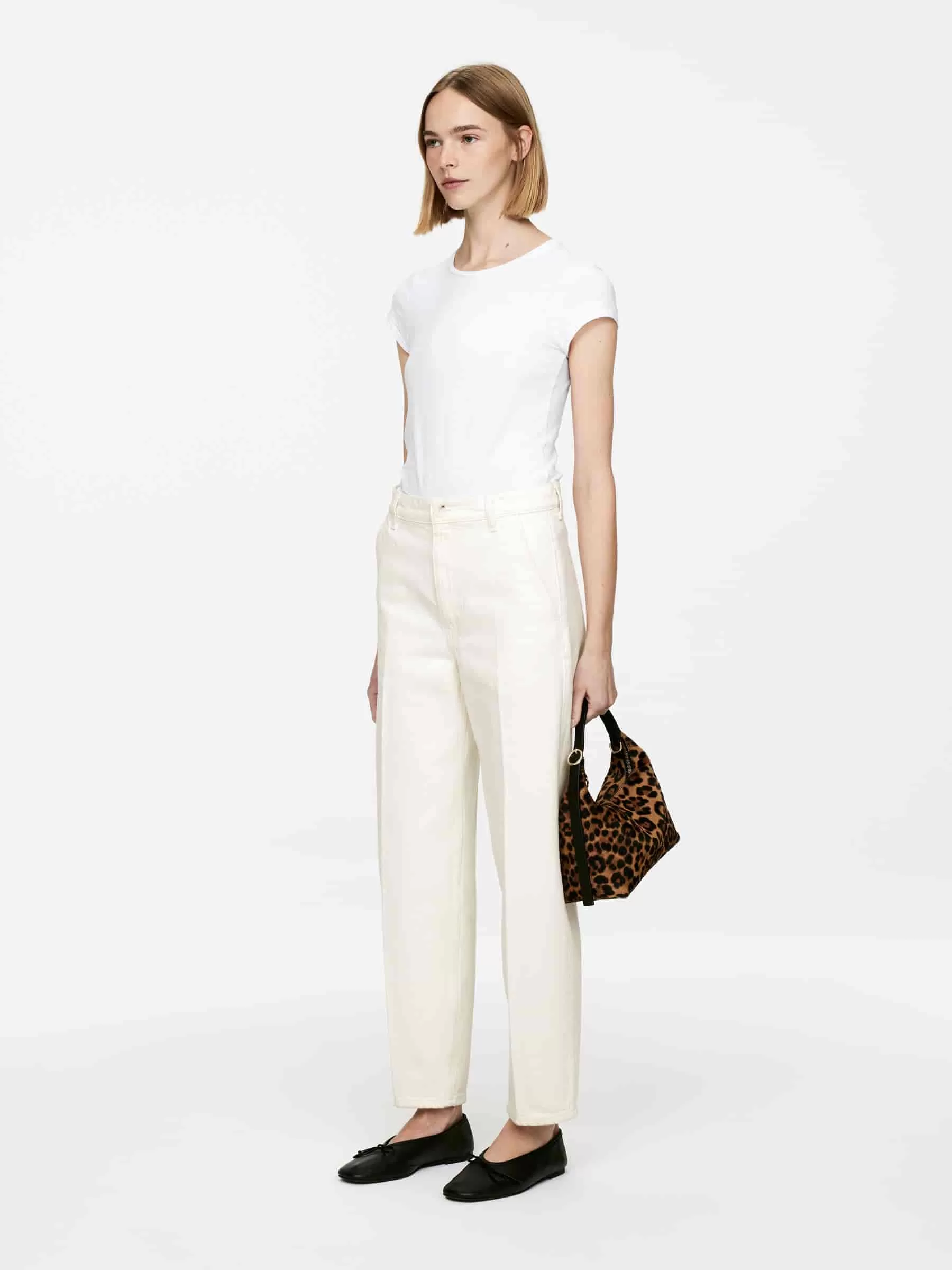 Pantalones vaqueros entallados con raya a presión en la parte delantera y trasera, bragueta con cremallera y cierre de botón y bolsillos laterales inclinados. Corte para caer hasta el tobillo.